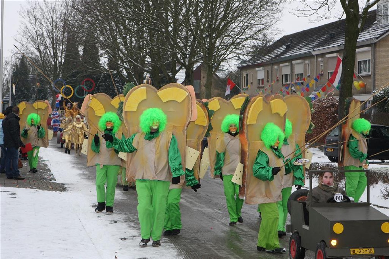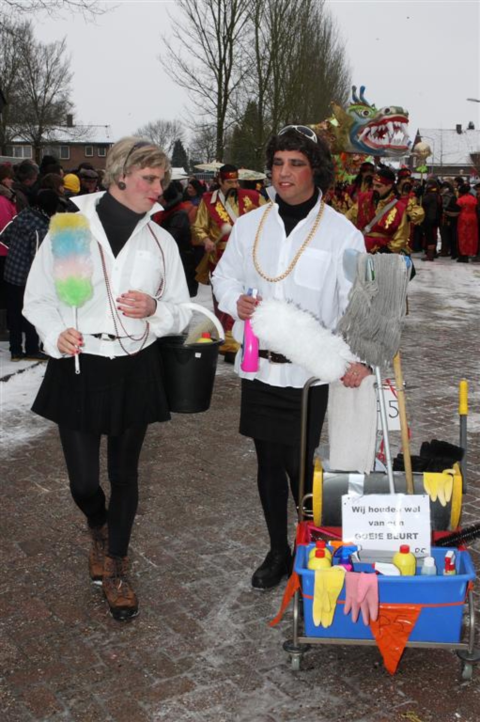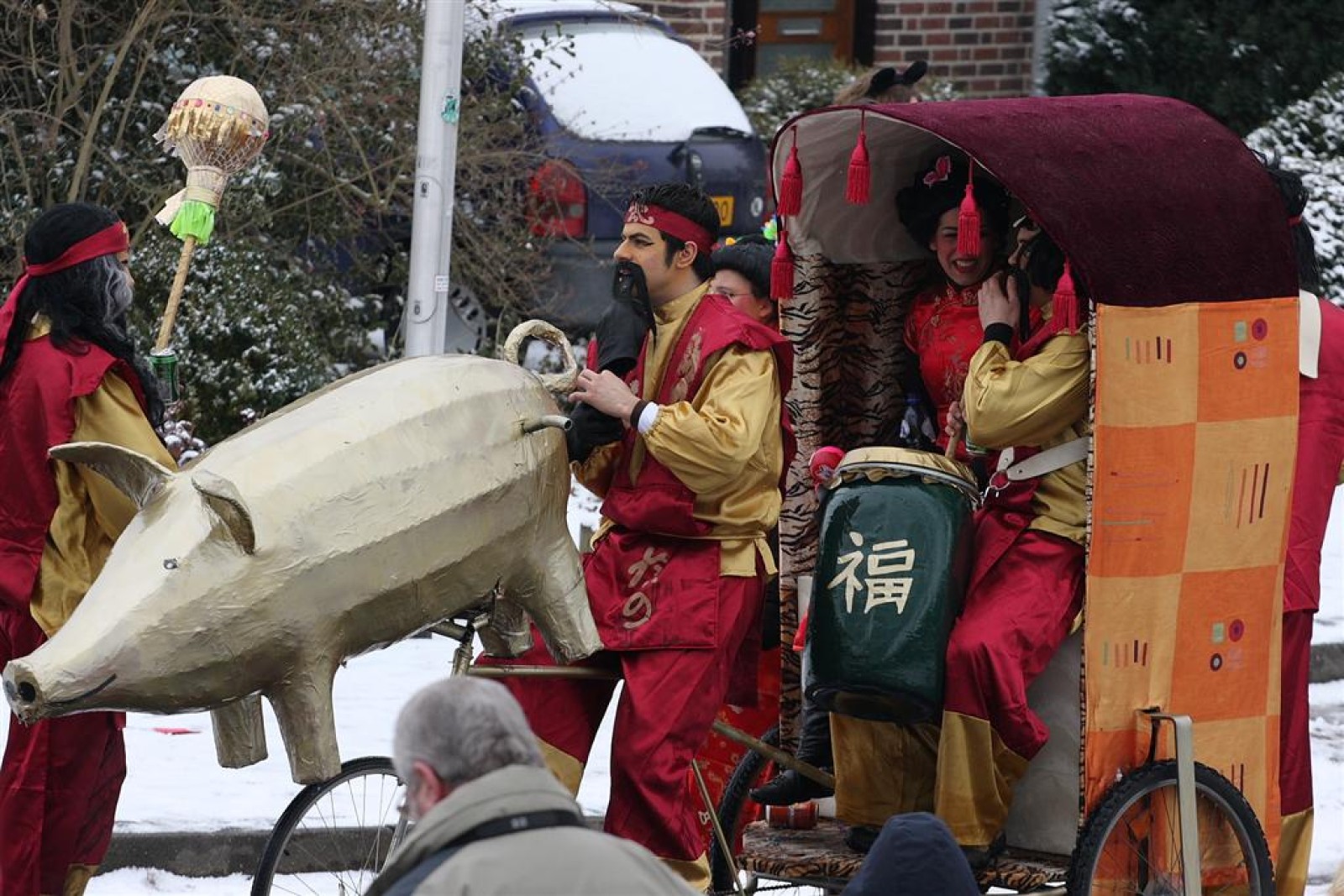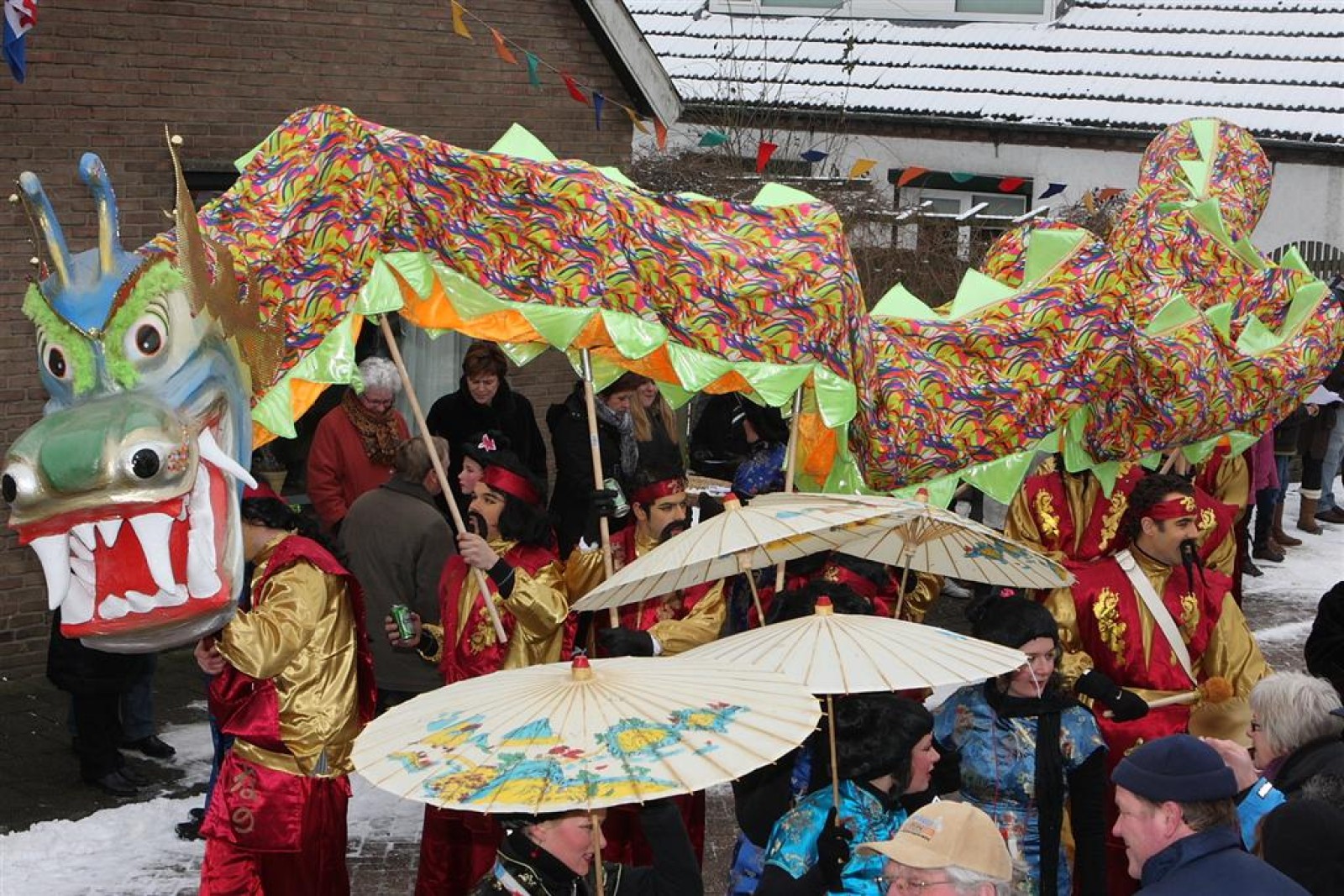 Met een enorme draak en tijger vierden de Feestneuzen het begin van het Chinees Nieuwjaar. De Struukduukers refereerden nog even naar het vakantiehuisje van WimLex en Maxima voorafgegaan door een enorme neushoorn.