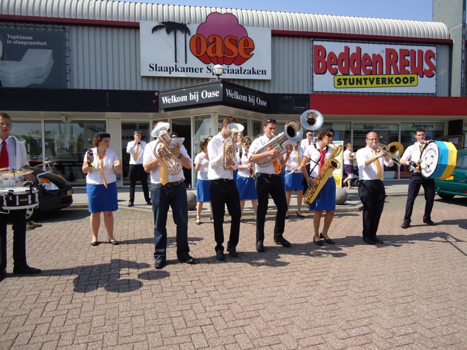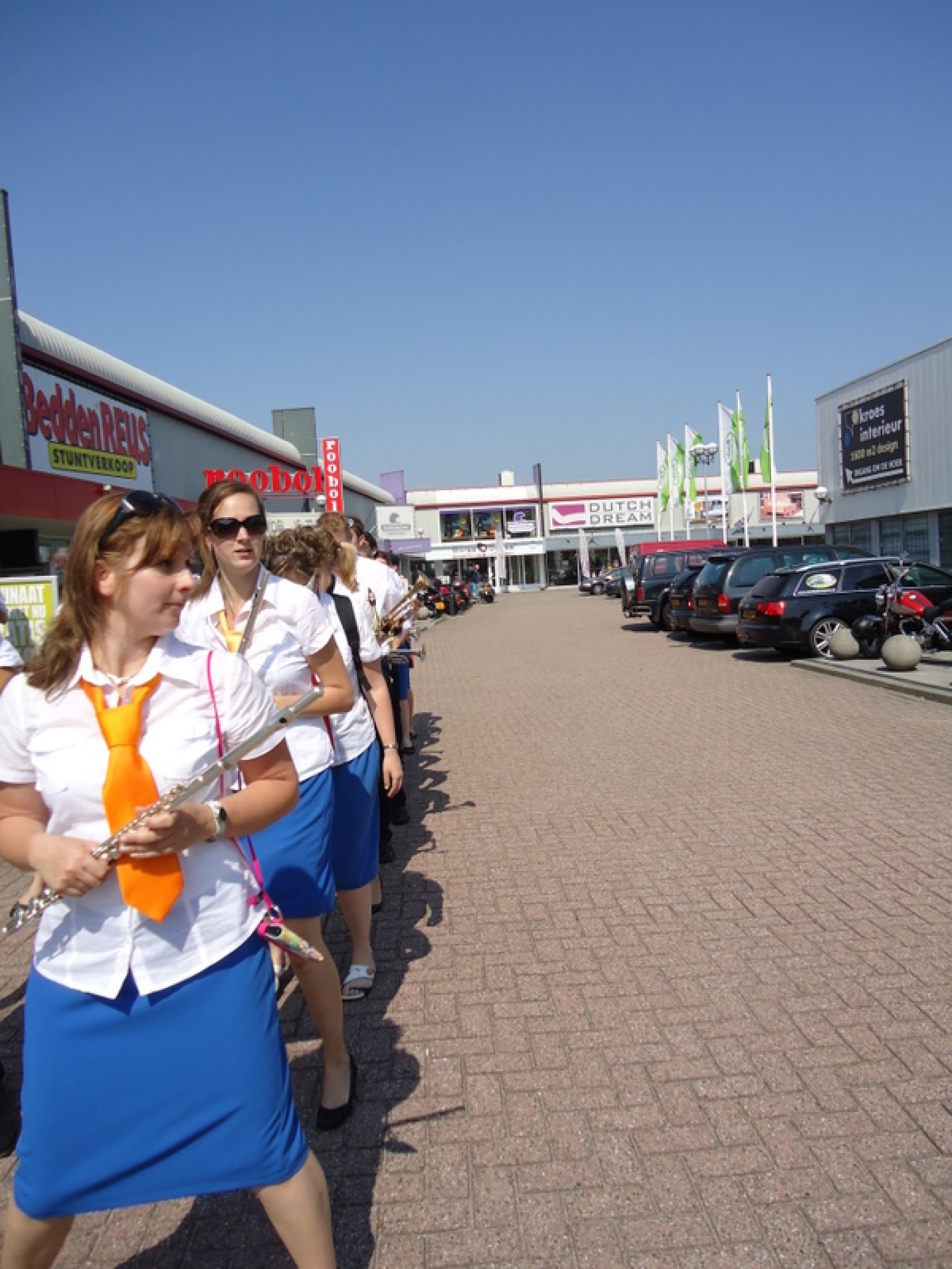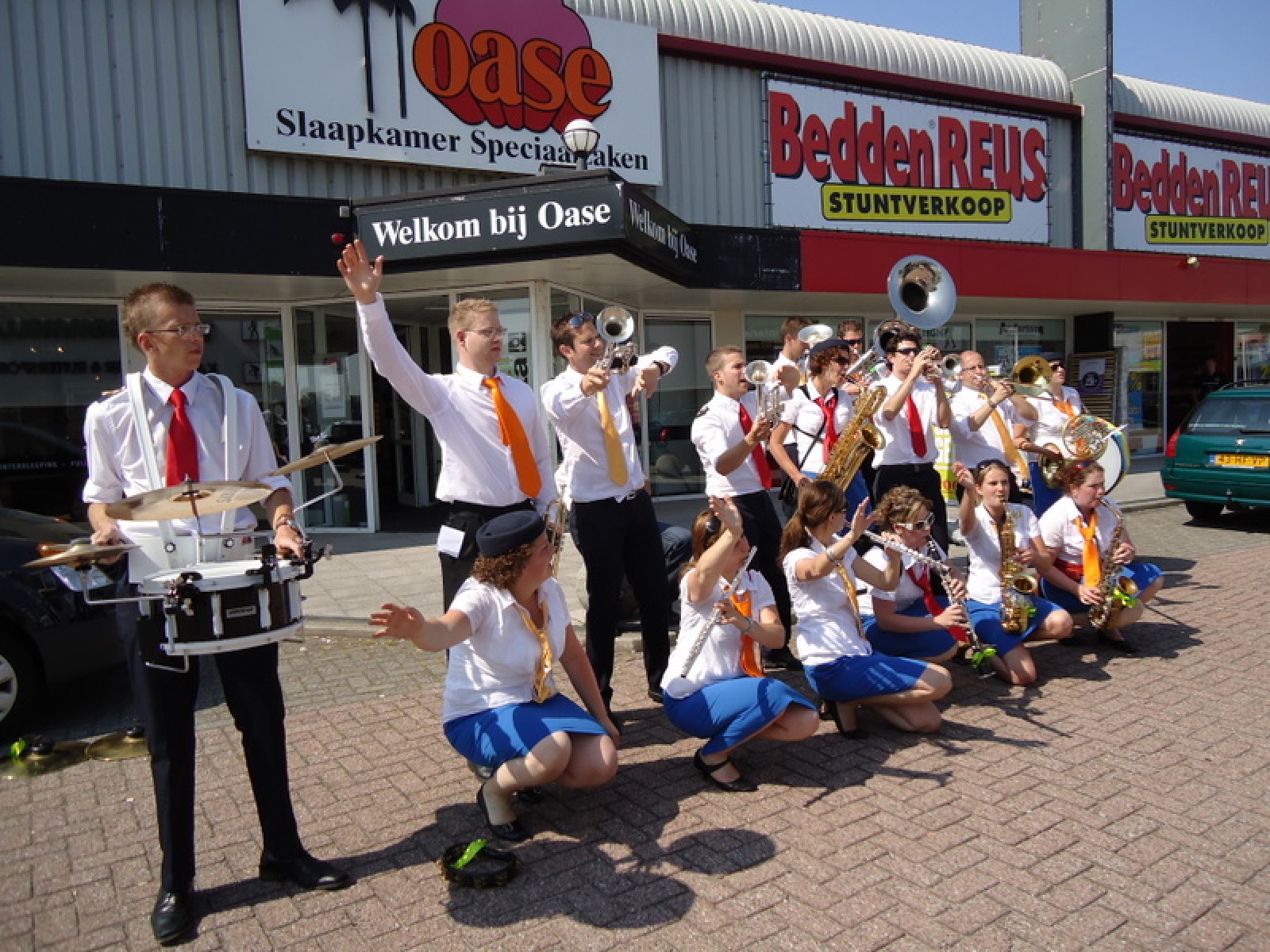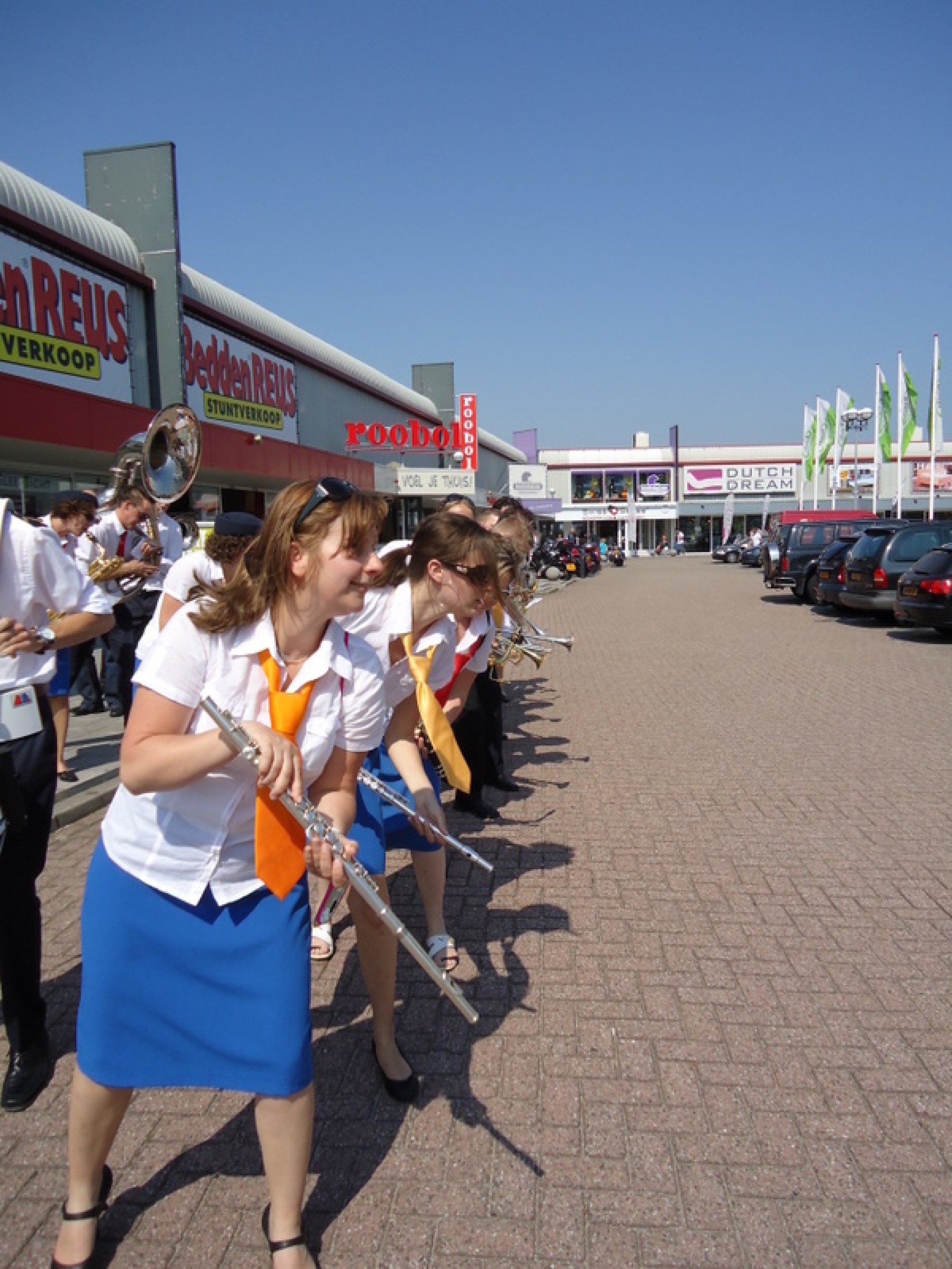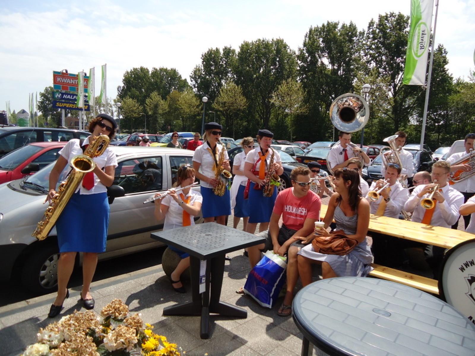 Op iedere hoek van de boulevard – waar we even geen inparkerende auto’s in de weg stonden – lekker een paar nummertjes gespeeld. Uiteraard de vliegshow, maar ook nummers uit onze nieuwe set. De catering was ook prima verzorgd en dat was maar goed ook, want na het spelen, springen en dansen in de brandende zon was een lekker pakje Wicky wel welkom.
