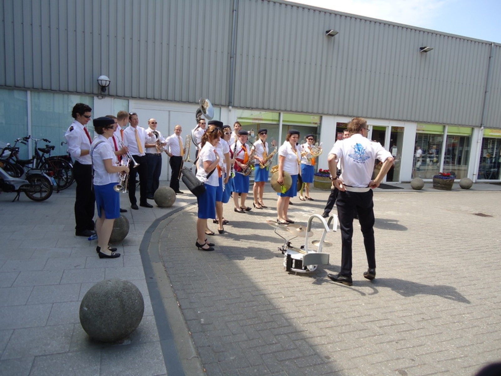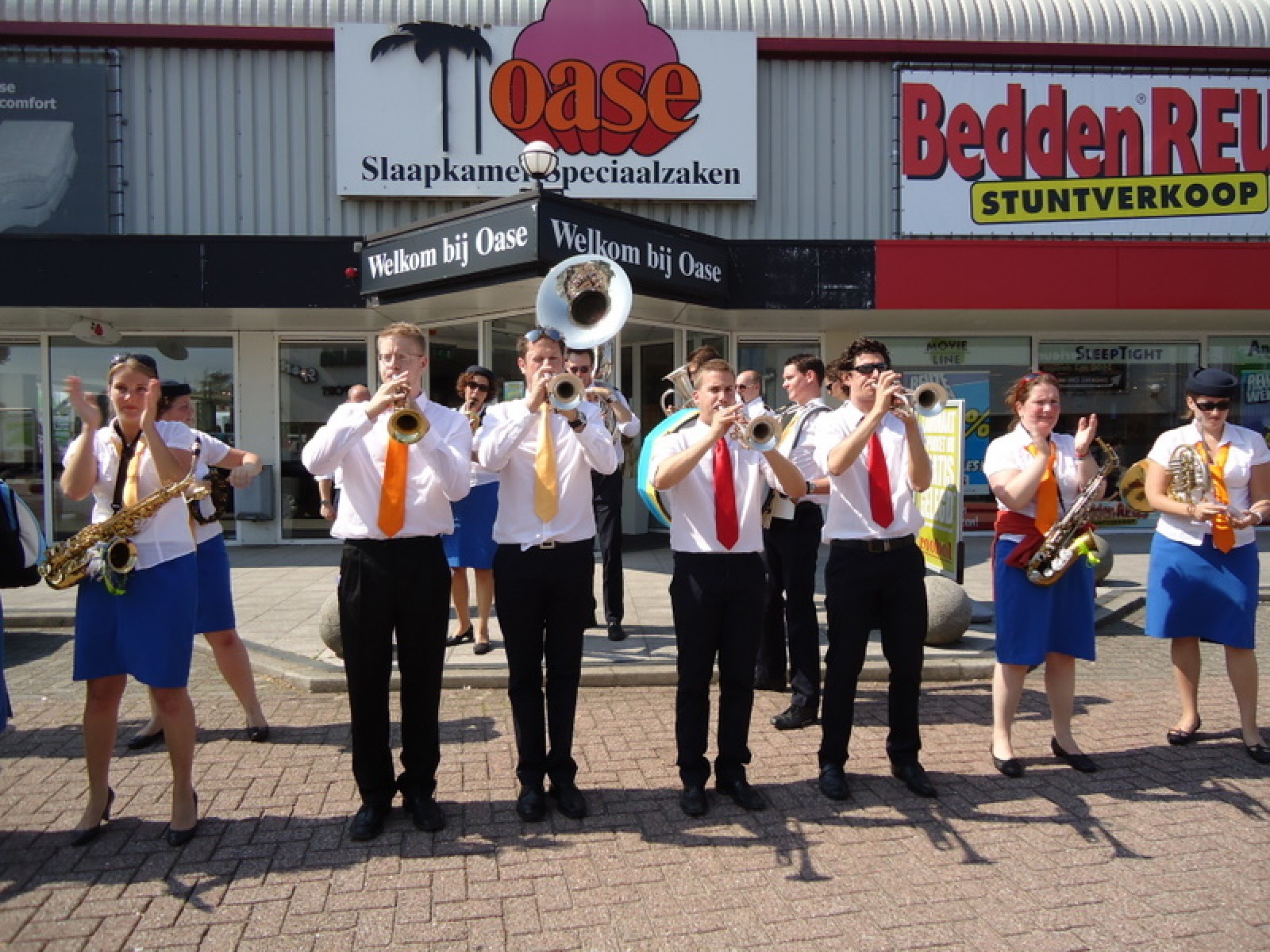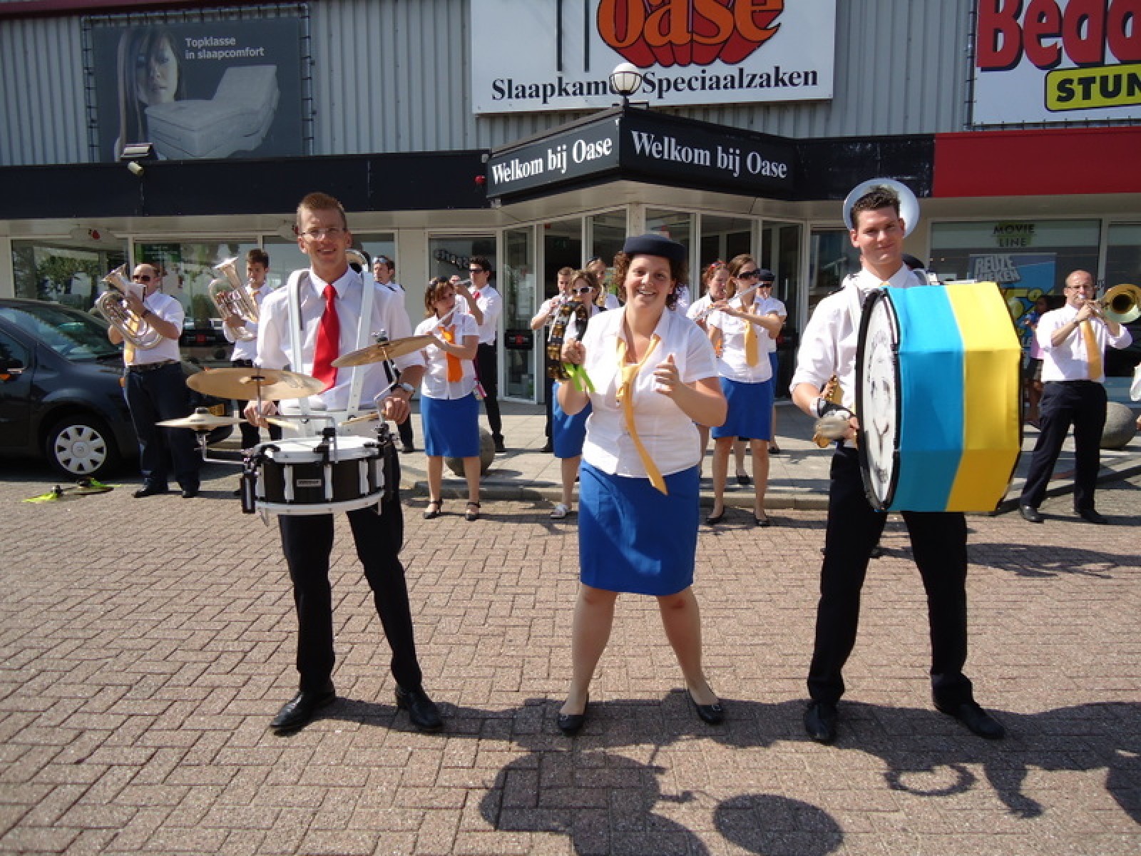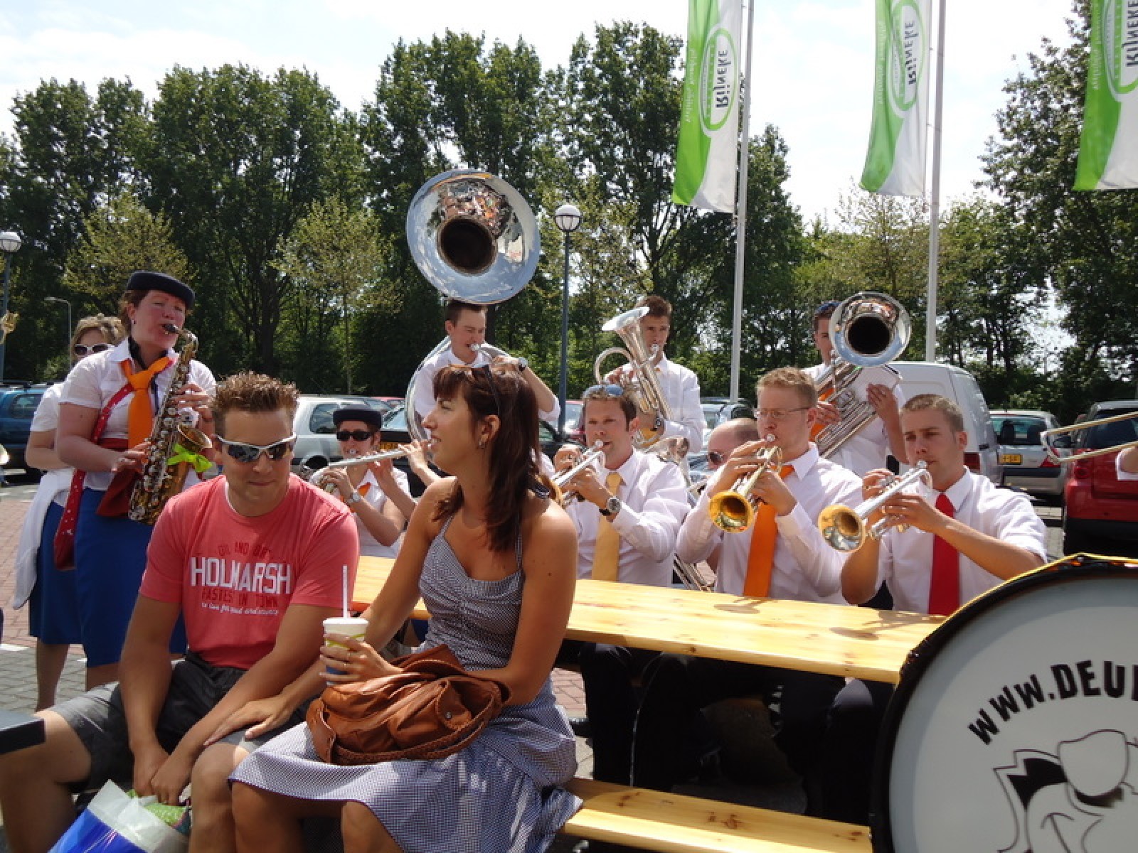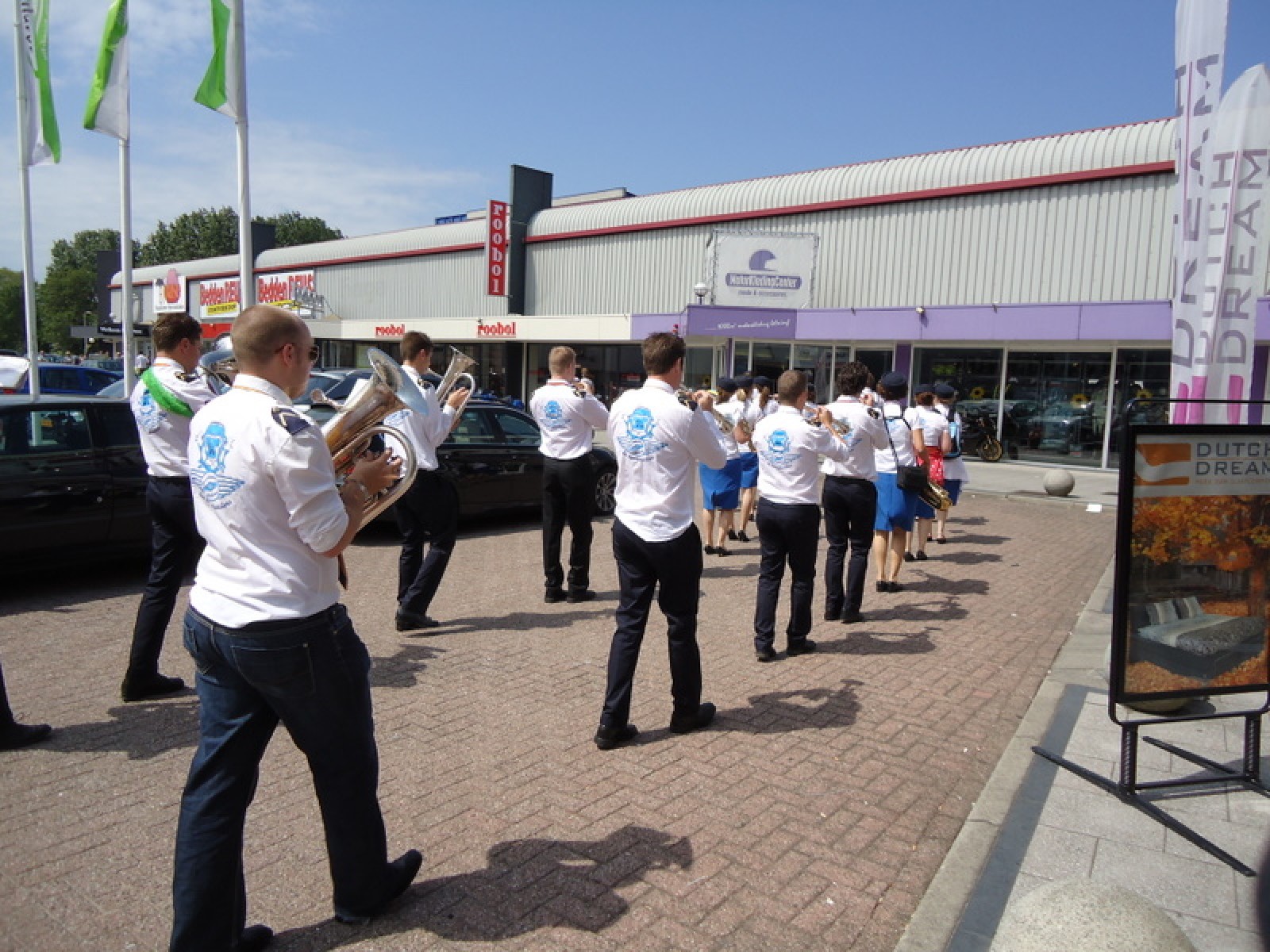 Op iedere hoek van de boulevard – waar we even geen inparkerende auto’s in de weg stonden – lekker een paar nummertjes gespeeld. Uiteraard de vliegshow, maar ook nummers uit onze nieuwe set. De catering was ook prima verzorgd en dat was maar goed ook, want na het spelen, springen en dansen in de brandende zon was een lekker pakje Wicky wel welkom.