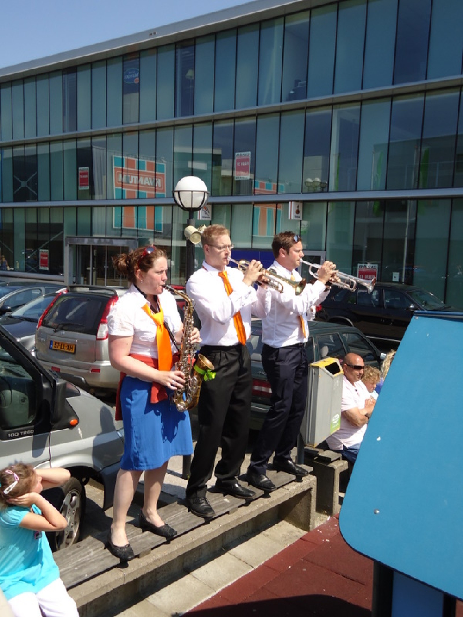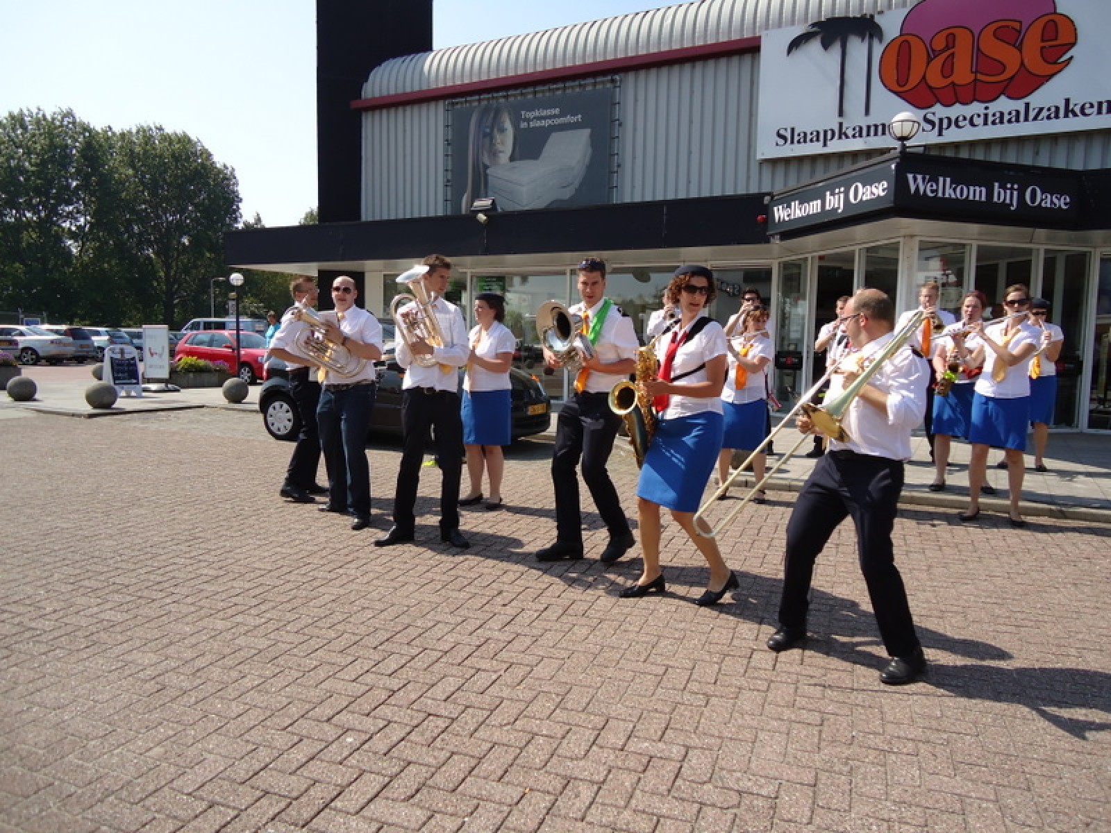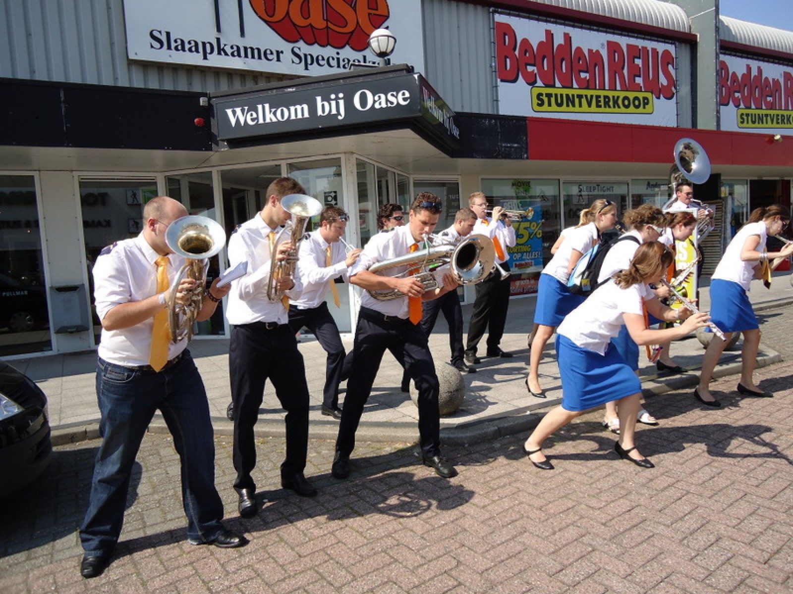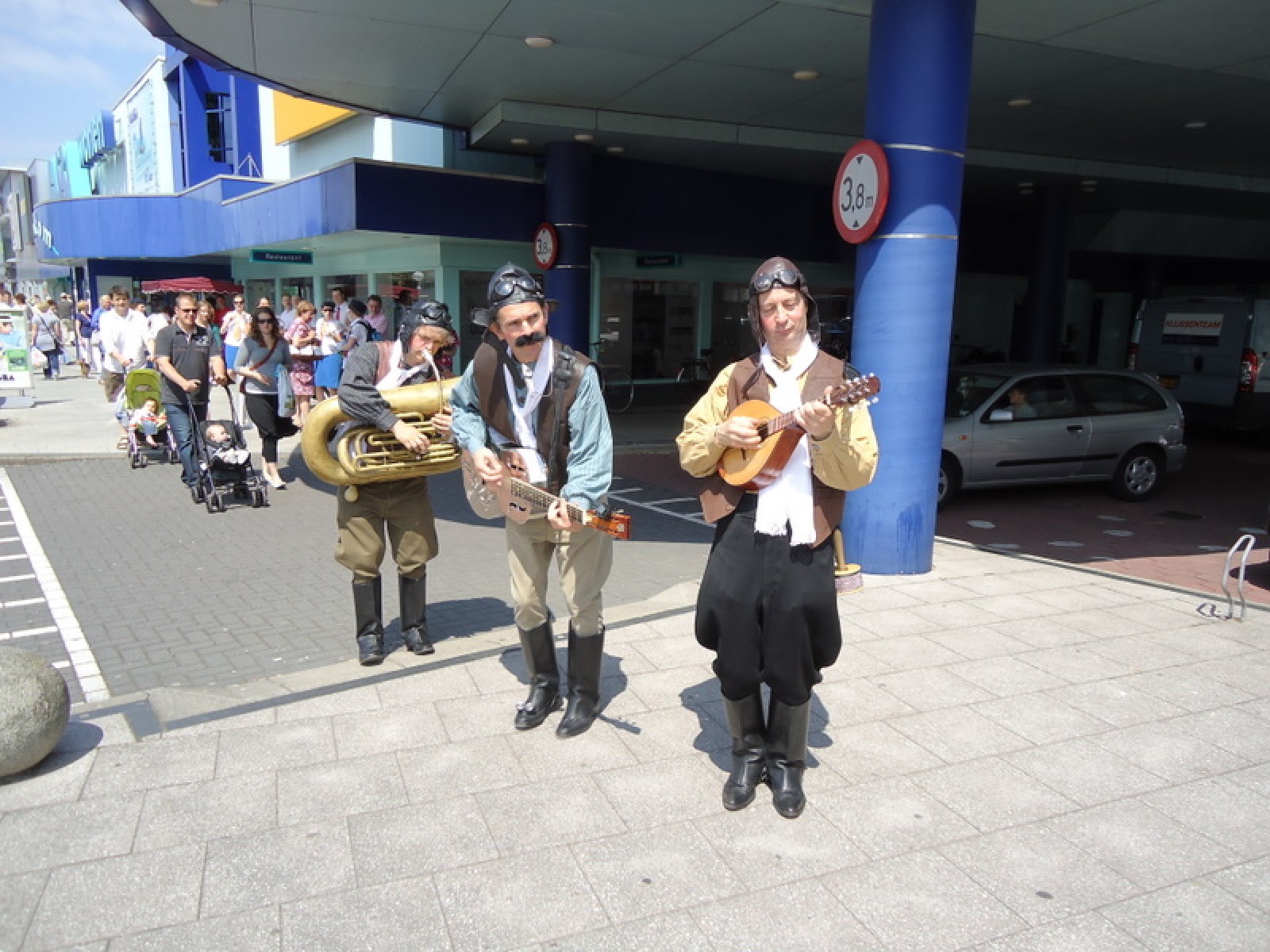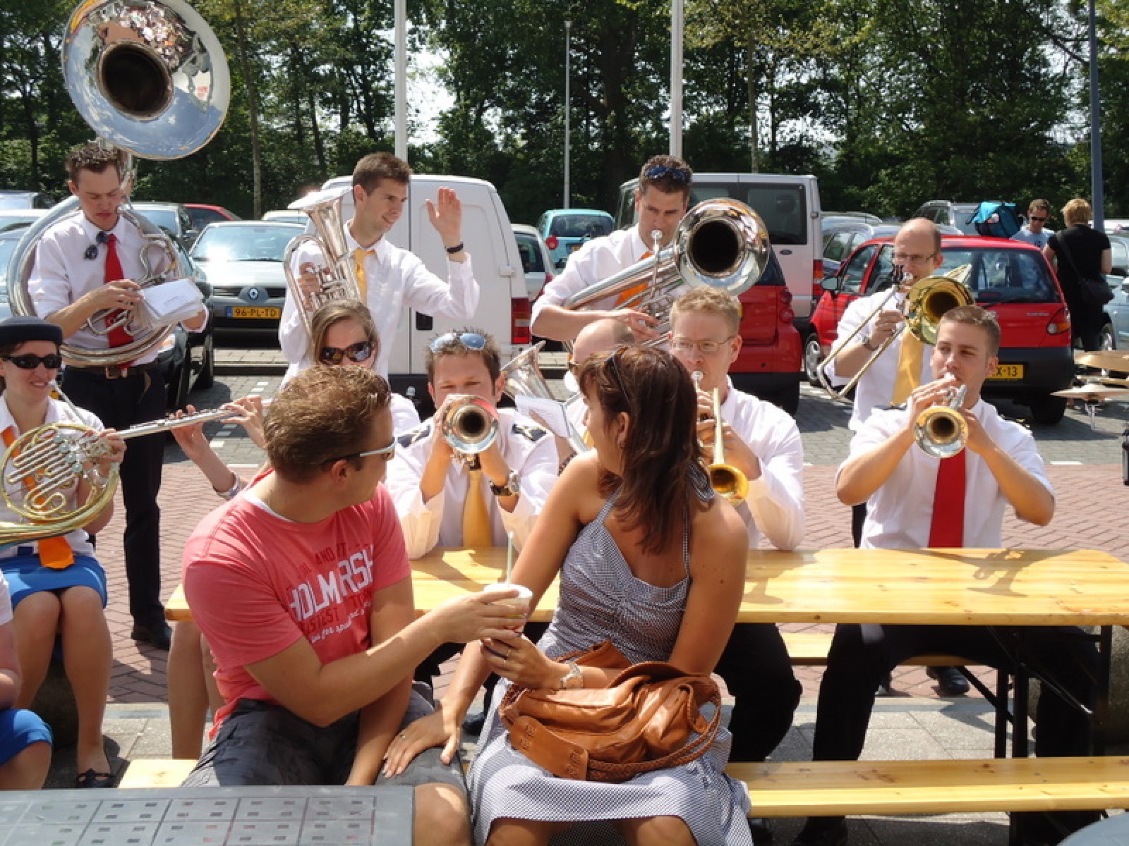 Op iedere hoek van de boulevard – waar we even geen inparkerende auto’s in de weg stonden – lekker een paar nummertjes gespeeld. Uiteraard de vliegshow, maar ook nummers uit onze nieuwe set. De catering was ook prima verzorgd en dat was maar goed ook, want na het spelen, springen en dansen in de brandende zon was een lekker pakje Wicky wel welkom.