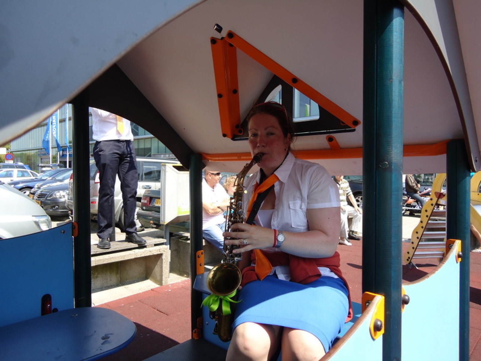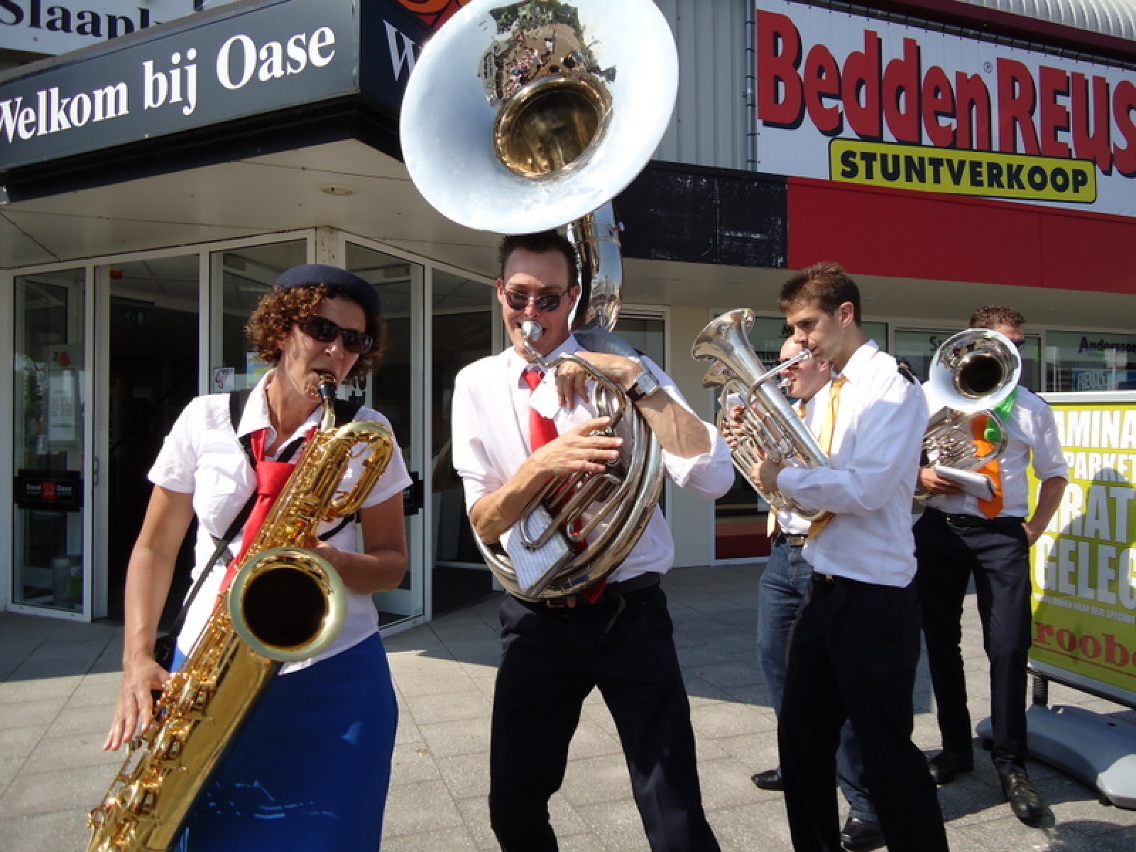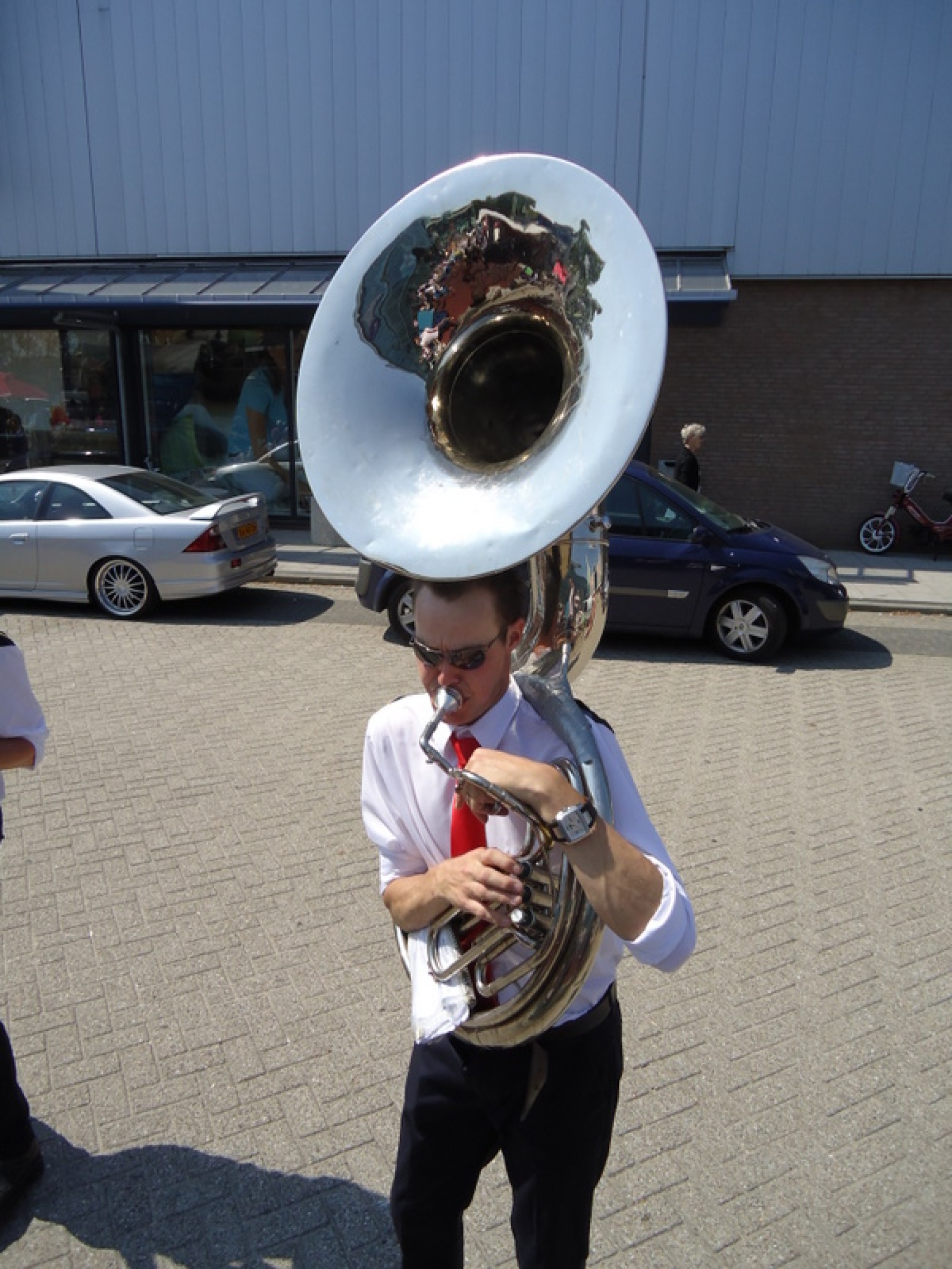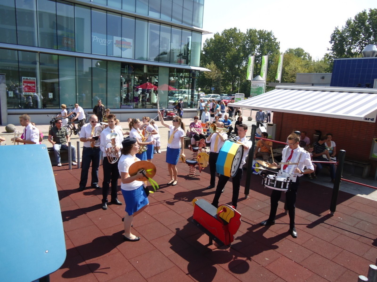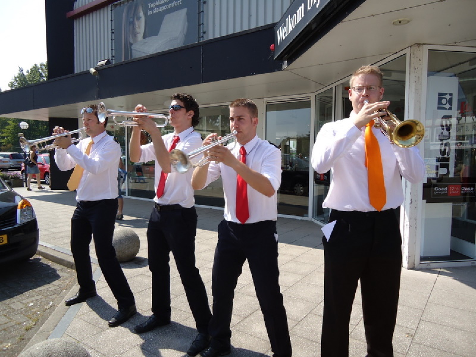 Op iedere hoek van de boulevard – waar we even geen inparkerende auto’s in de weg stonden – lekker een paar nummertjes gespeeld. Uiteraard de vliegshow, maar ook nummers uit onze nieuwe set. De catering was ook prima verzorgd en dat was maar goed ook, want na het spelen, springen en dansen in de brandende zon was een lekker pakje Wicky wel welkom.