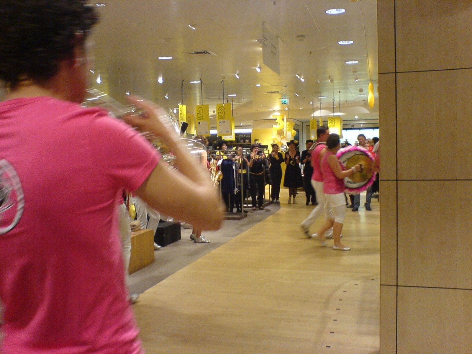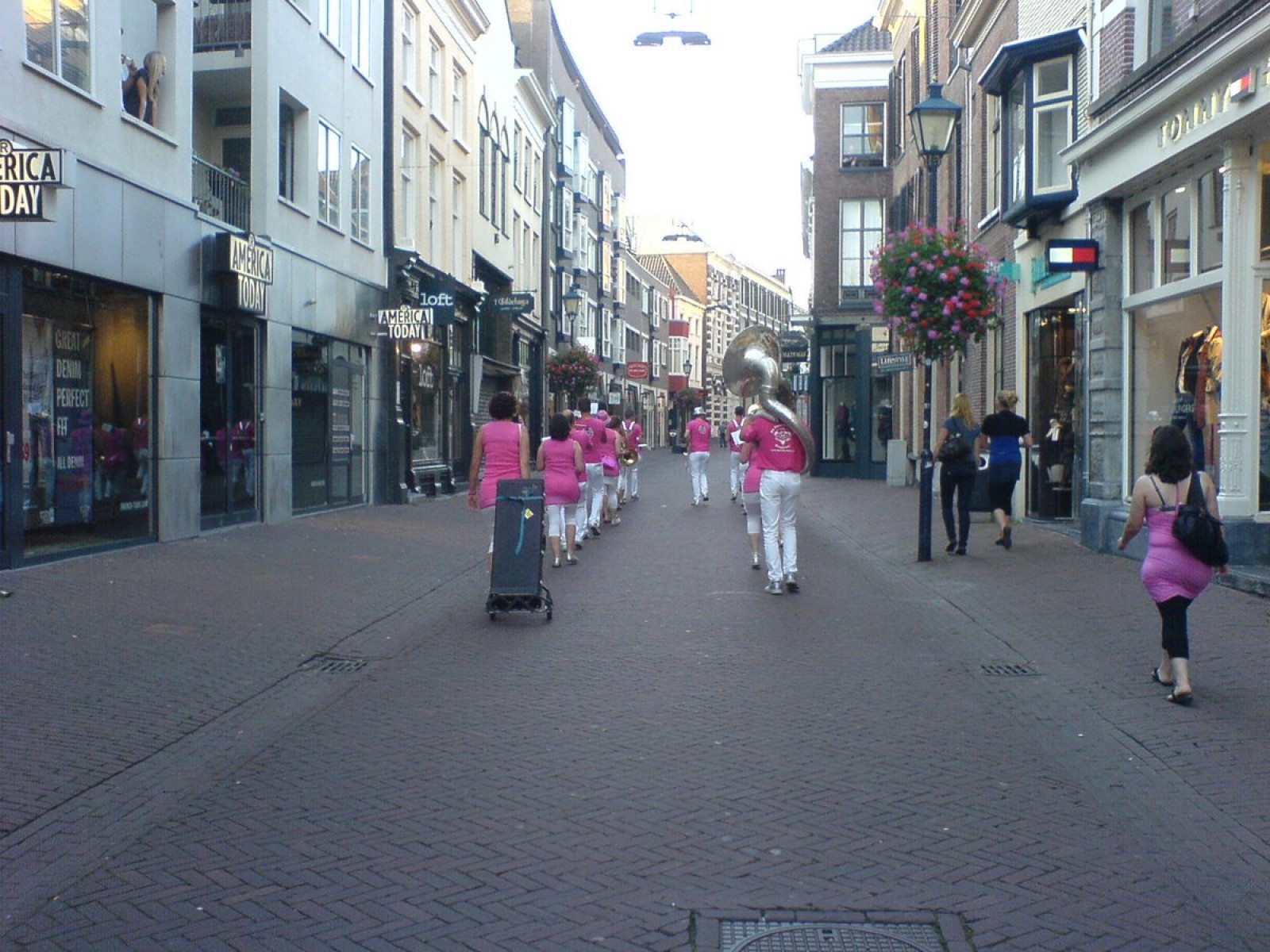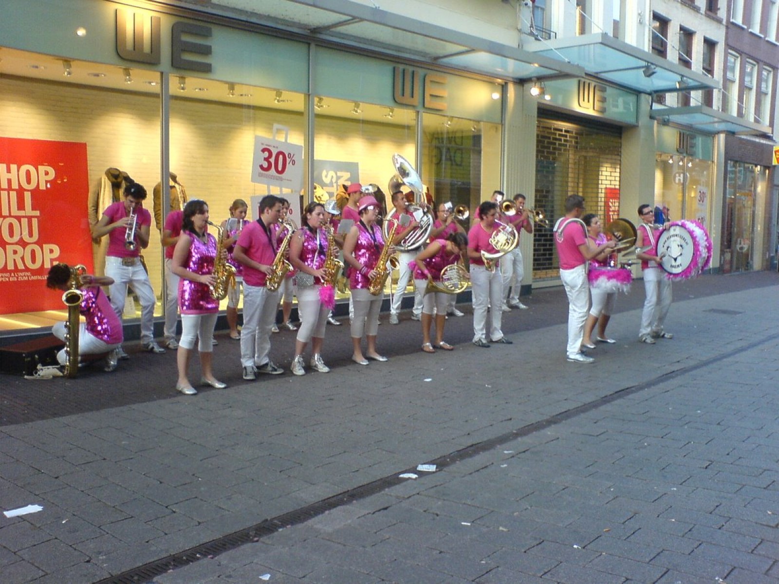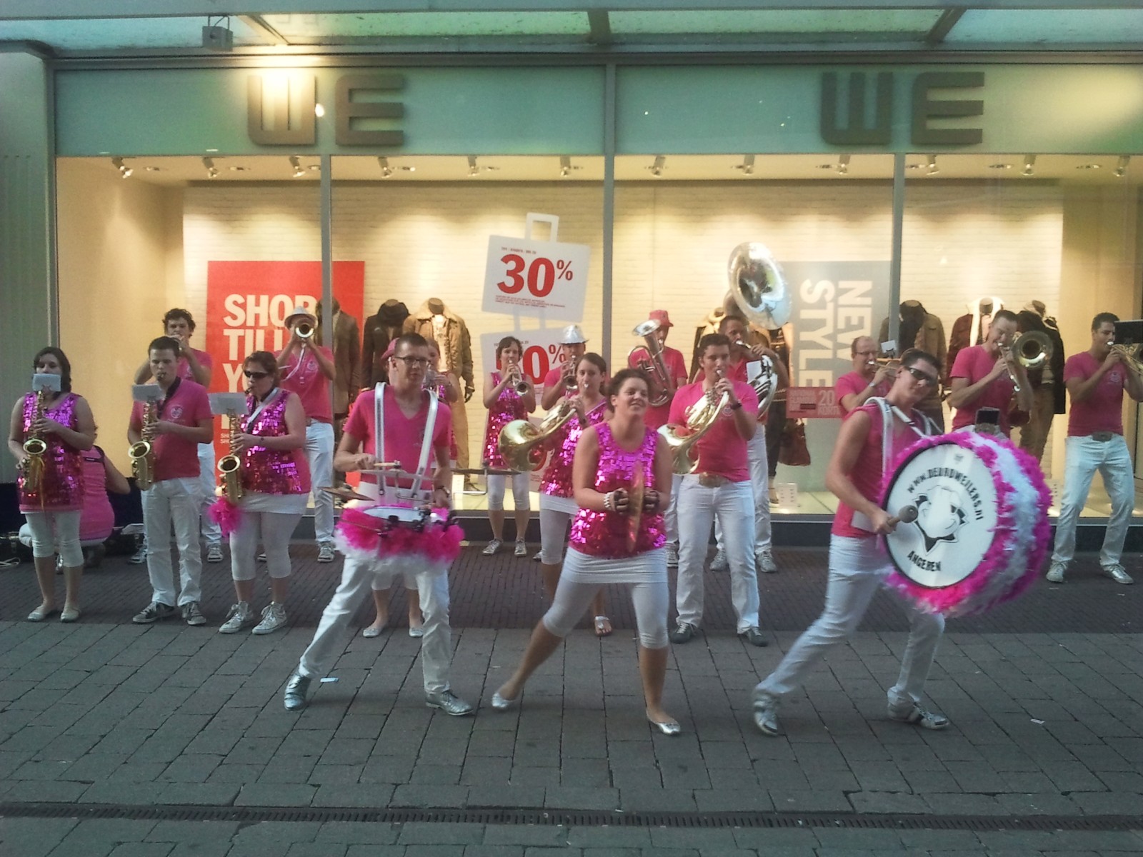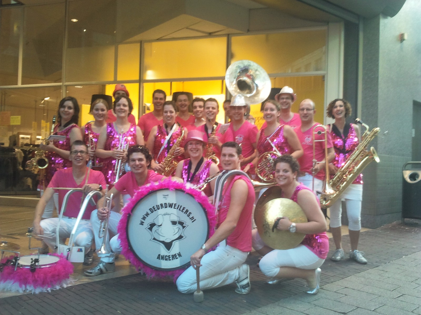In polonaise ging het door de Bijenkorf heen om uiteindelijk in het restaurant terecht te komen. Na een lekkere maaltijd en nog wat nummers hebben we het personeel gedag gezegd. Buiten aangekomen liepen we tegen een enthousiast terrasje aan dus ook daar werd nog wat gespeeld en ook op de weg naar de parkeerplaats hebben we nog een serenade aan een schitterende Sanseveria gebracht. Tijdens het inpakken van de instrumenten werden we overgehaald om ook nog even in De Waag te komen spelen want daar was Merlijn haar 16e verjaardag aan het vieren. OK. Ook nog even gespeeld.