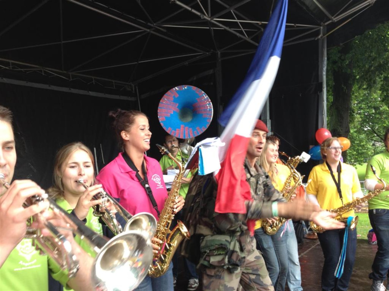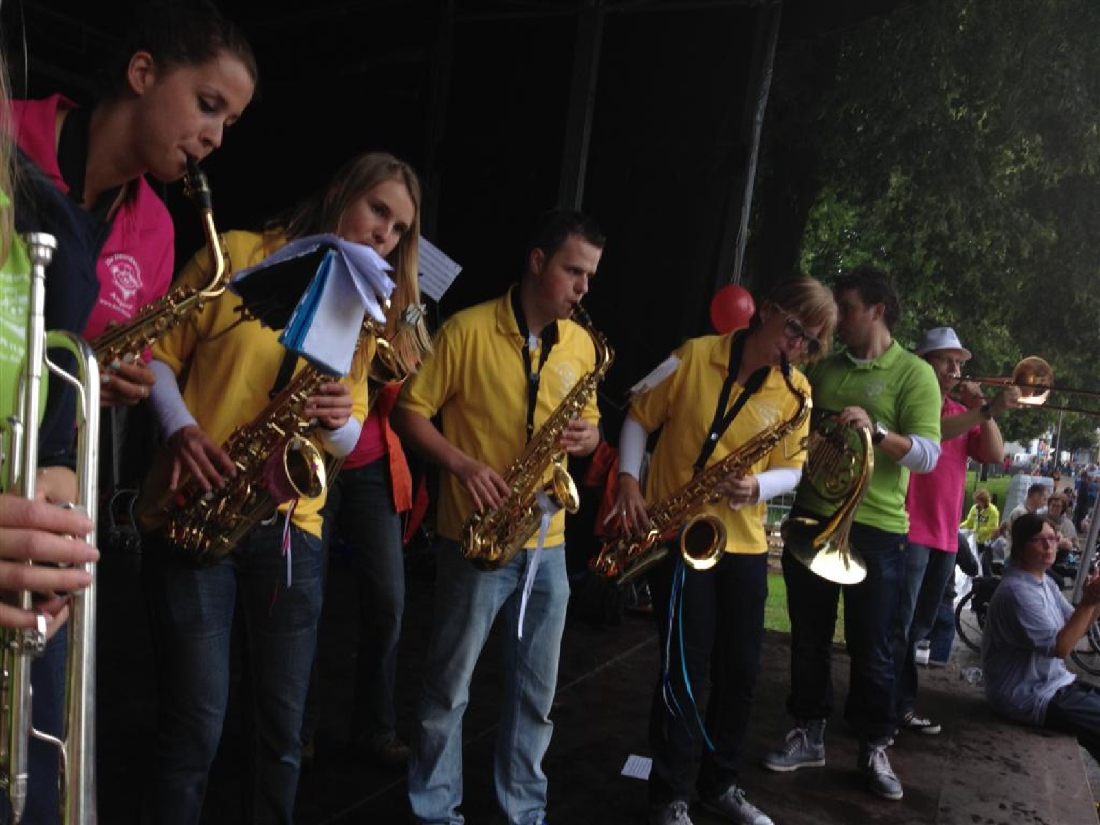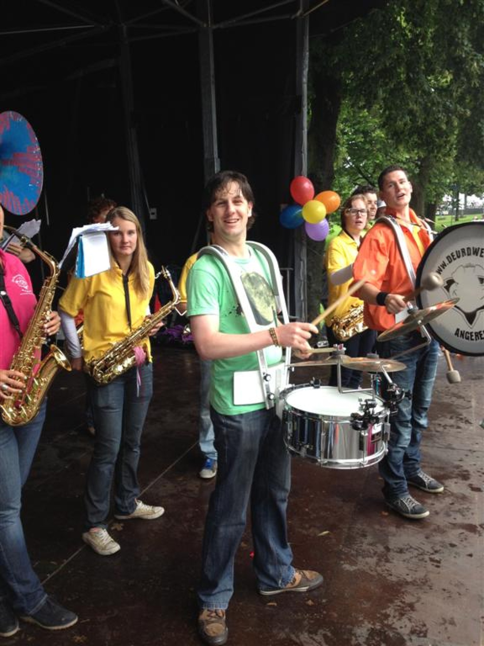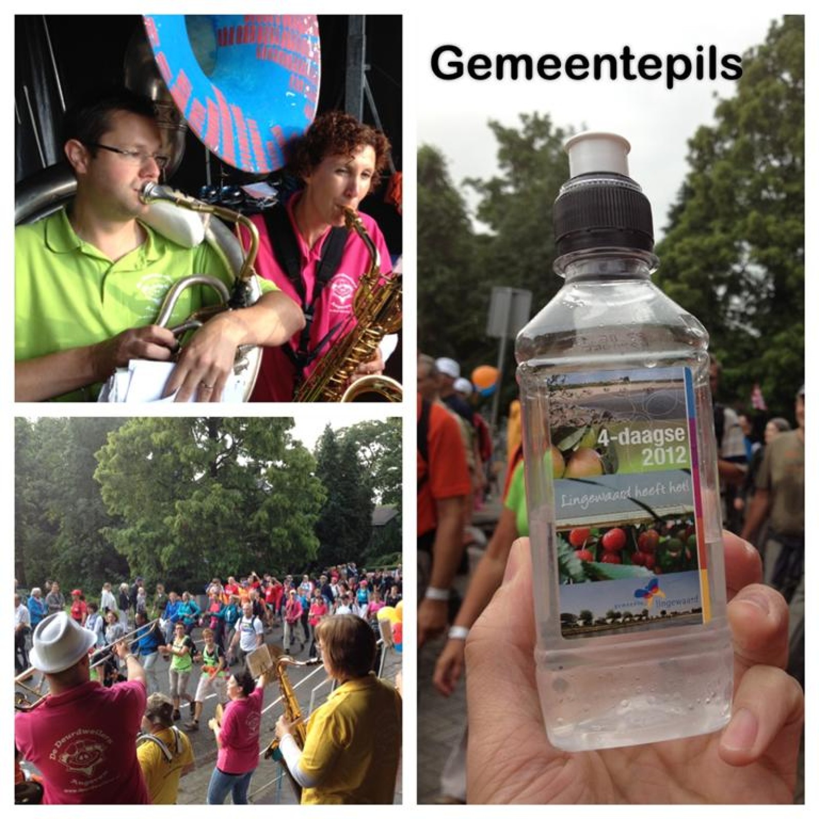 Terwijl de burgemeester en ander gemeentepersoneel flesjes water uitdeelden aan de wandelaars speelden wij afwisselend met de Zwabberbent op het podium.