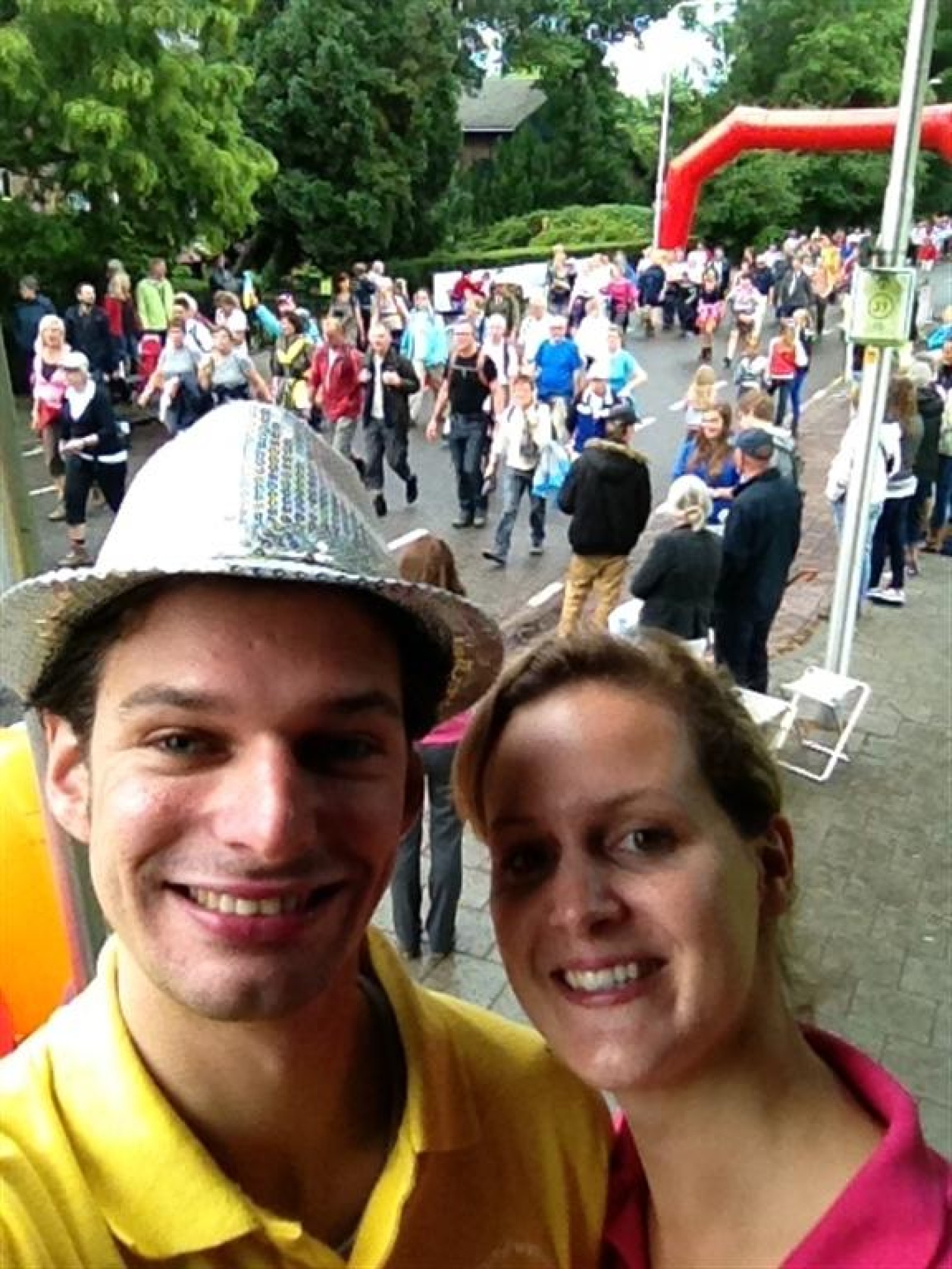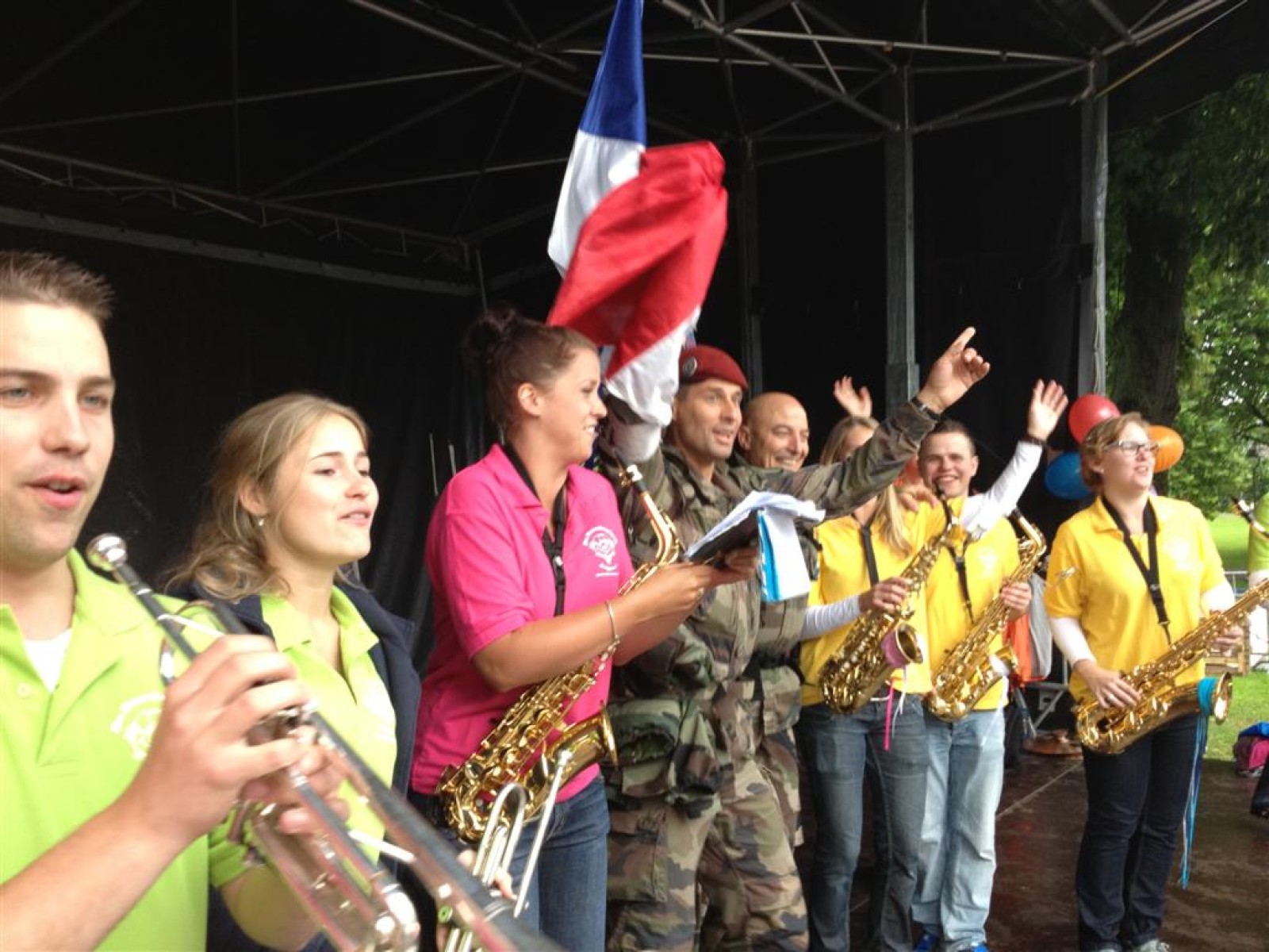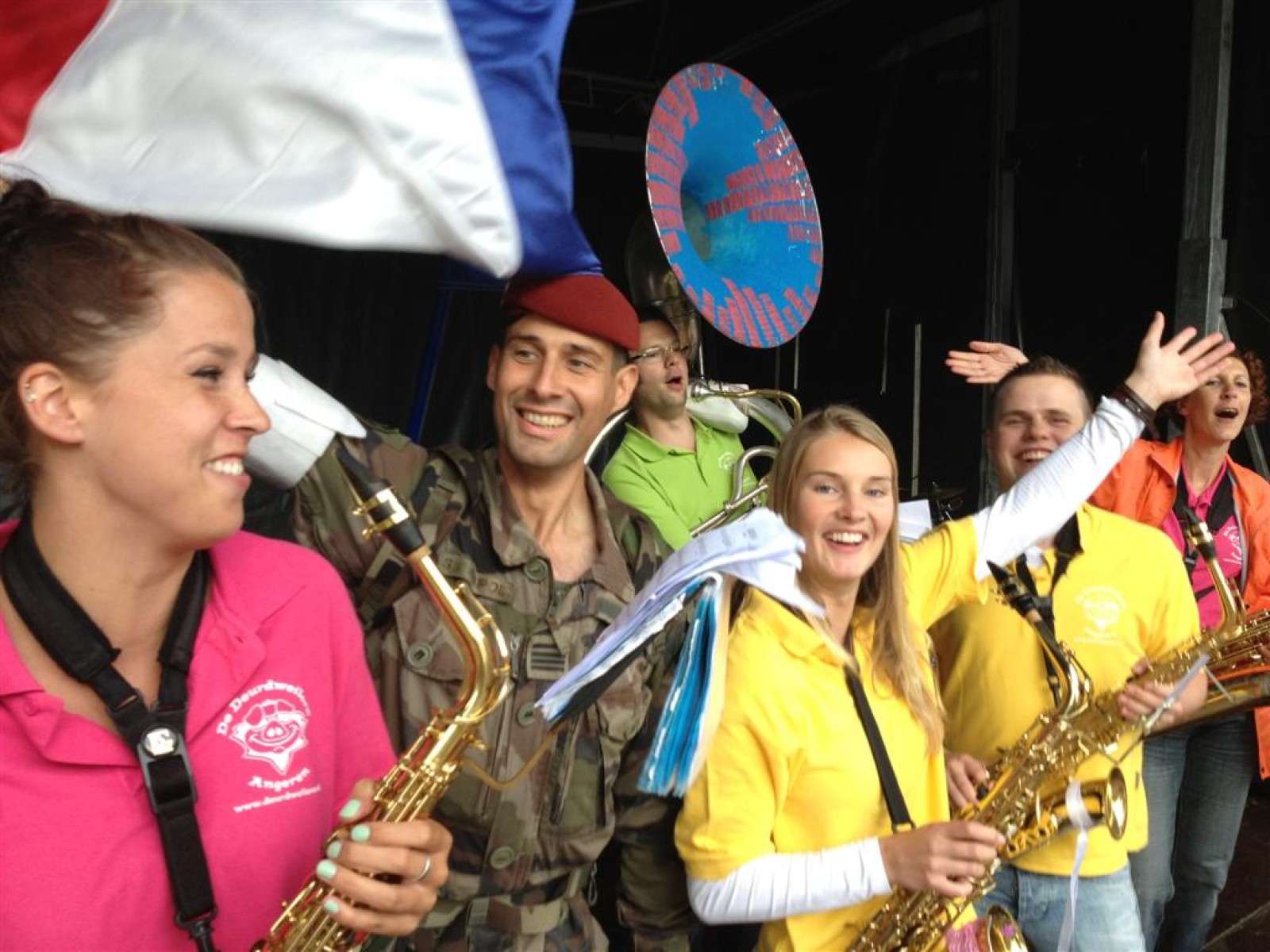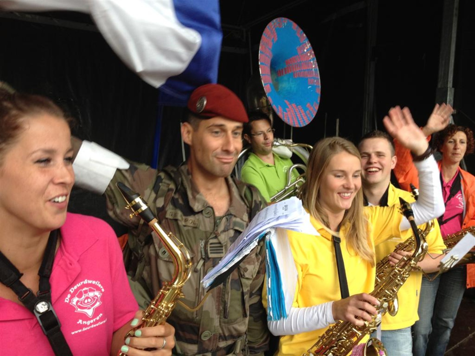 Terwijl de burgemeester en ander gemeentepersoneel flesjes water uitdeelden aan de wandelaars speelden wij afwisselend met de Zwabberbent op het podium.