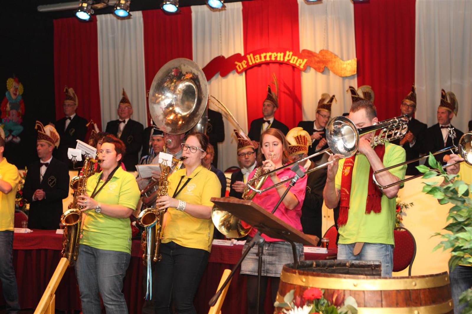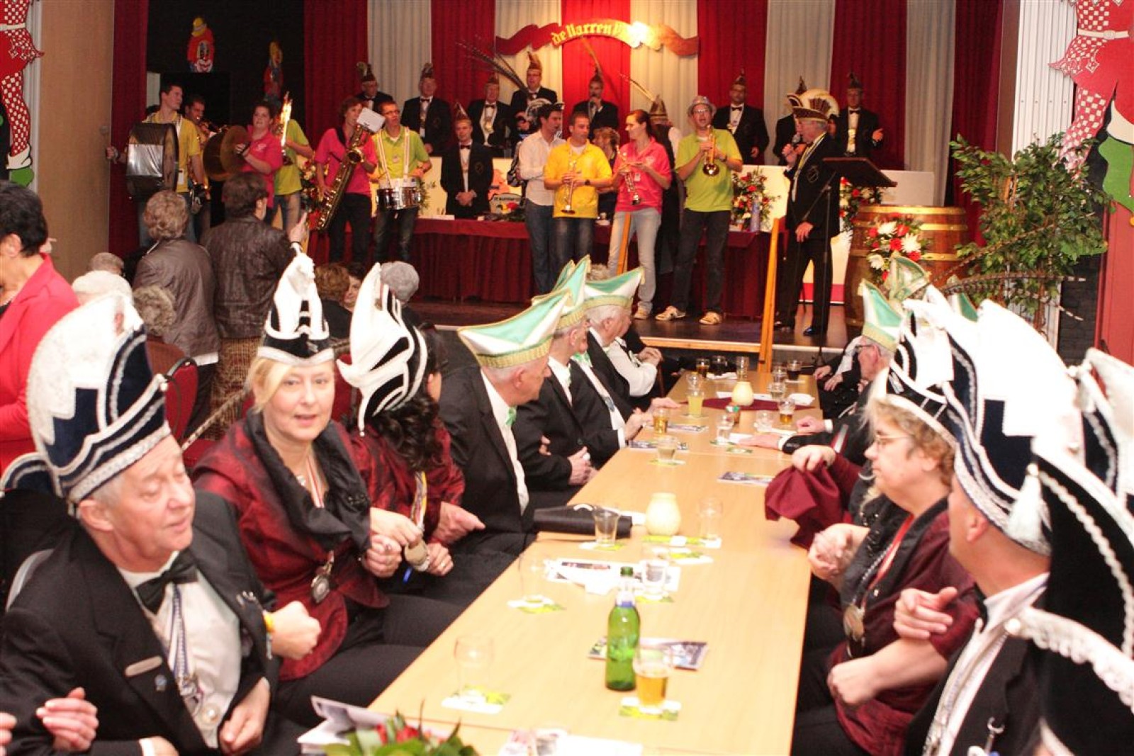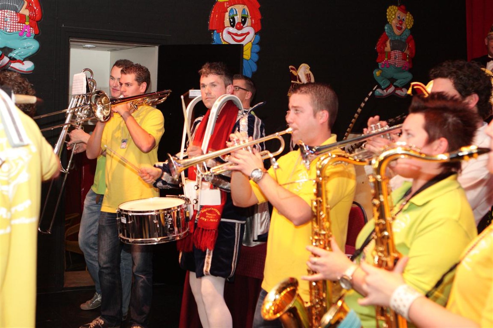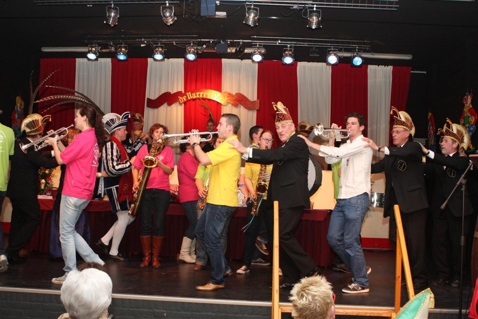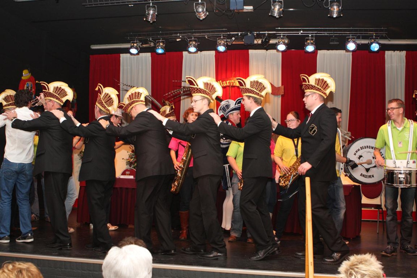 Koud binnen werd gevraagd of we 5 minuten later al op konden, want er was een programmapunt uitgevallen. Prima. Alhoewel we eventjes werden opgehouden om een glimp op een dansgarde te werpen die op dat moment aan het optreden was, gingen we snel de kelder in om om te kleden en te bedenken wat we zouden spelen. En even later betraden we het mooie grote en perfect belichte podium. Na een paar nummers mochten we alweer ophouden, want het programmapunt was er alweer. Maar de toon voor de avond was gezet. Onder luid applaus en gejuich van het publiek verlieten we door de zaal het podium.