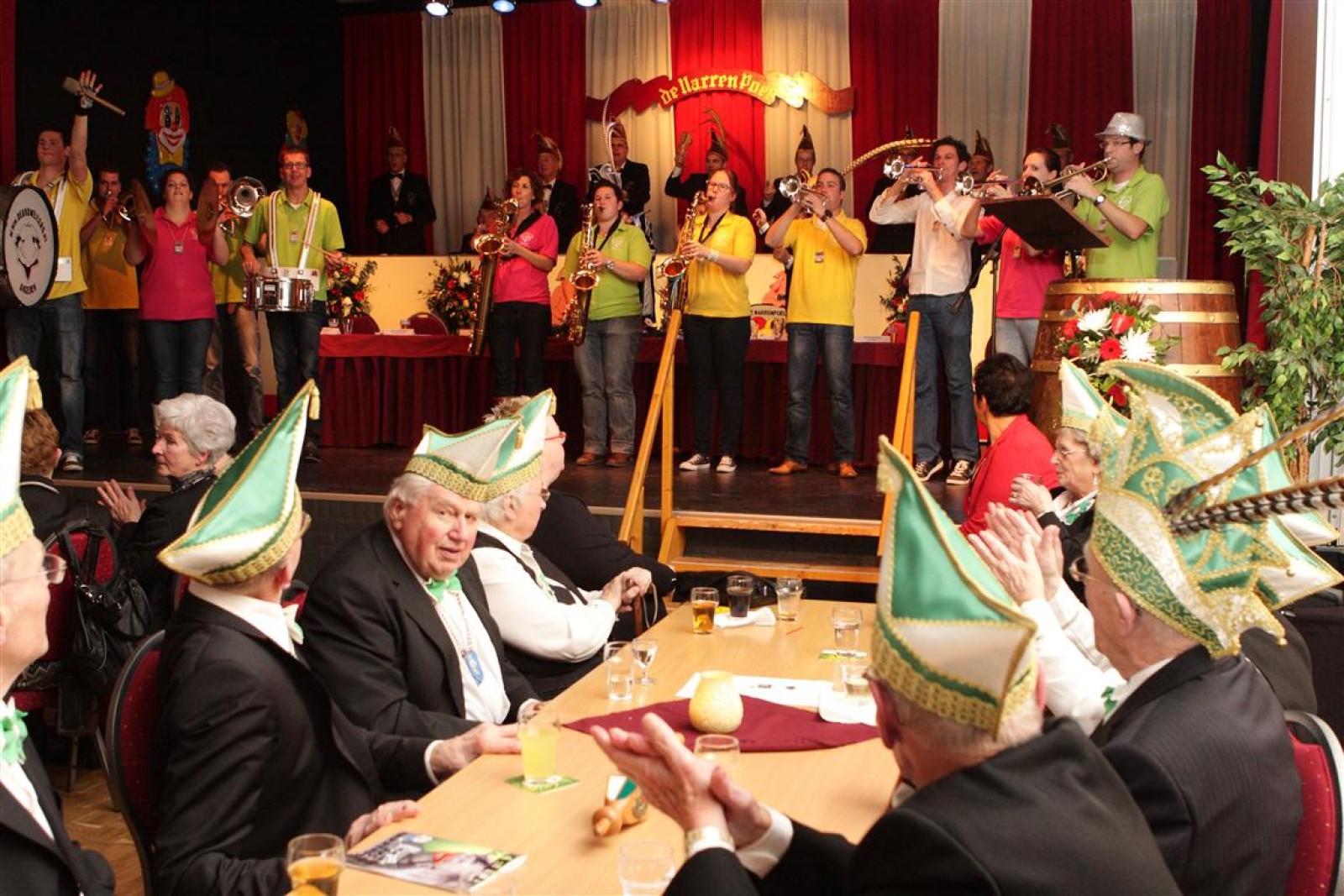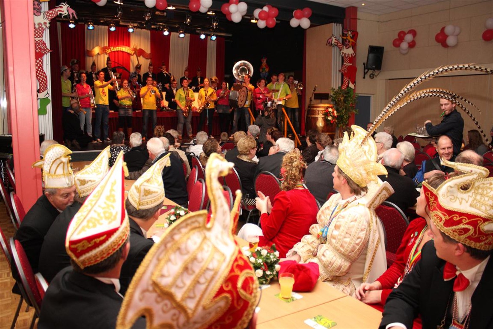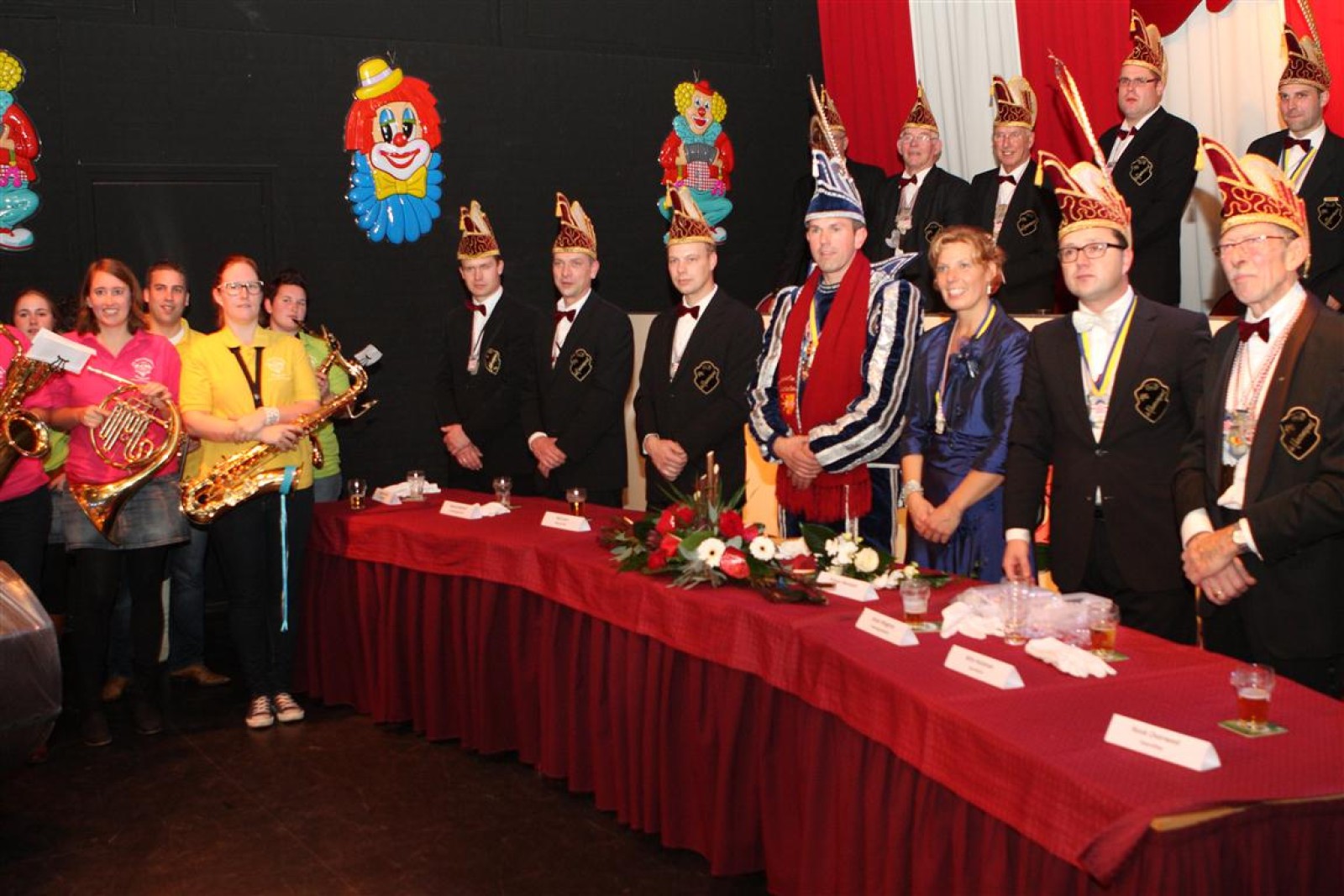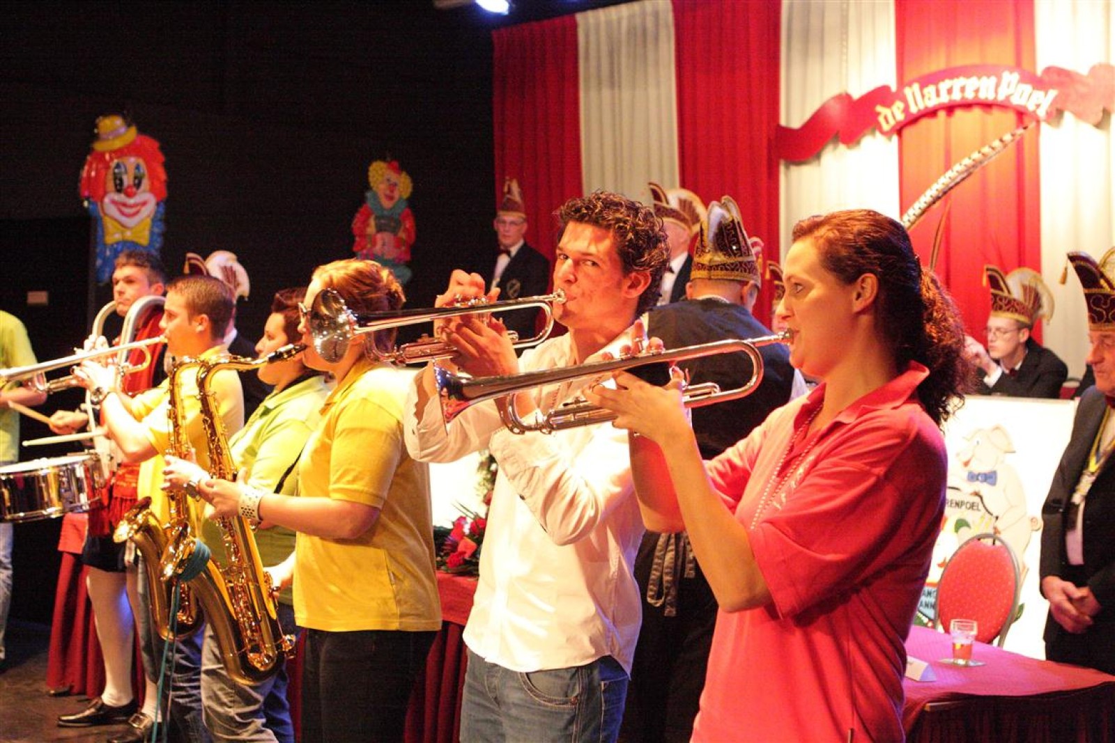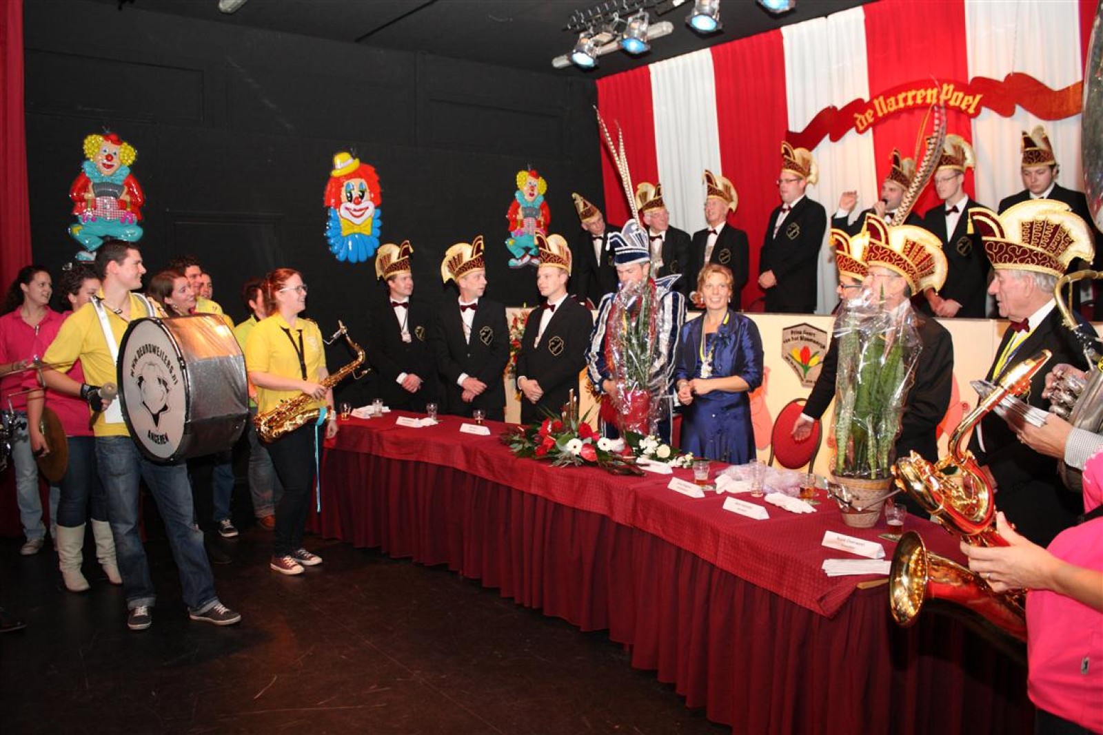 Koud binnen werd gevraagd of we 5 minuten later al op konden, want er was een programmapunt uitgevallen. Prima. Alhoewel we eventjes werden opgehouden om een glimp op een dansgarde te werpen die op dat moment aan het optreden was, gingen we snel de kelder in om om te kleden en te bedenken wat we zouden spelen. En even later betraden we het mooie grote en perfect belichte podium. Na een paar nummers mochten we alweer ophouden, want het programmapunt was er alweer. Maar de toon voor de avond was gezet. Onder luid applaus en gejuich van het publiek verlieten we door de zaal het podium.