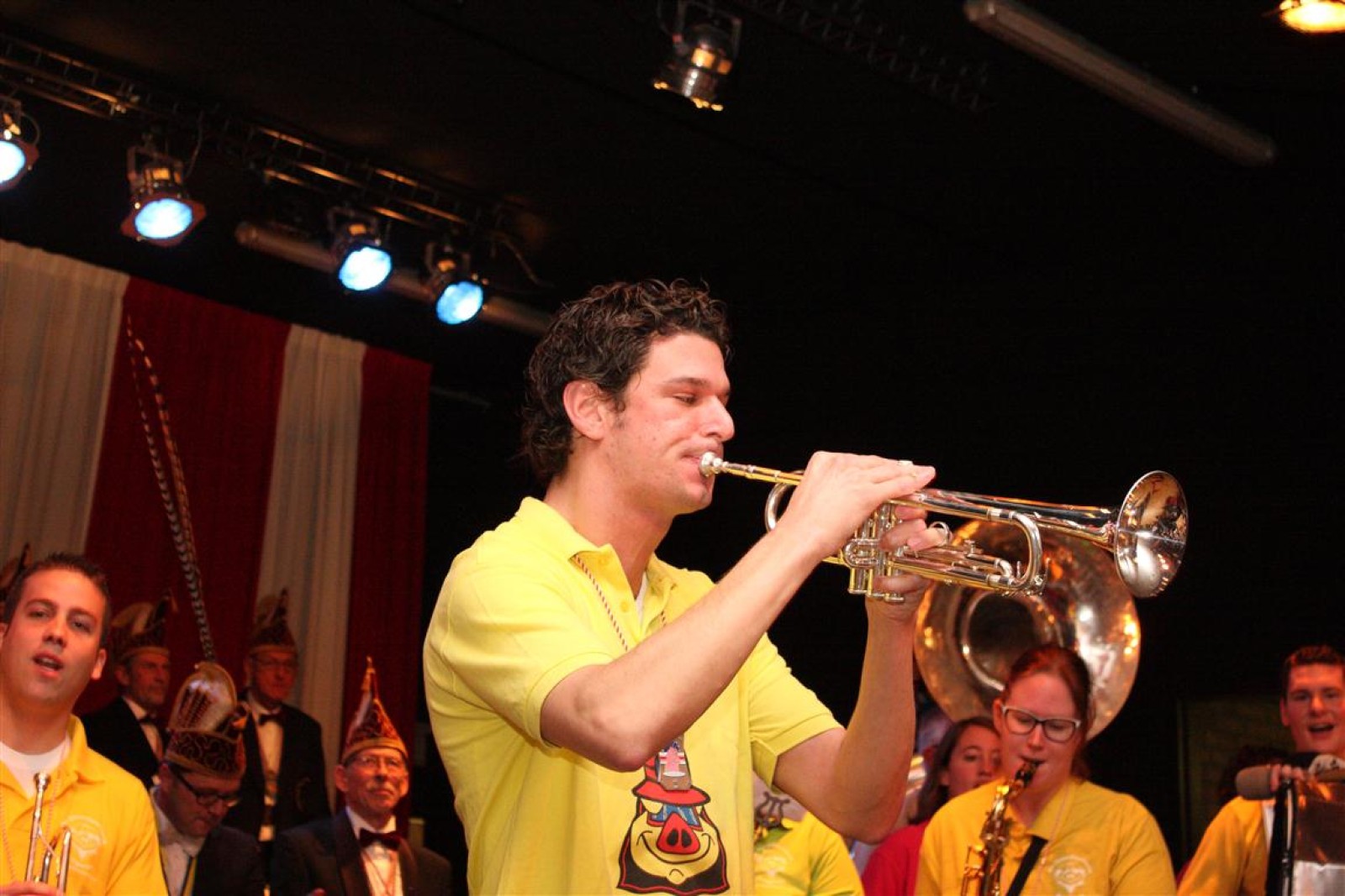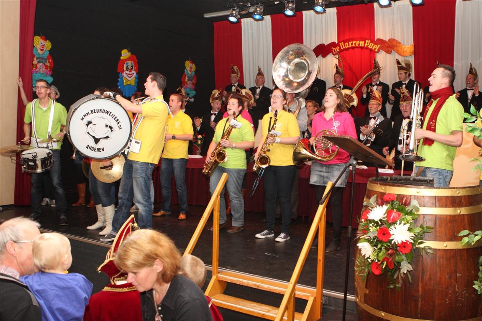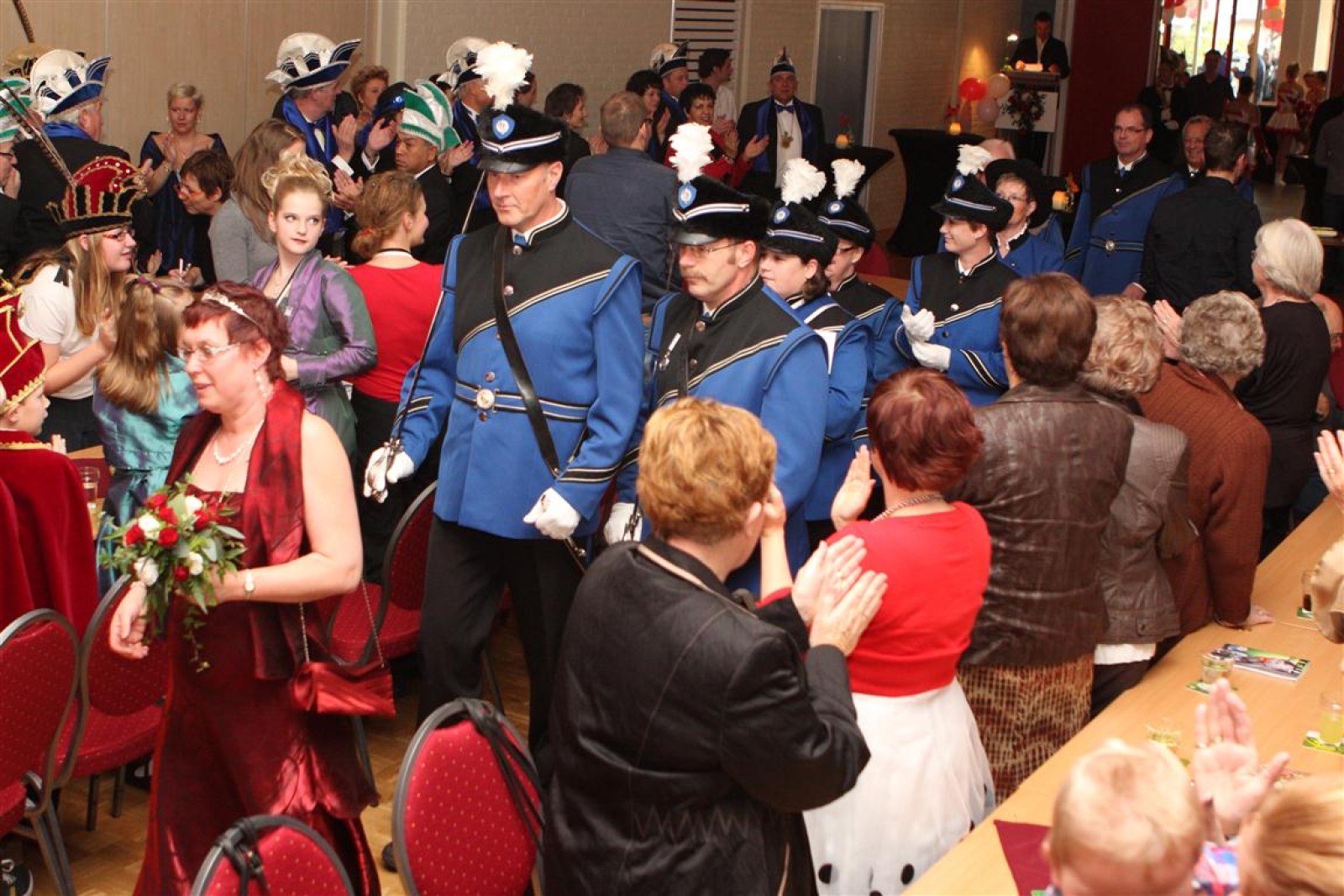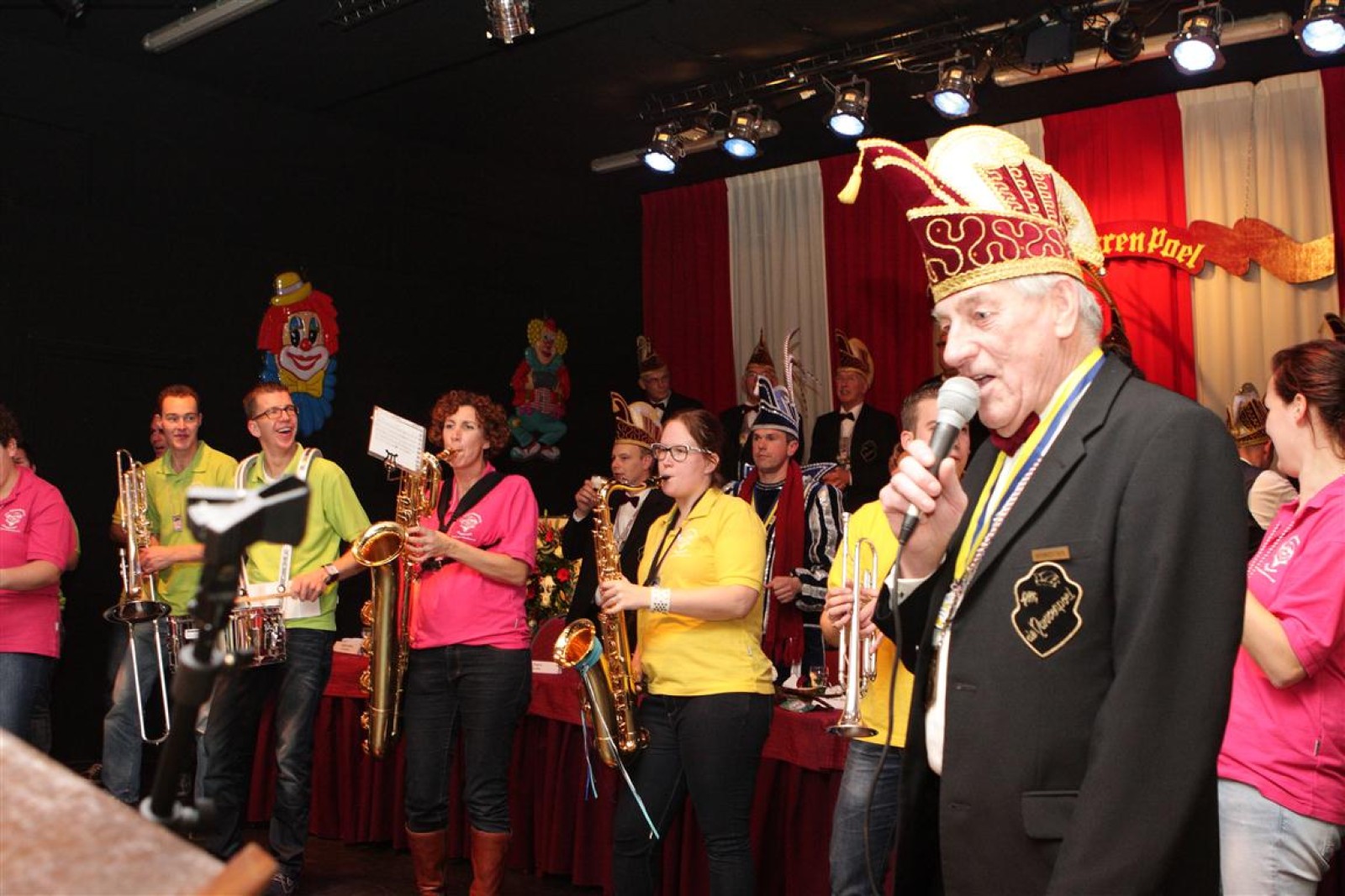 Koud binnen werd gevraagd of we 5 minuten later al op konden, want er was een programmapunt uitgevallen. Prima. Alhoewel we eventjes werden opgehouden om een glimp op een dansgarde te werpen die op dat moment aan het optreden was, gingen we snel de kelder in om om te kleden en te bedenken wat we zouden spelen. En even later betraden we het mooie grote en perfect belichte podium. Na een paar nummers mochten we alweer ophouden, want het programmapunt was er alweer. Maar de toon voor de avond was gezet. Onder luid applaus en gejuich van het publiek verlieten we door de zaal het podium.