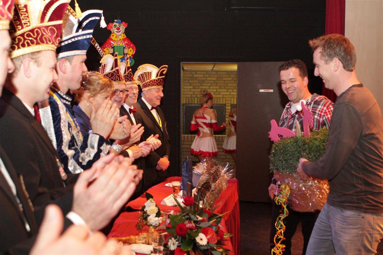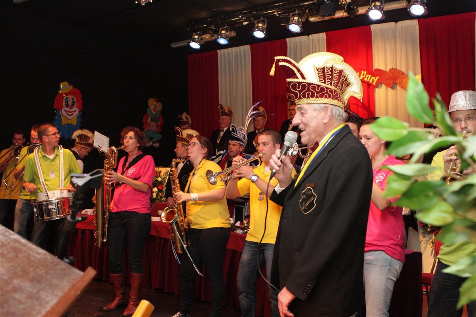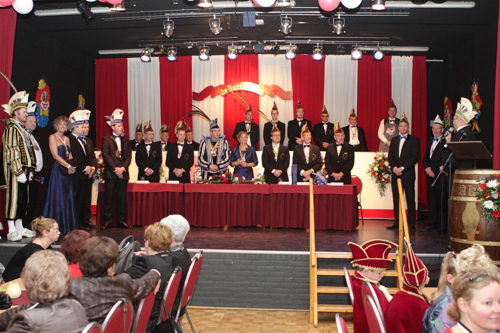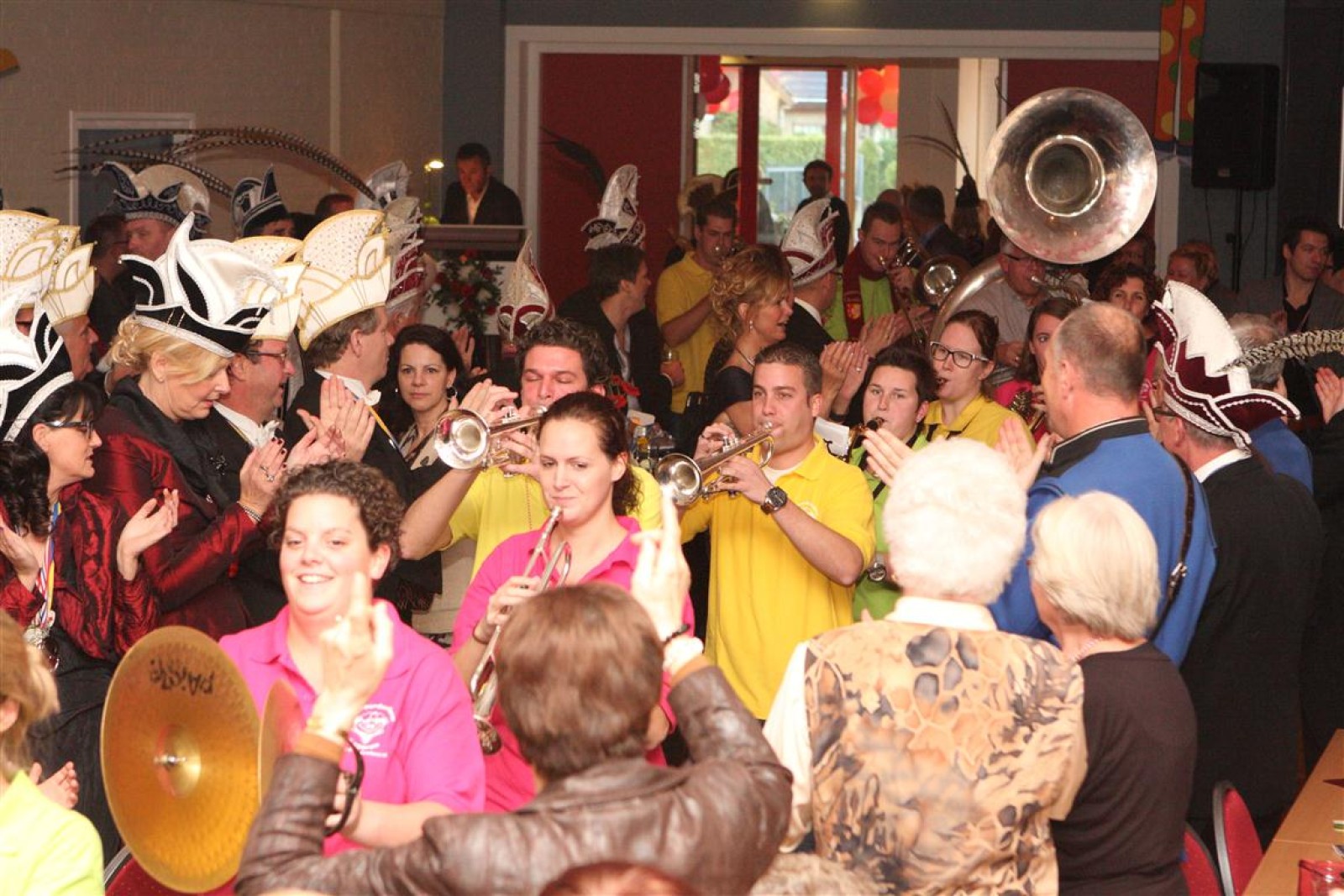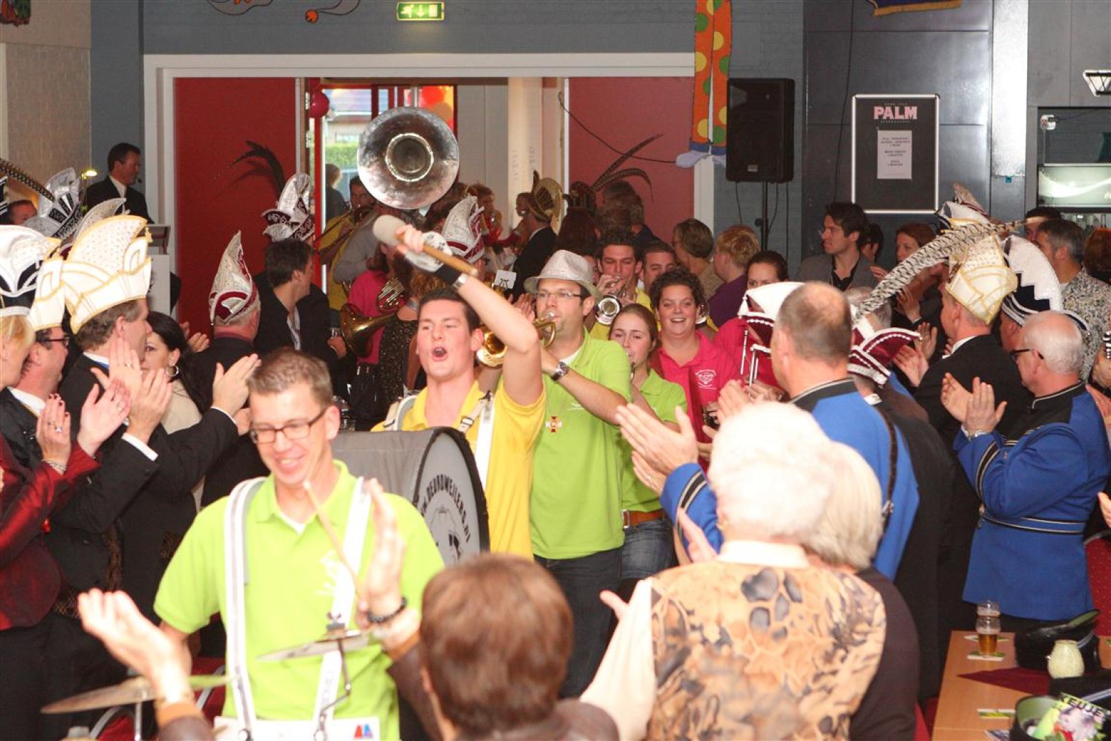 Koud binnen werd gevraagd of we 5 minuten later al op konden, want er was een programmapunt uitgevallen. Prima. Alhoewel we eventjes werden opgehouden om een glimp op een dansgarde te werpen die op dat moment aan het optreden was, gingen we snel de kelder in om om te kleden en te bedenken wat we zouden spelen. En even later betraden we het mooie grote en perfect belichte podium. Na een paar nummers mochten we alweer ophouden, want het programmapunt was er alweer. Maar de toon voor de avond was gezet. Onder luid applaus en gejuich van het publiek verlieten we door de zaal het podium.