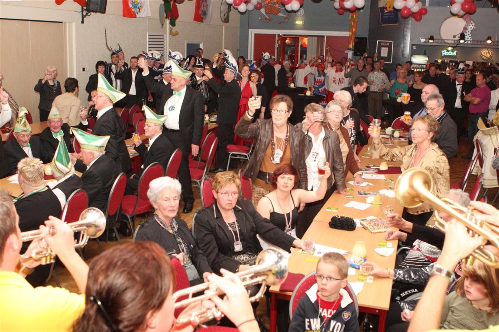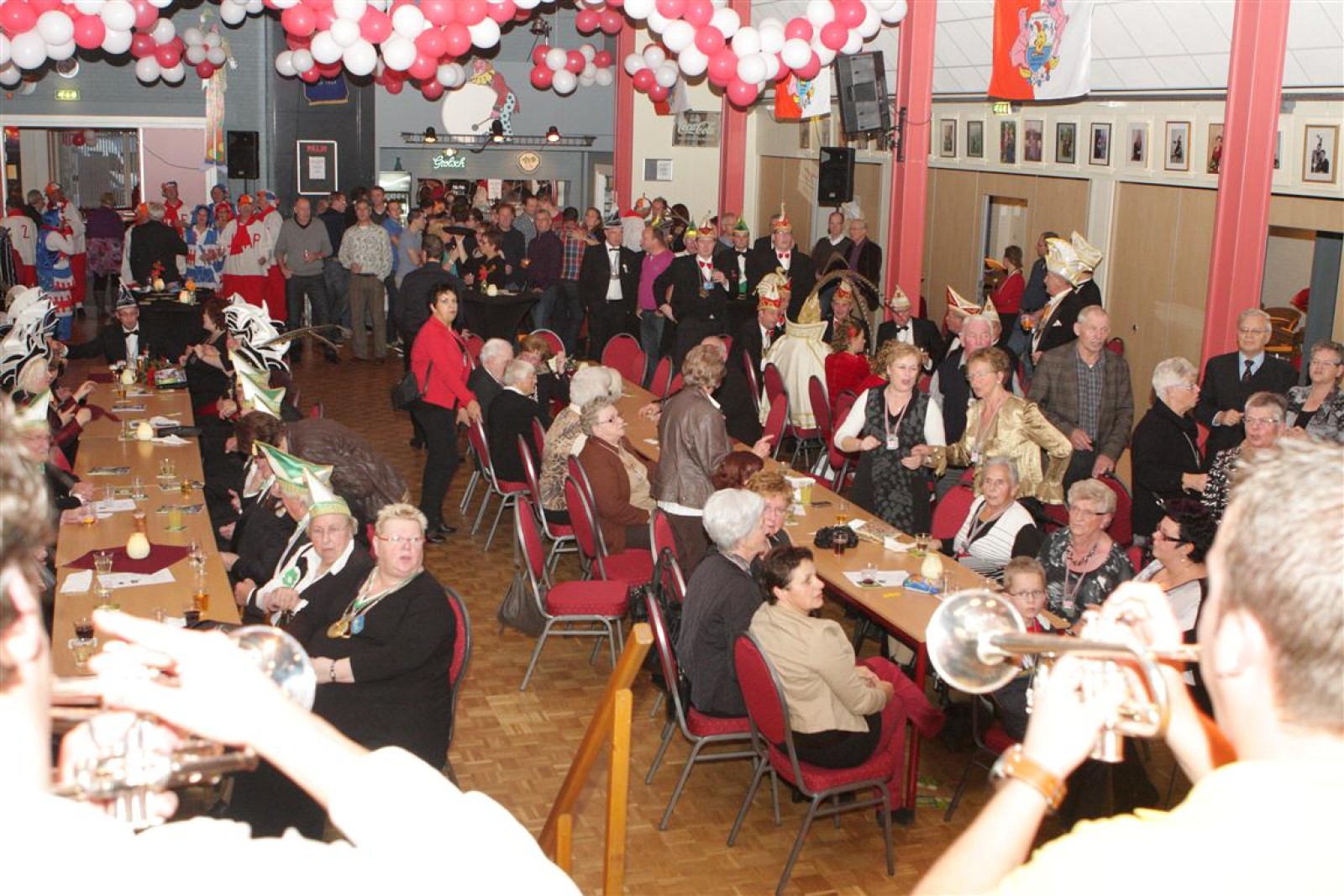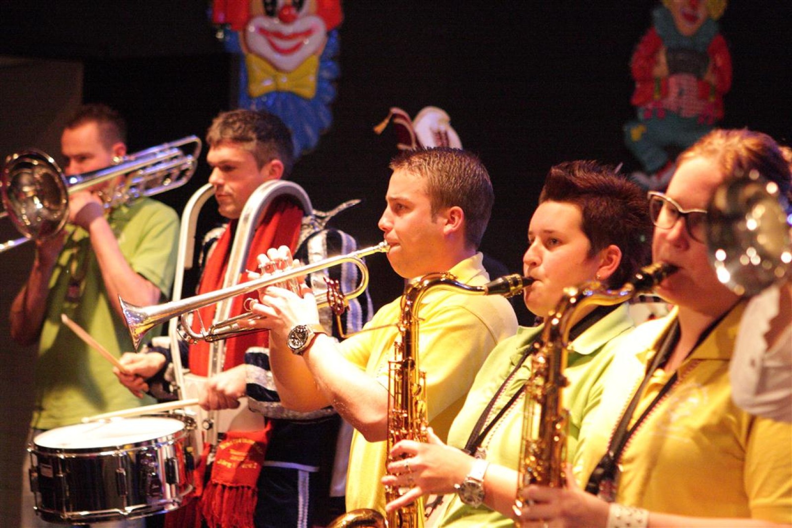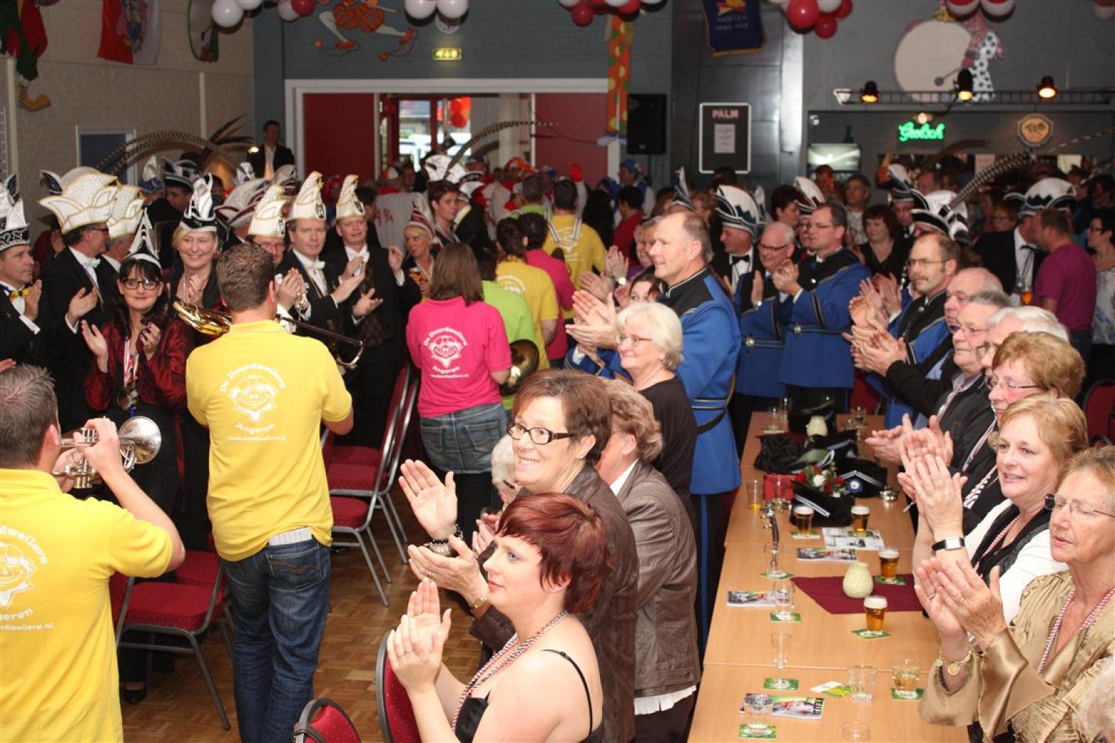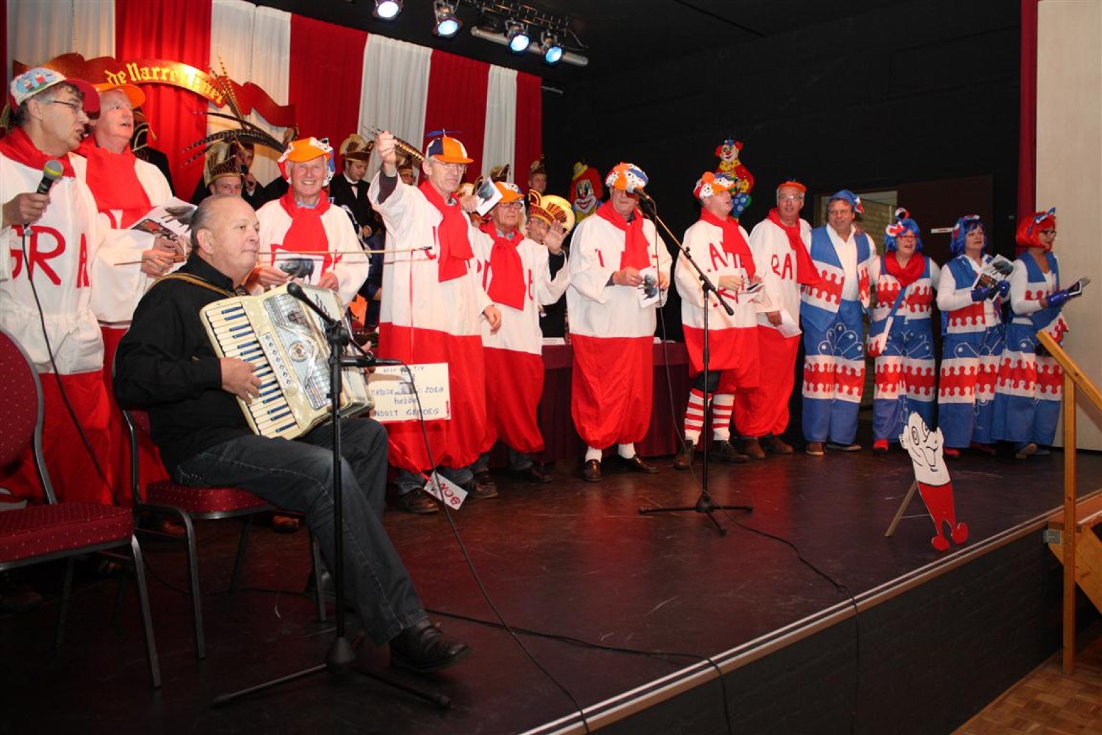 Koud binnen werd gevraagd of we 5 minuten later al op konden, want er was een programmapunt uitgevallen. Prima. Alhoewel we eventjes werden opgehouden om een glimp op een dansgarde te werpen die op dat moment aan het optreden was, gingen we snel de kelder in om om te kleden en te bedenken wat we zouden spelen. En even later betraden we het mooie grote en perfect belichte podium. Na een paar nummers mochten we alweer ophouden, want het programmapunt was er alweer. Maar de toon voor de avond was gezet. Onder luid applaus en gejuich van het publiek verlieten we door de zaal het podium.
