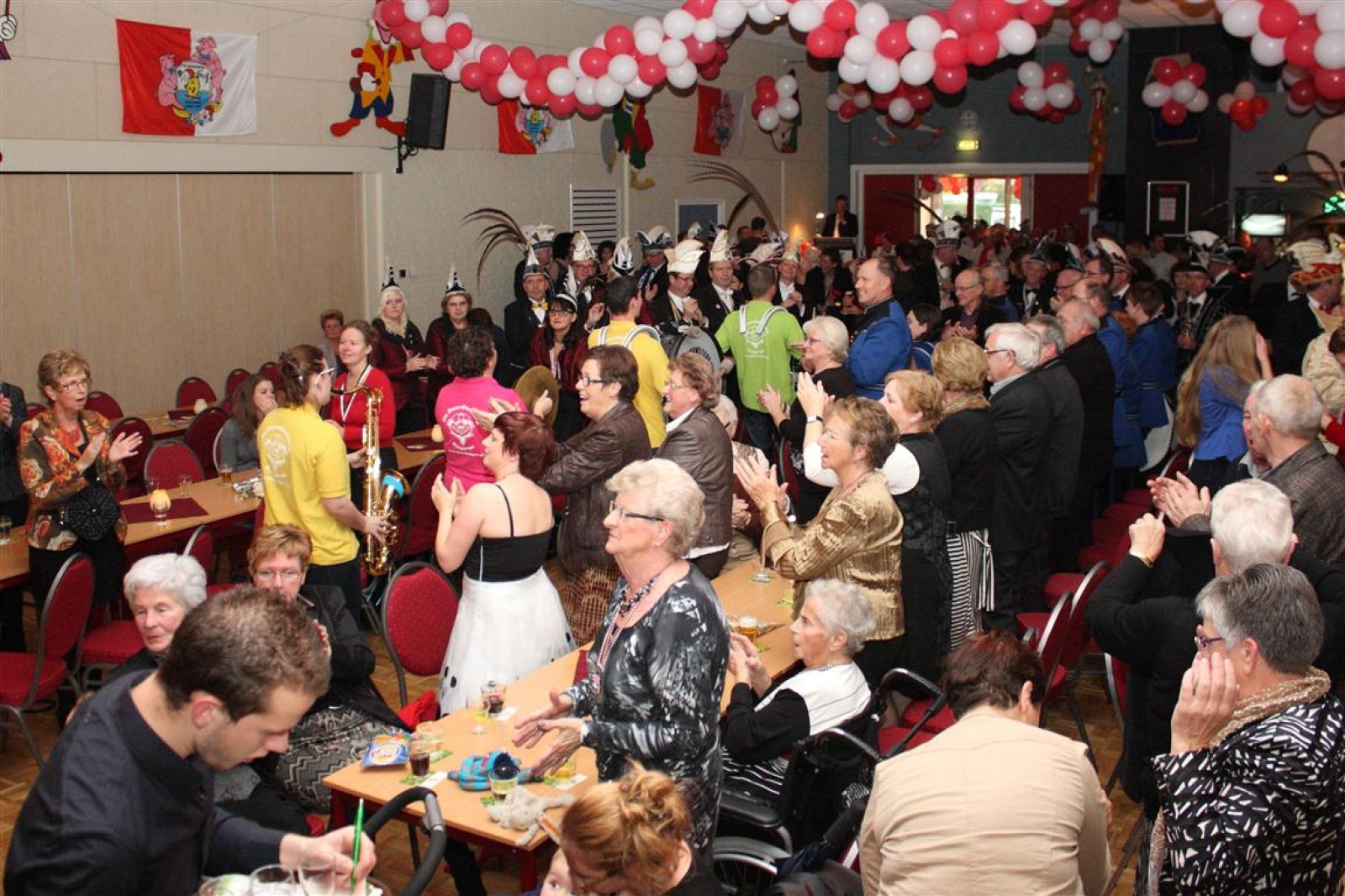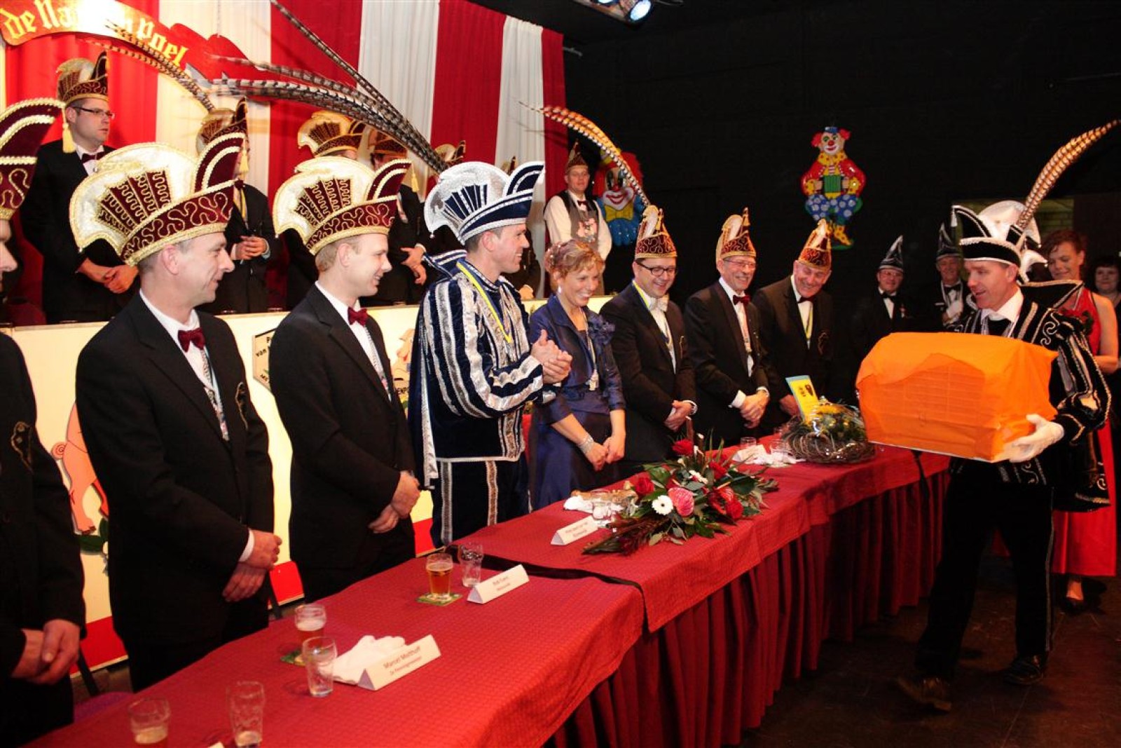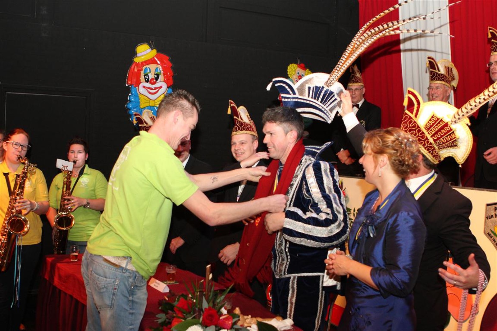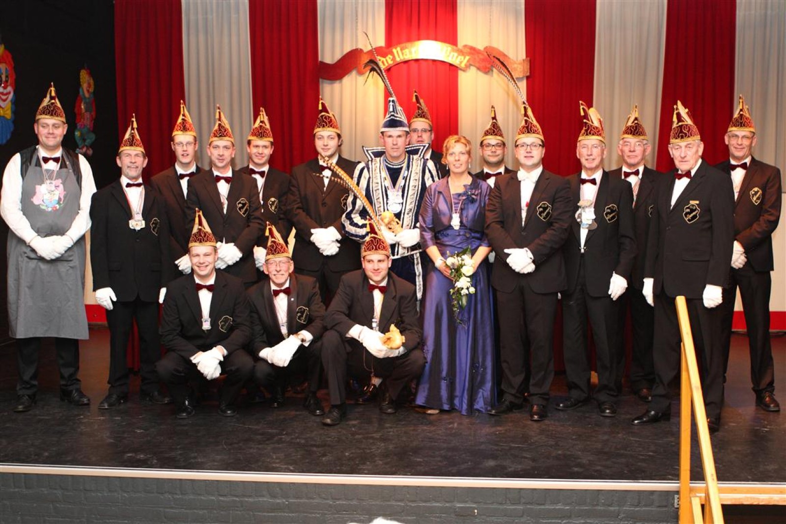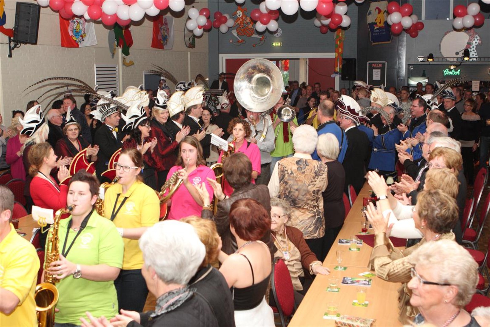 Koud binnen werd gevraagd of we 5 minuten later al op konden, want er was een programmapunt uitgevallen. Prima. Alhoewel we eventjes werden opgehouden om een glimp op een dansgarde te werpen die op dat moment aan het optreden was, gingen we snel de kelder in om om te kleden en te bedenken wat we zouden spelen. En even later betraden we het mooie grote en perfect belichte podium. Na een paar nummers mochten we alweer ophouden, want het programmapunt was er alweer. Maar de toon voor de avond was gezet. Onder luid applaus en gejuich van het publiek verlieten we door de zaal het podium.