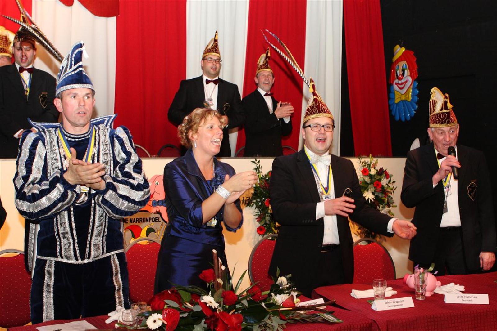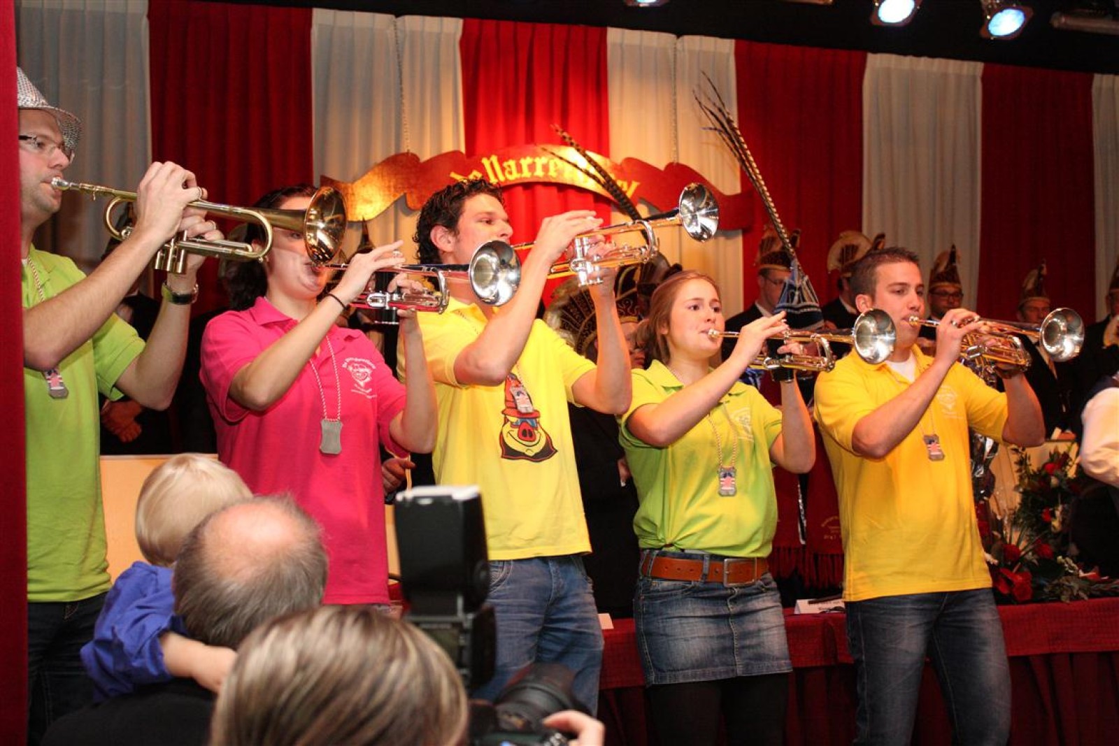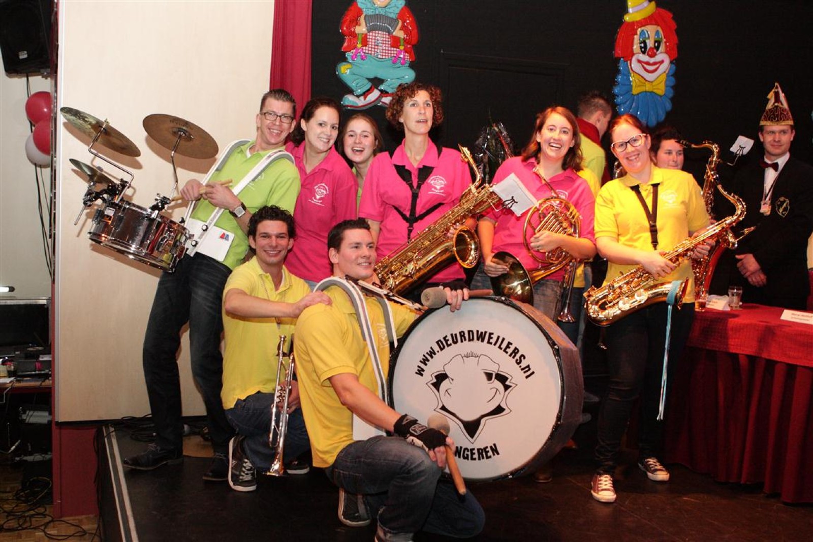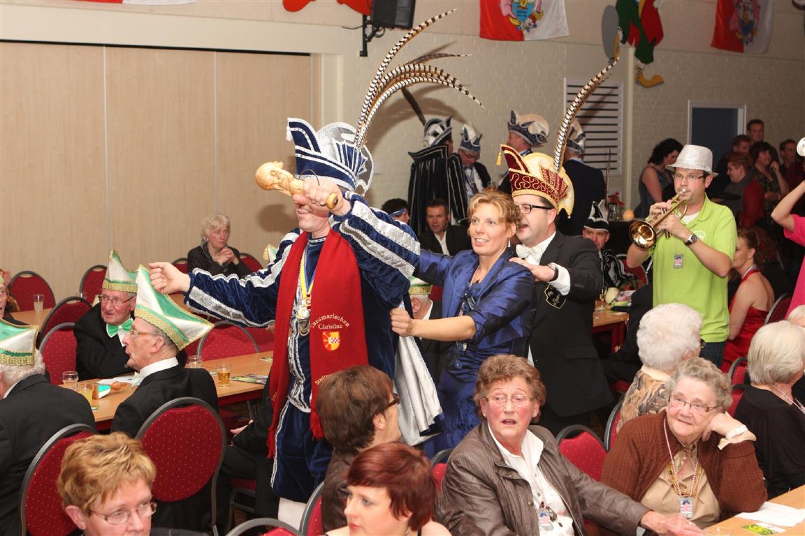 Koud binnen werd gevraagd of we 5 minuten later al op konden, want er was een programmapunt uitgevallen. Prima. Alhoewel we eventjes werden opgehouden om een glimp op een dansgarde te werpen die op dat moment aan het optreden was, gingen we snel de kelder in om om te kleden en te bedenken wat we zouden spelen. En even later betraden we het mooie grote en perfect belichte podium. Na een paar nummers mochten we alweer ophouden, want het programmapunt was er alweer. Maar de toon voor de avond was gezet. Onder luid applaus en gejuich van het publiek verlieten we door de zaal het podium.