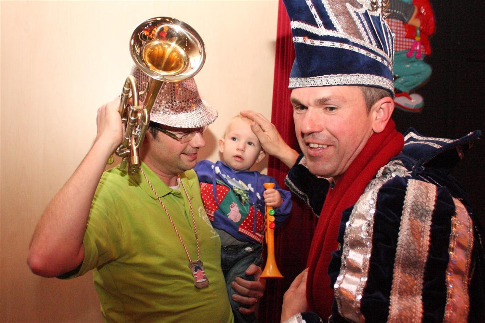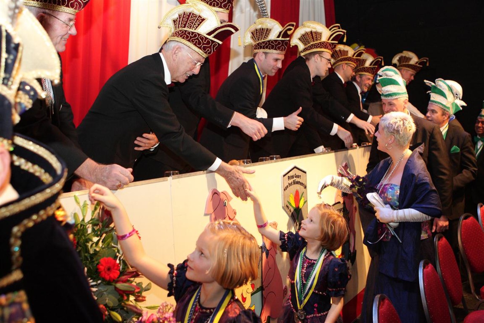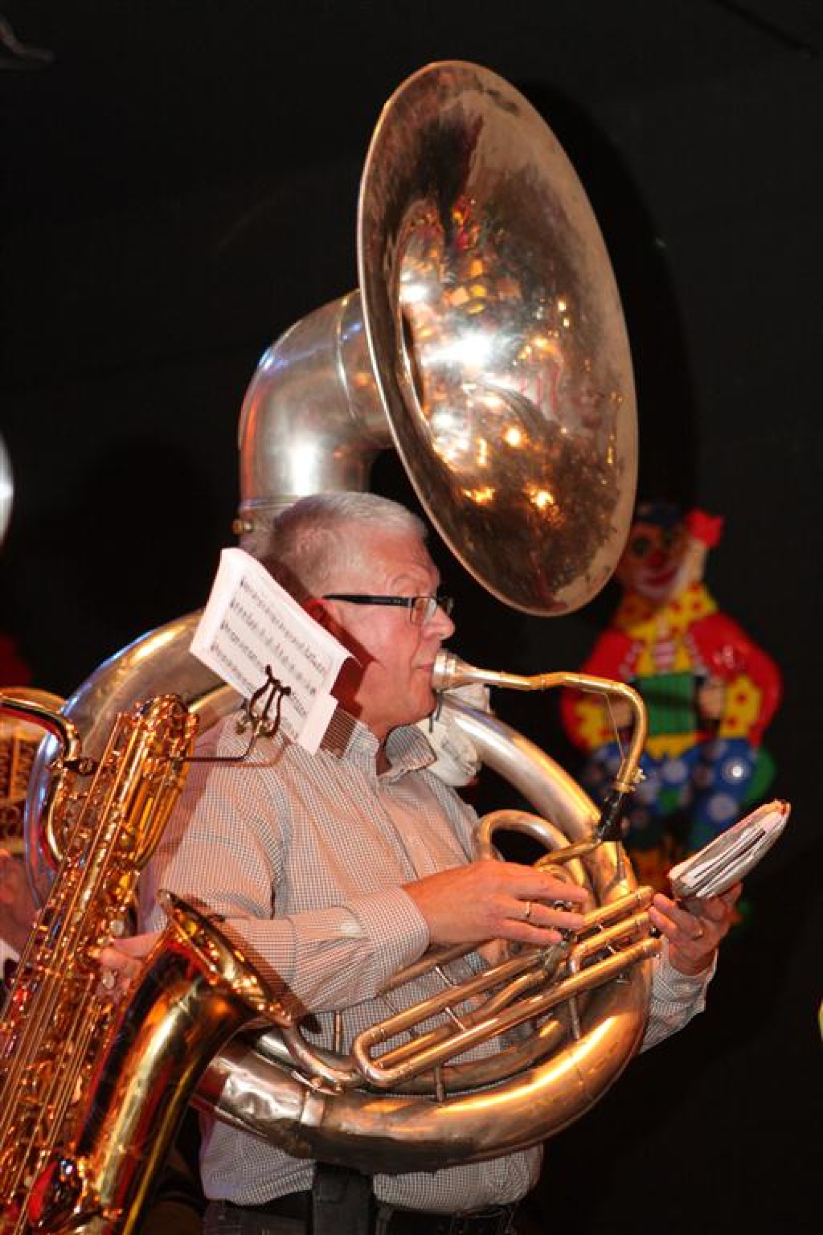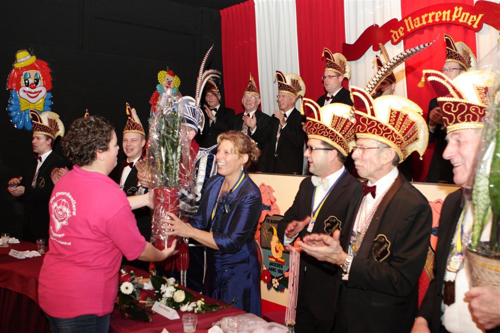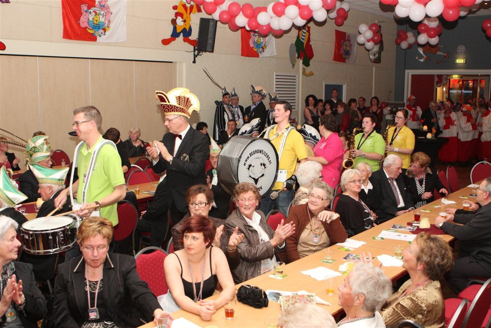 Koud binnen werd gevraagd of we 5 minuten later al op konden, want er was een programmapunt uitgevallen. Prima. Alhoewel we eventjes werden opgehouden om een glimp op een dansgarde te werpen die op dat moment aan het optreden was, gingen we snel de kelder in om om te kleden en te bedenken wat we zouden spelen. En even later betraden we het mooie grote en perfect belichte podium. Na een paar nummers mochten we alweer ophouden, want het programmapunt was er alweer. Maar de toon voor de avond was gezet. Onder luid applaus en gejuich van het publiek verlieten we door de zaal het podium.