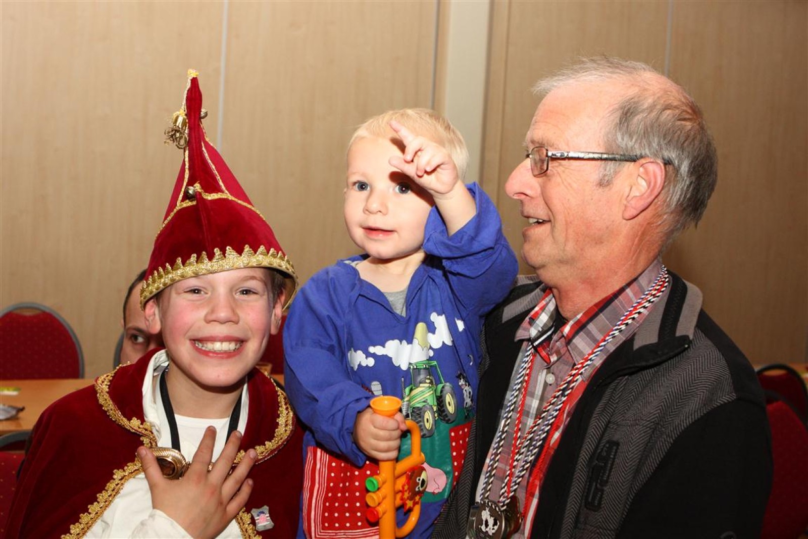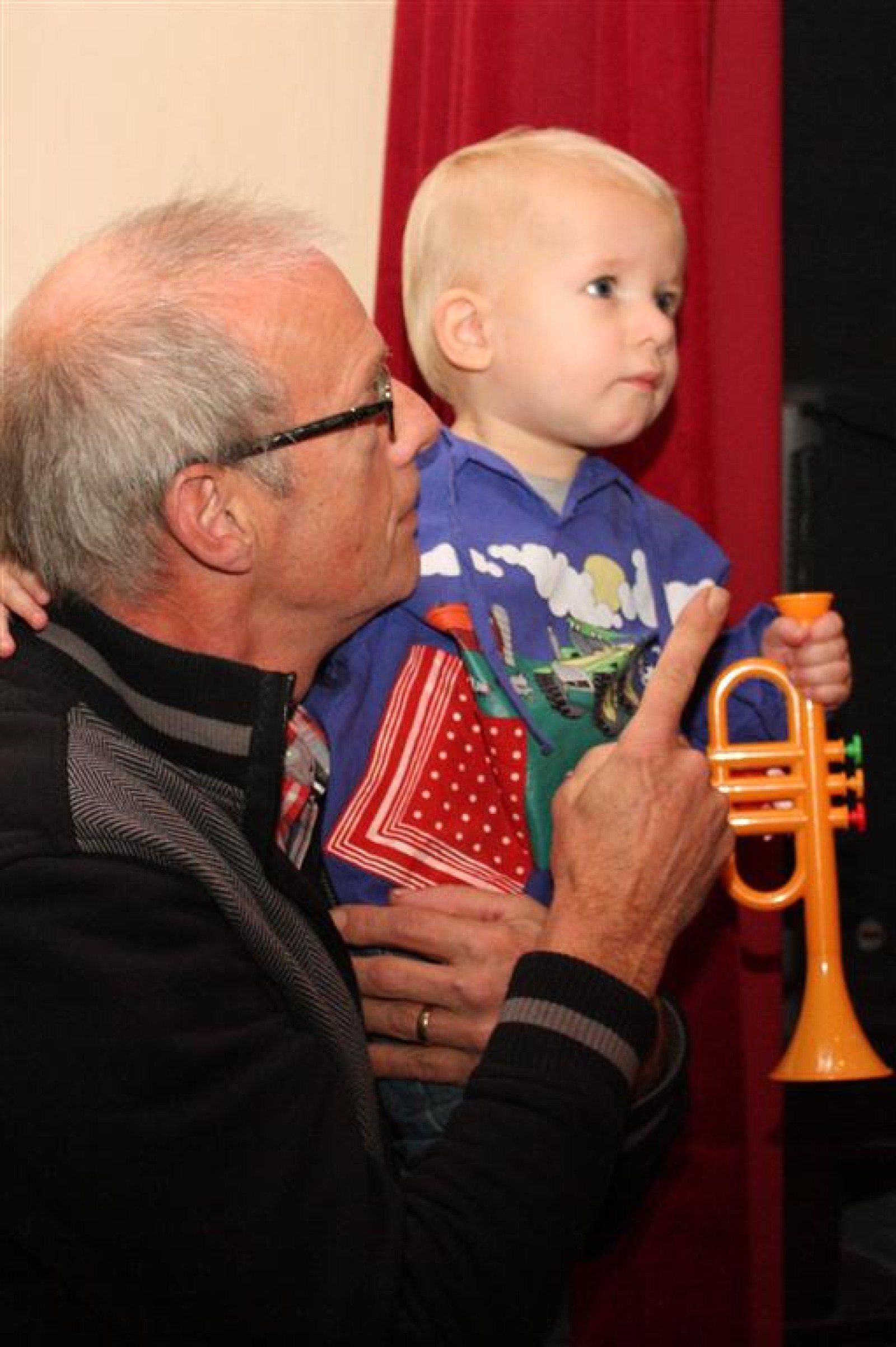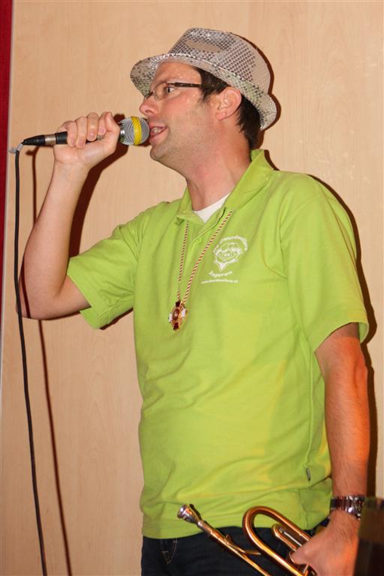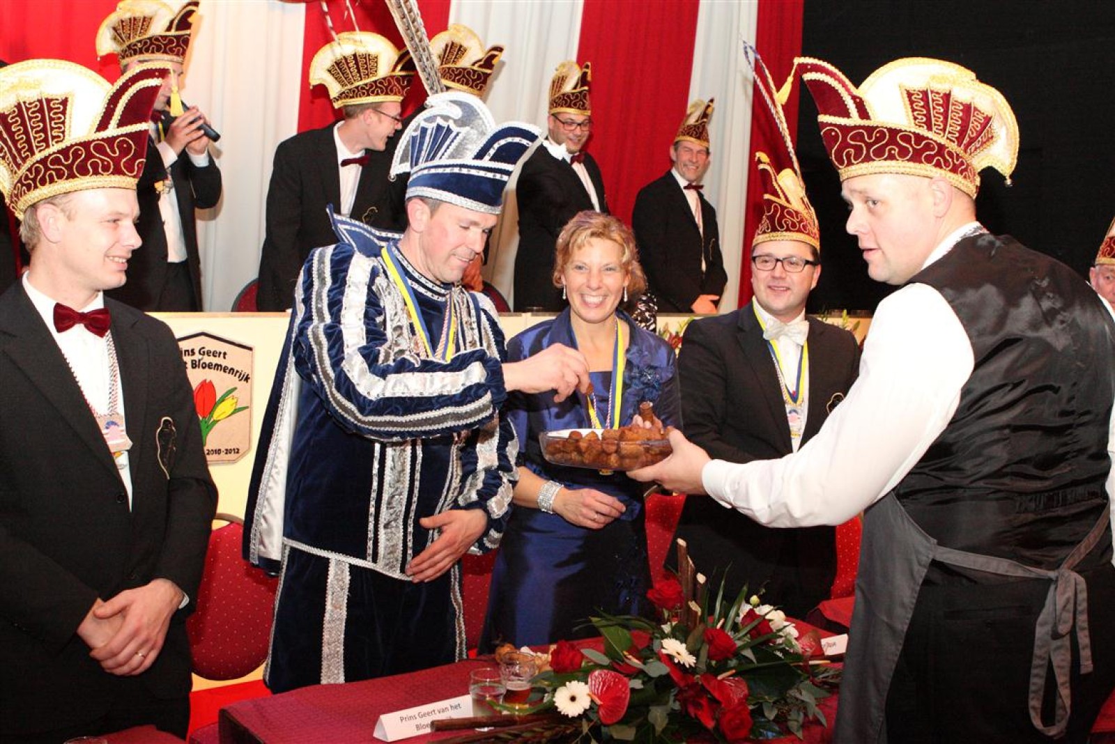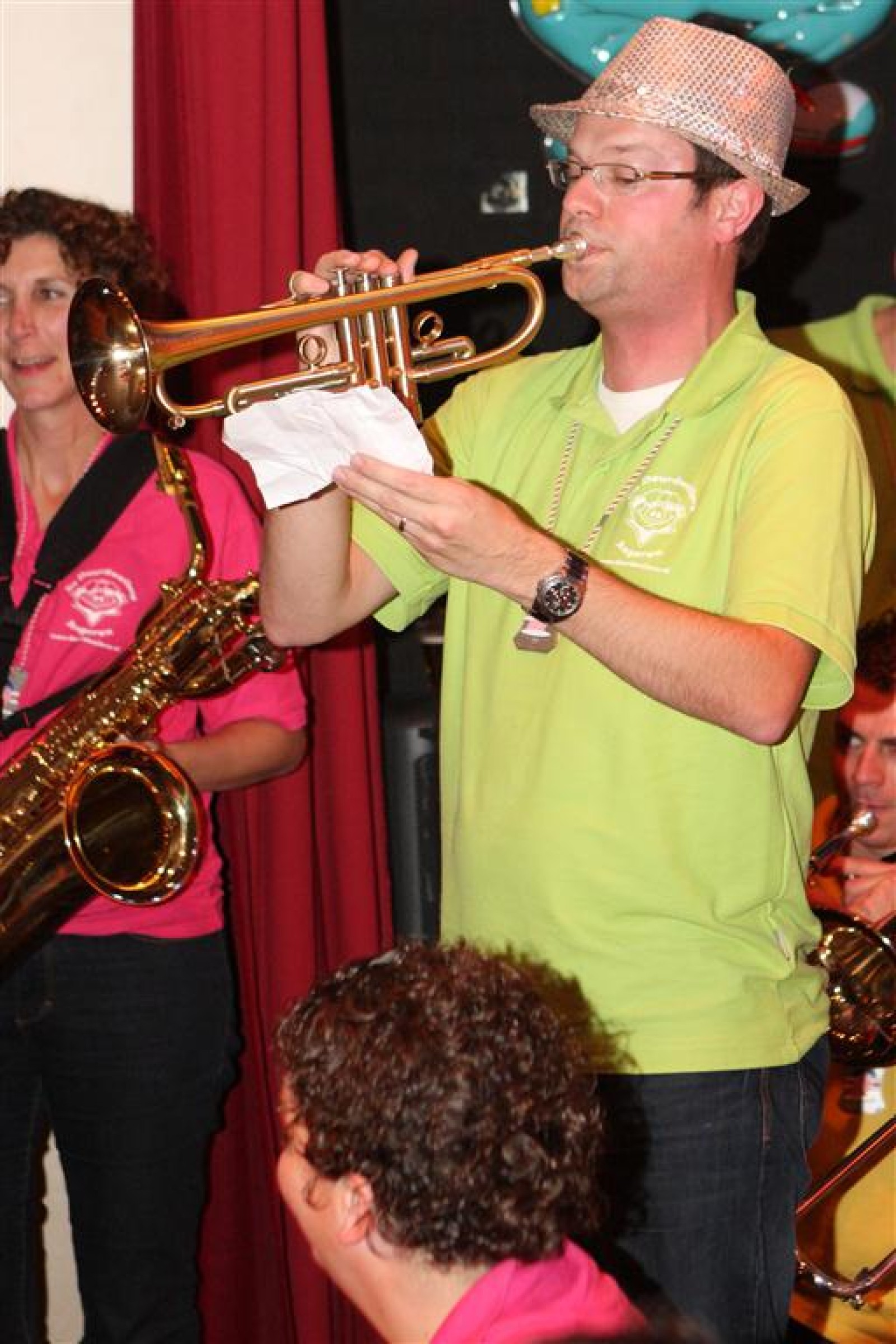 Koud binnen werd gevraagd of we 5 minuten later al op konden, want er was een programmapunt uitgevallen. Prima. Alhoewel we eventjes werden opgehouden om een glimp op een dansgarde te werpen die op dat moment aan het optreden was, gingen we snel de kelder in om om te kleden en te bedenken wat we zouden spelen. En even later betraden we het mooie grote en perfect belichte podium. Na een paar nummers mochten we alweer ophouden, want het programmapunt was er alweer. Maar de toon voor de avond was gezet. Onder luid applaus en gejuich van het publiek verlieten we door de zaal het podium.