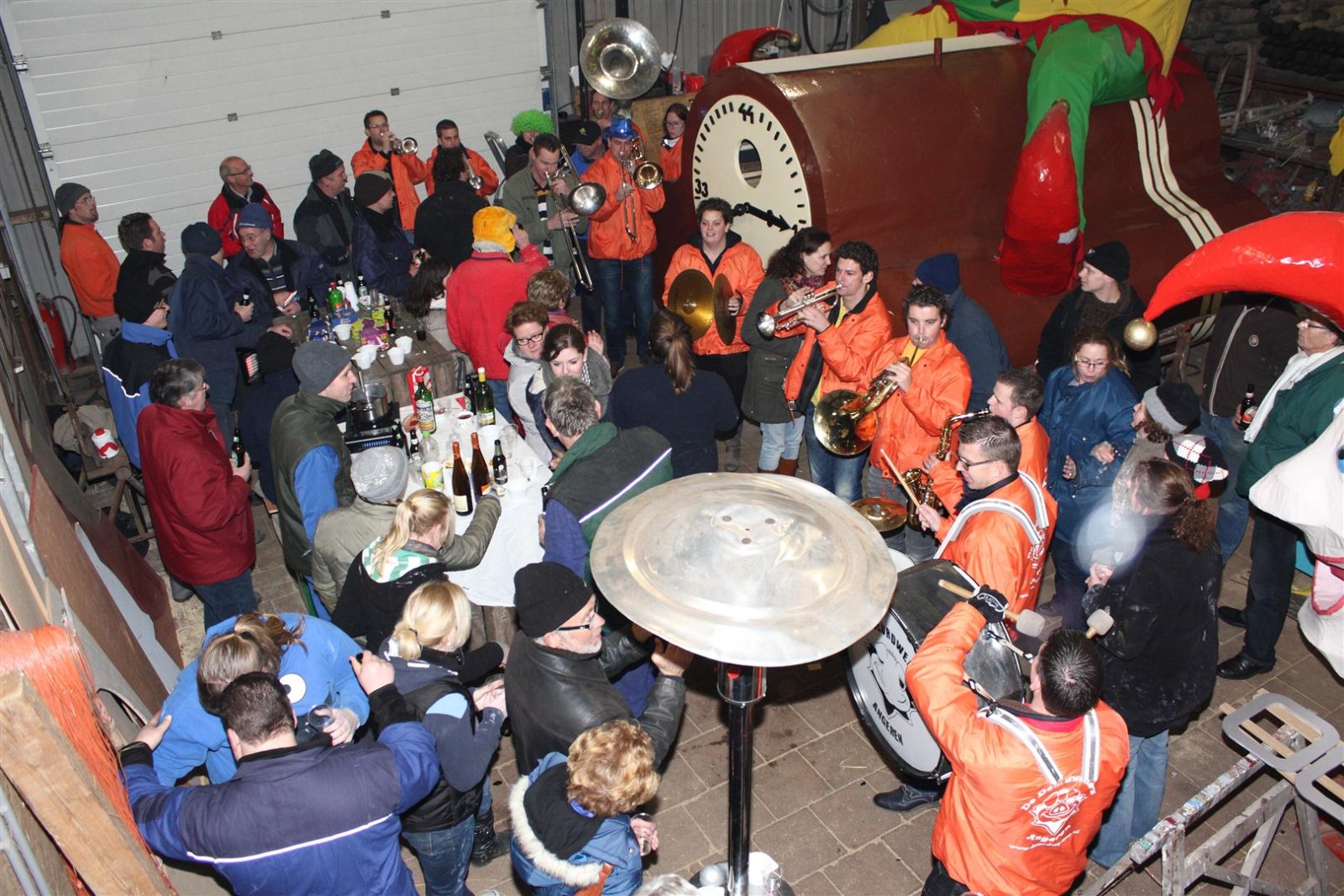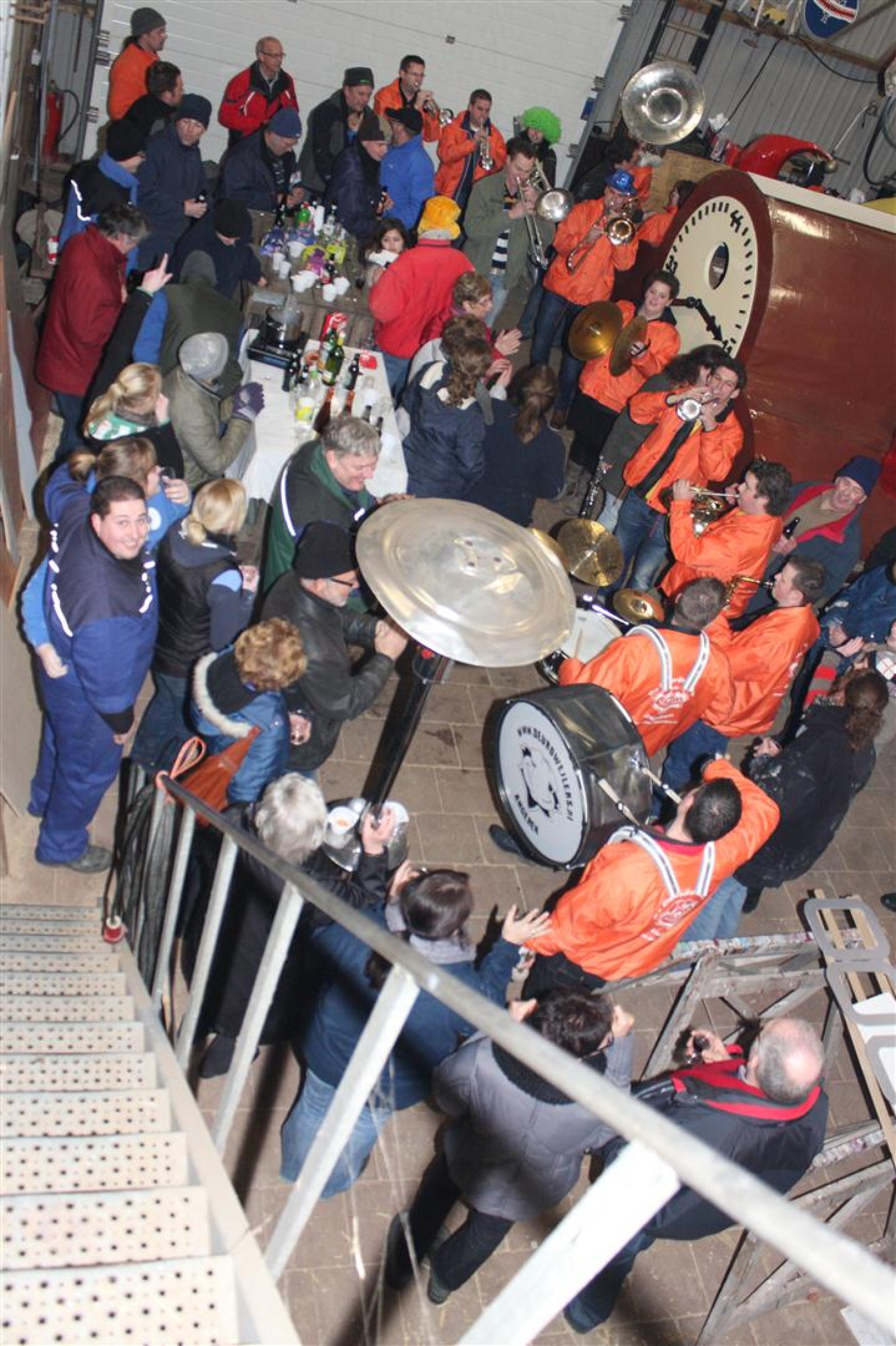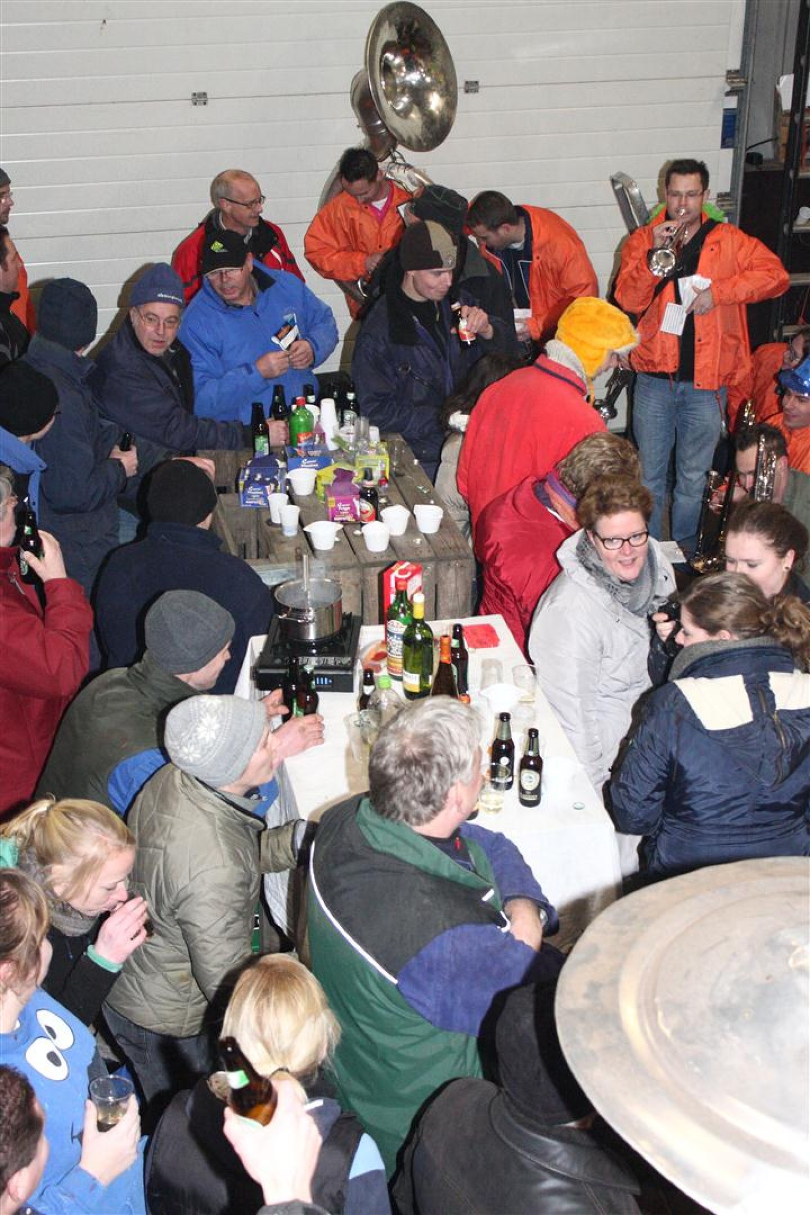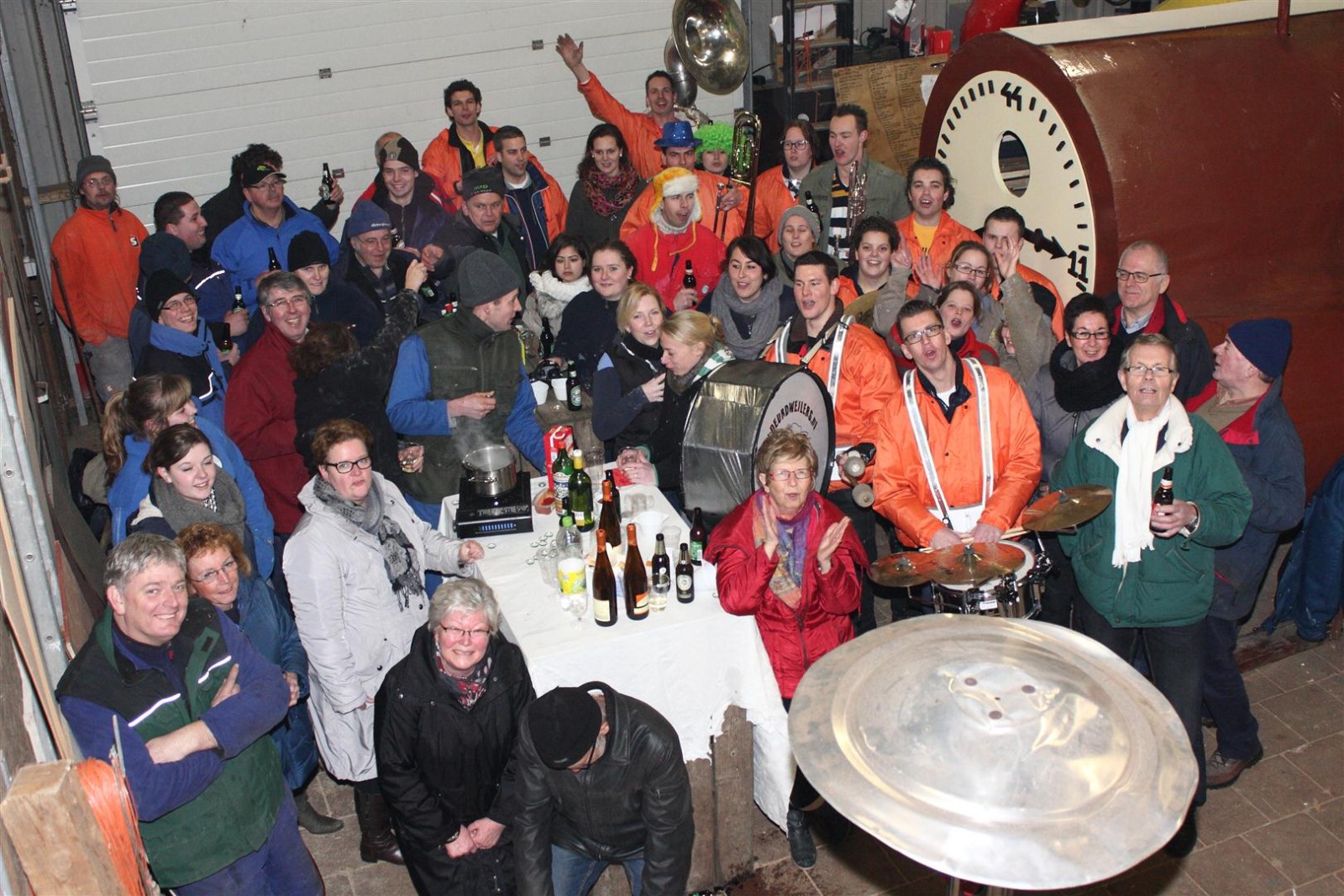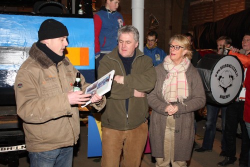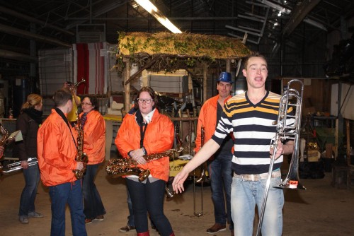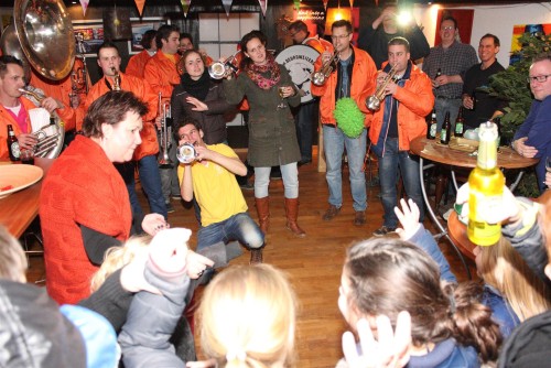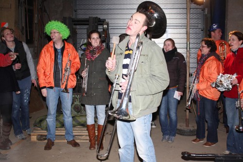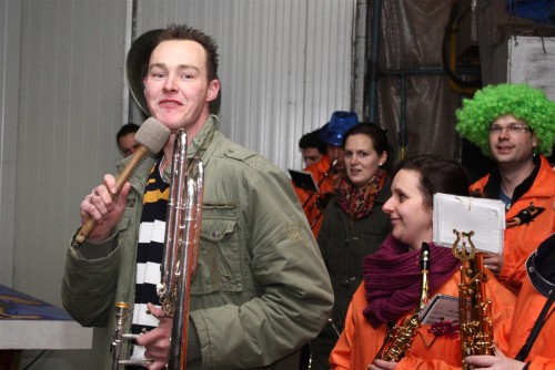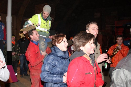 Een traditie die vorig jaar is begonnen wordt vanavond voortgezet. Als eerste werd een bezoekje gebracht aan TOK/FC Knudde. Het is dat het dak van de loods een meter of 5 hoog was anders was het eraf gegaan.