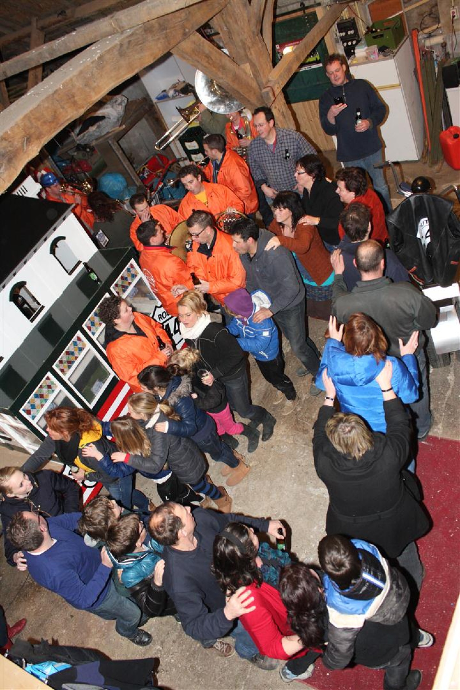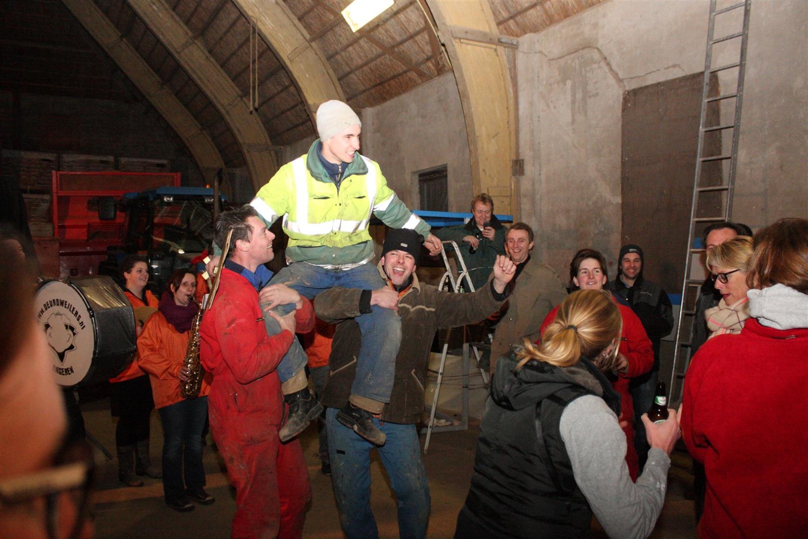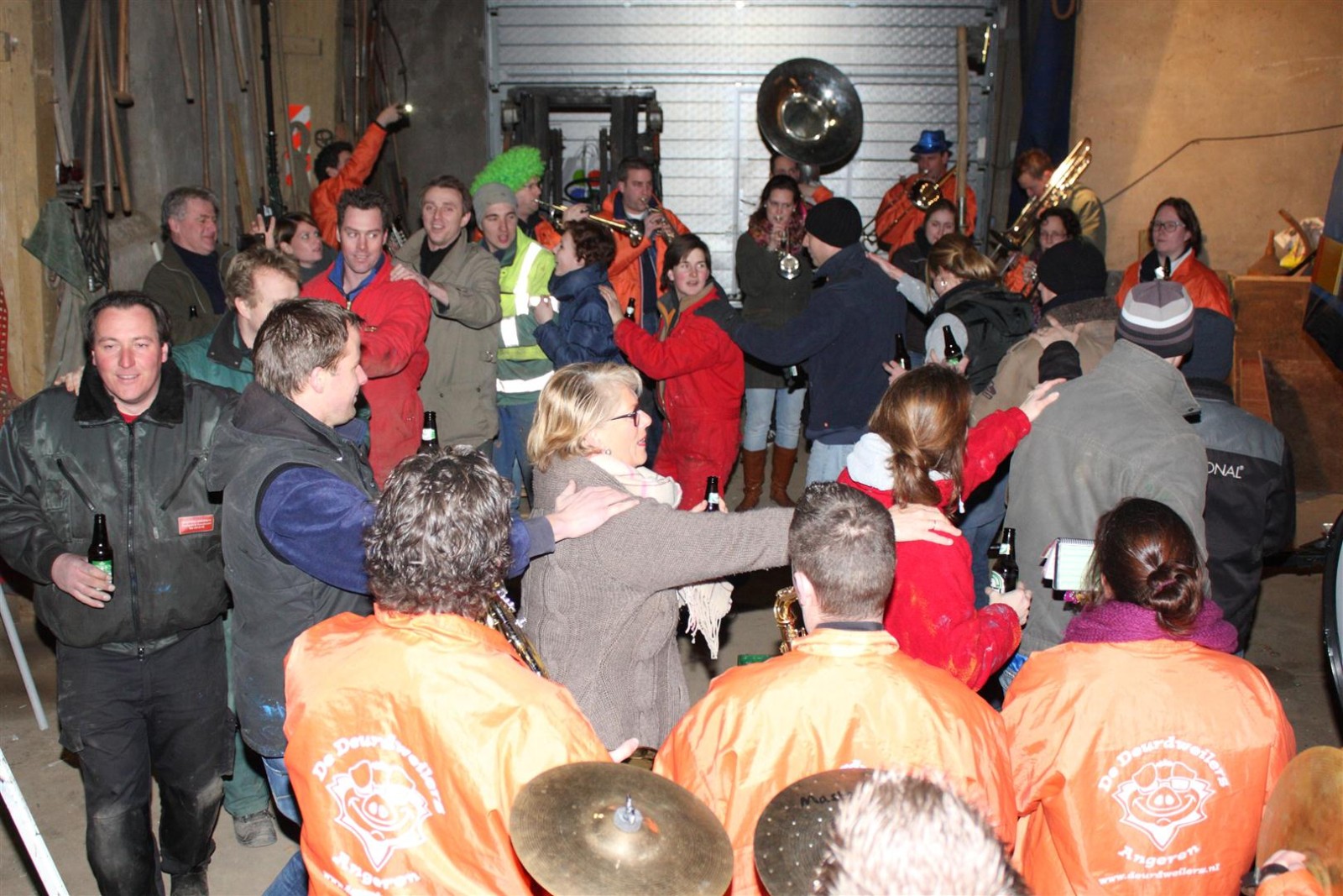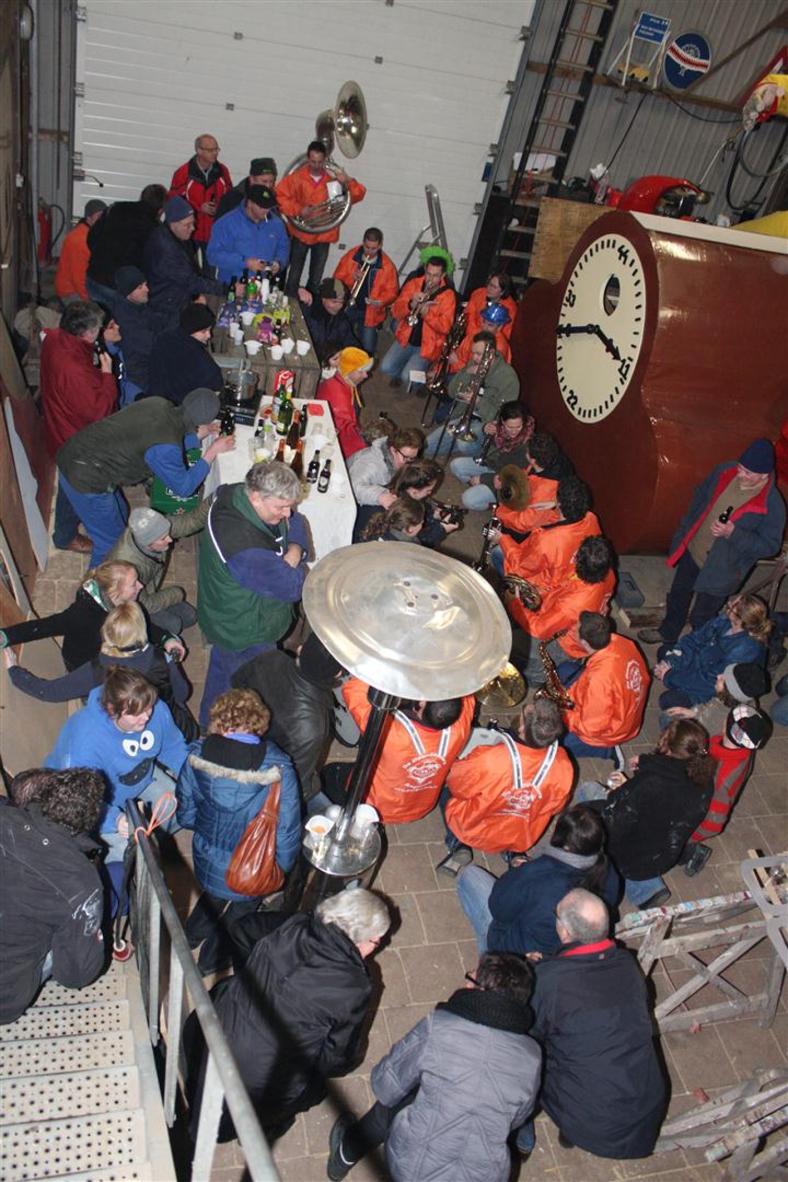 Een traditie die vorig jaar is begonnen wordt vanavond voortgezet. Als eerste werd een bezoekje gebracht aan TOK/FC Knudde. Het is dat het dak van de loods een meter of 5 hoog was anders was het eraf gegaan.
