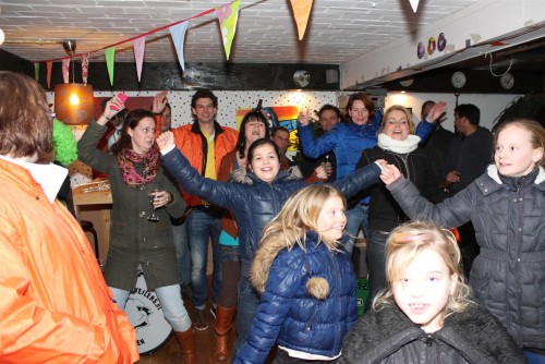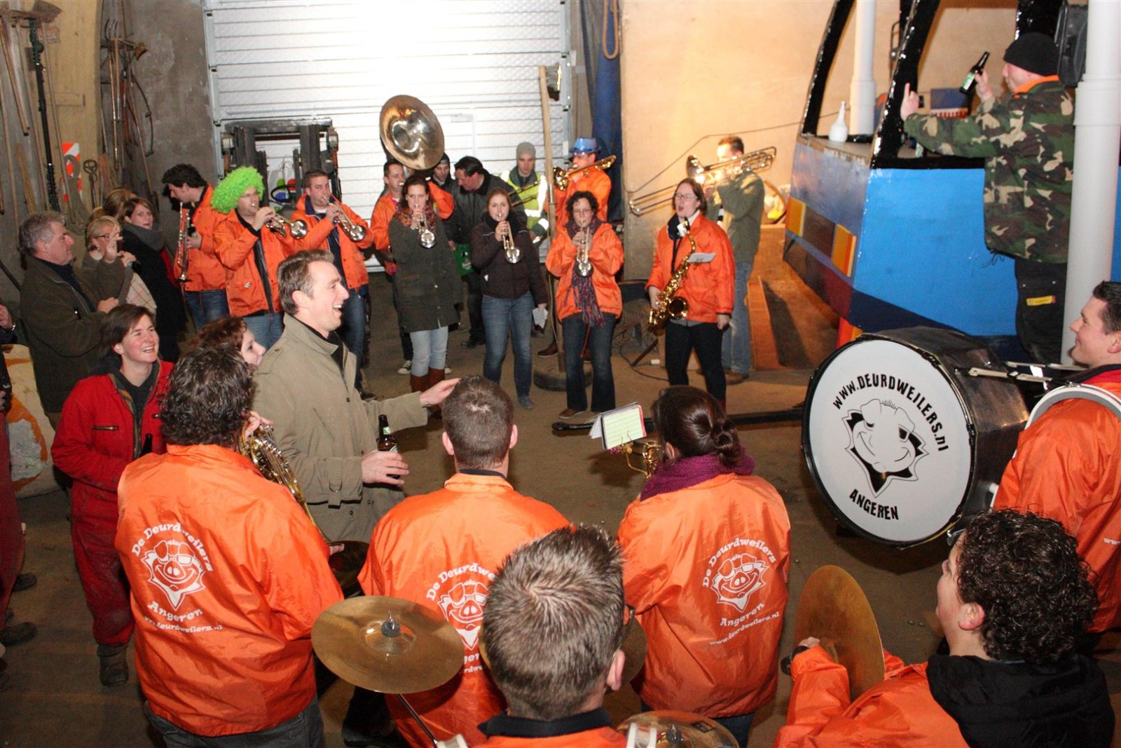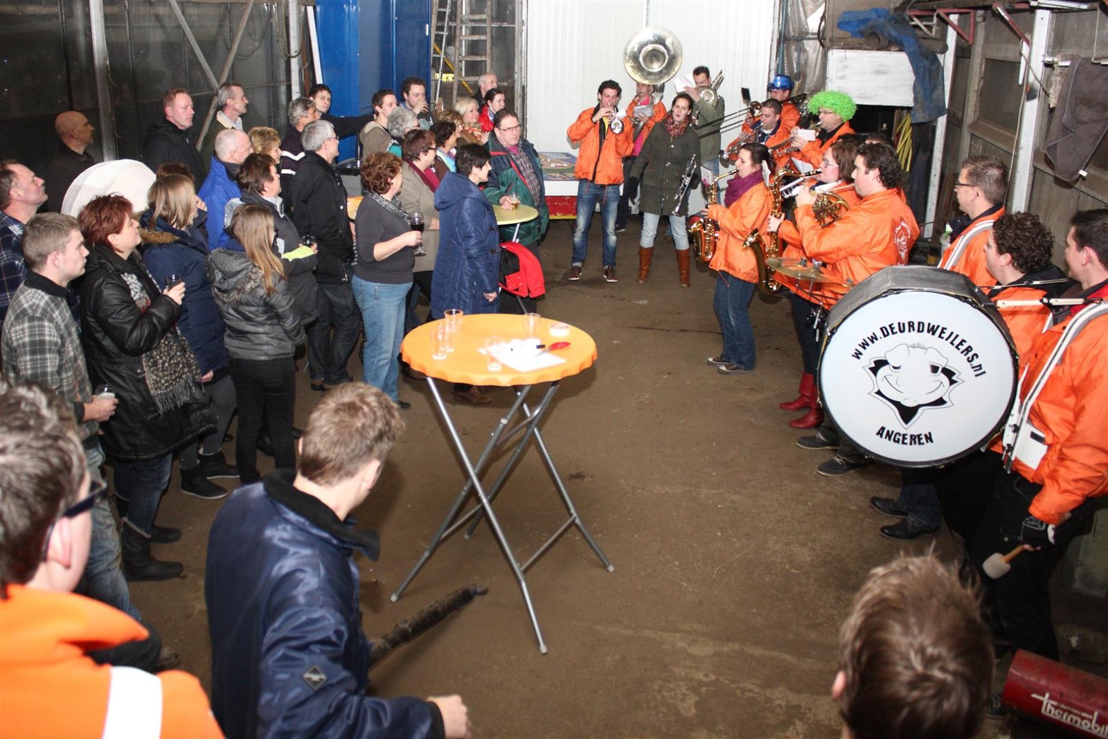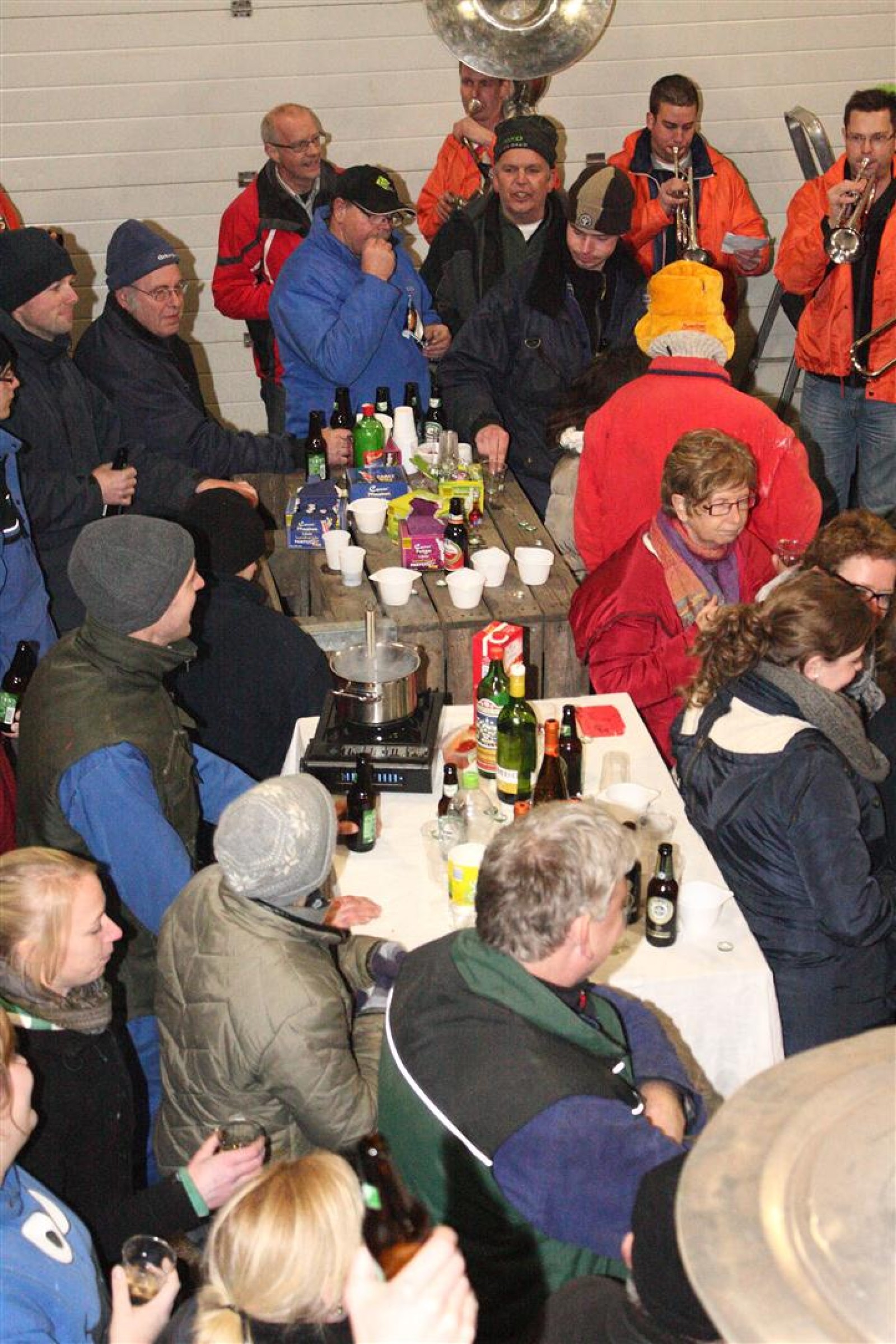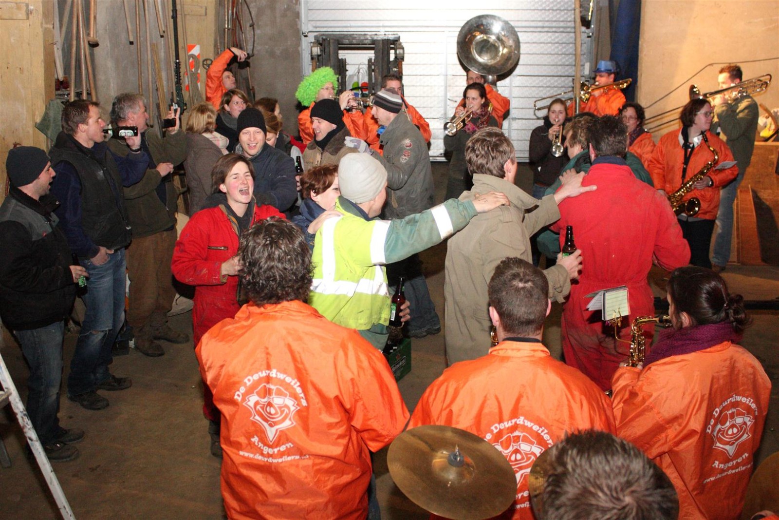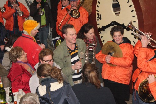 Een traditie die vorig jaar is begonnen wordt vanavond voortgezet. Als eerste werd een bezoekje gebracht aan TOK/FC Knudde. Het is dat het dak van de loods een meter of 5 hoog was anders was het eraf gegaan.