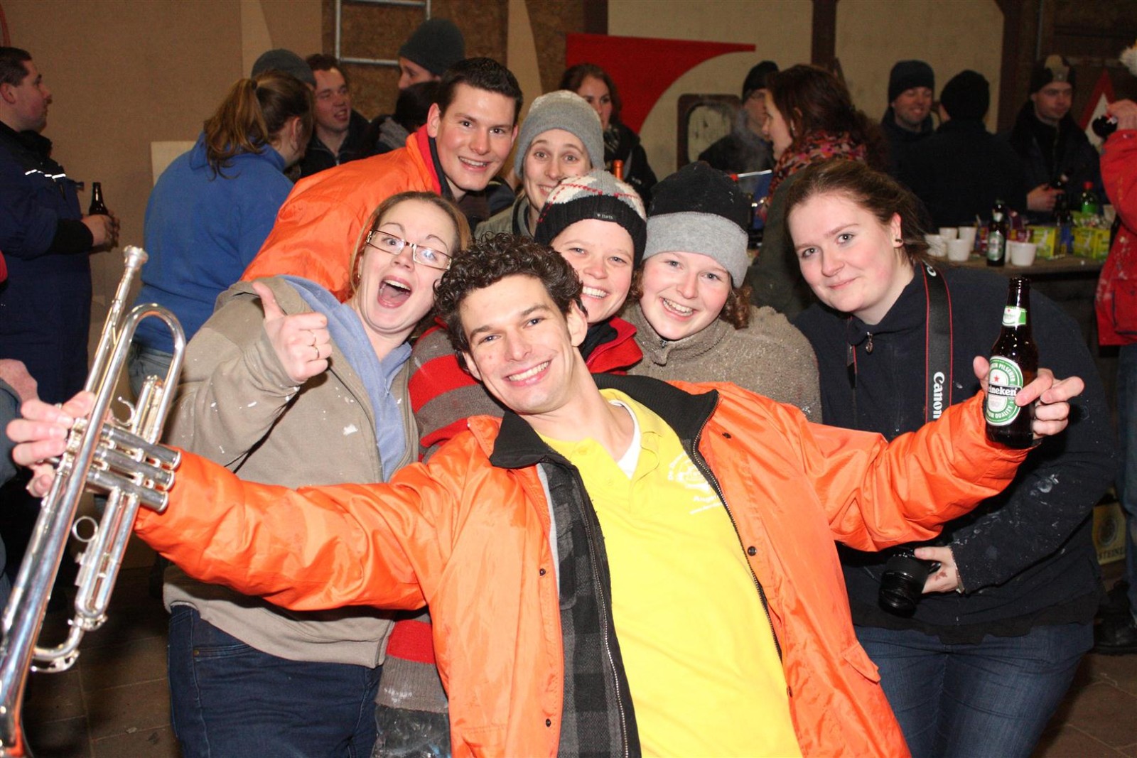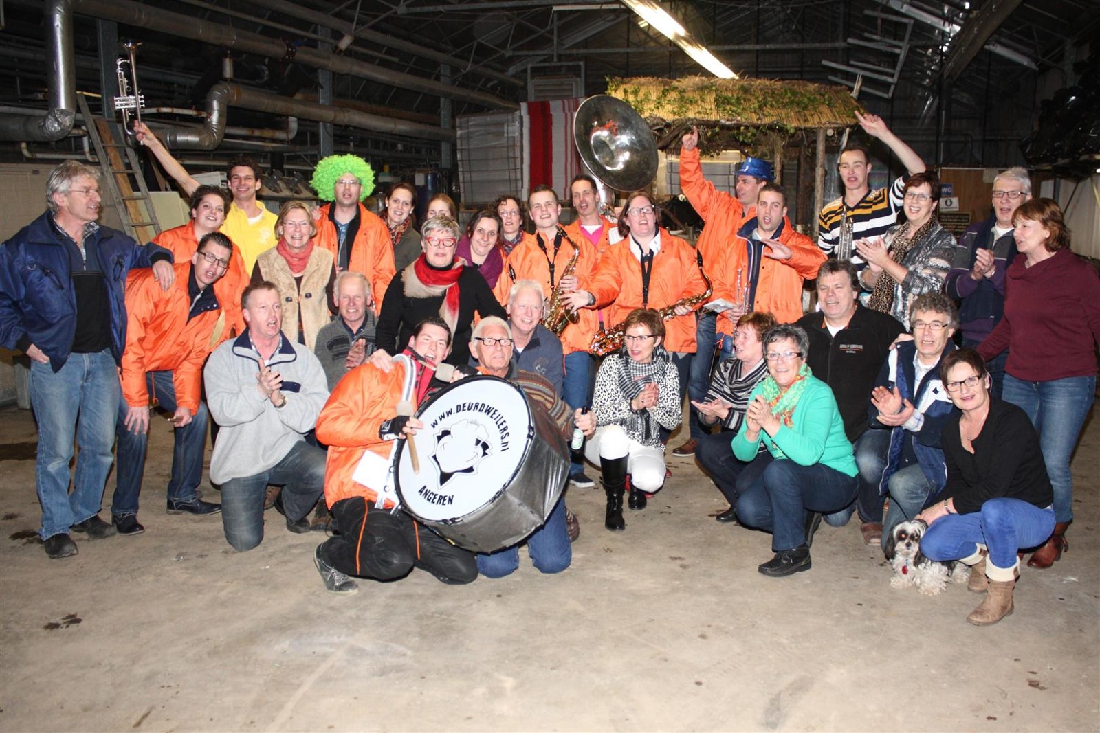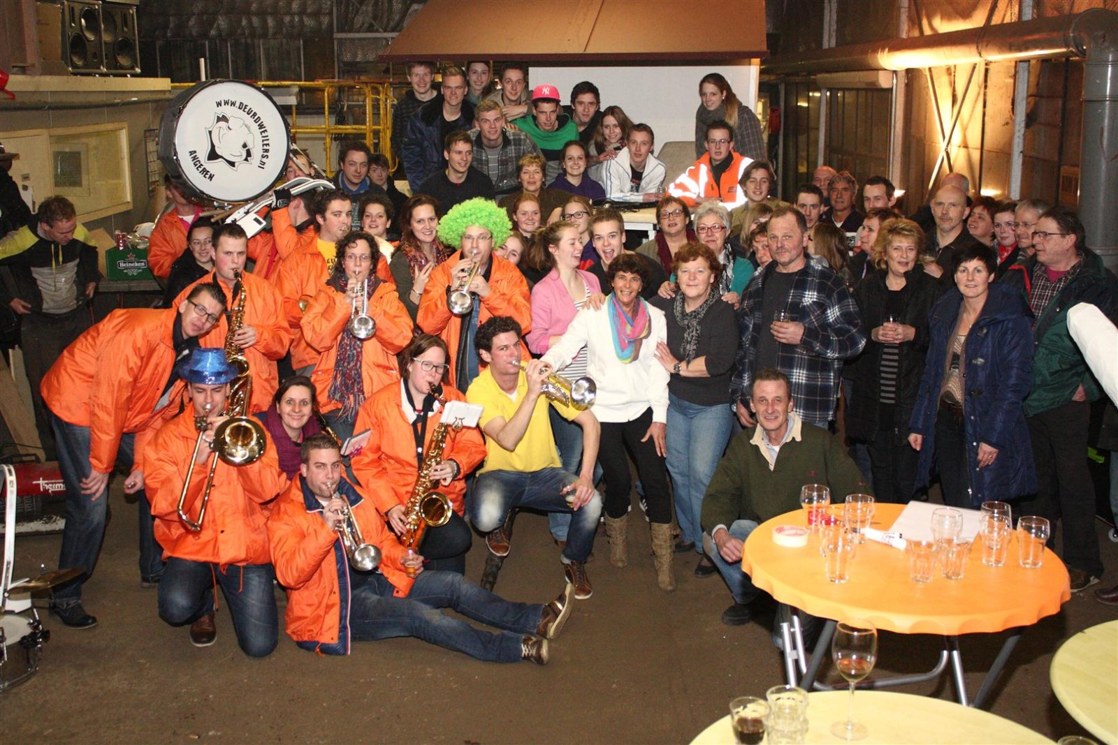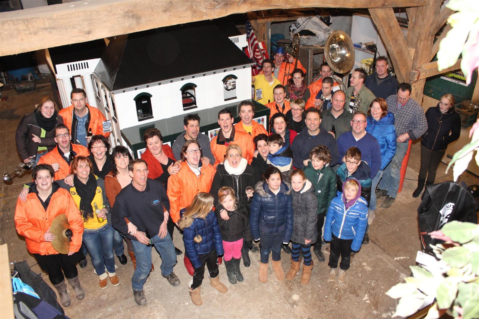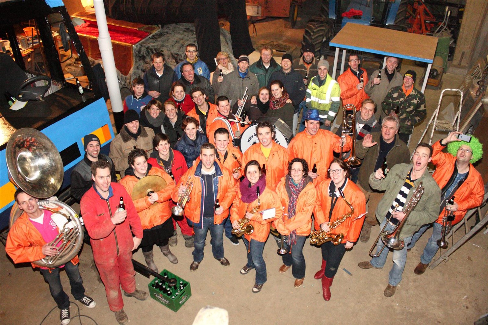 Aangezien fotograaf Henk niet iedereen op de foto kreeg werd de heftruck erbij gereden om hem van bovenaf een foto te laten maken.