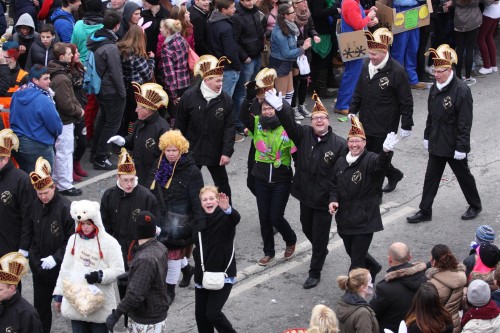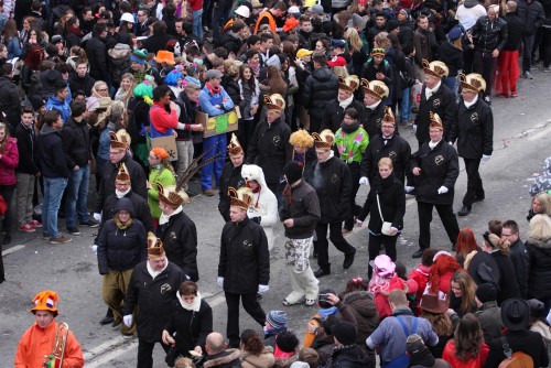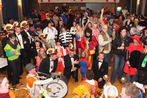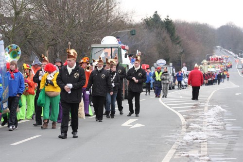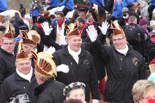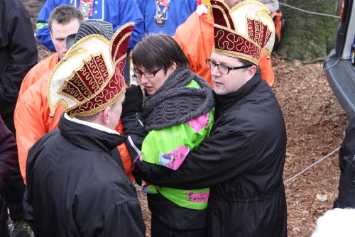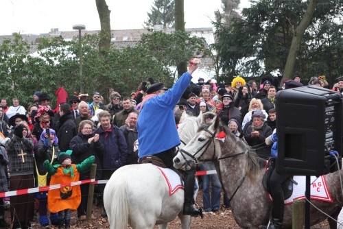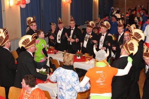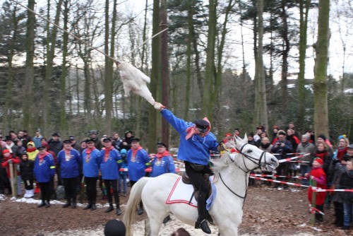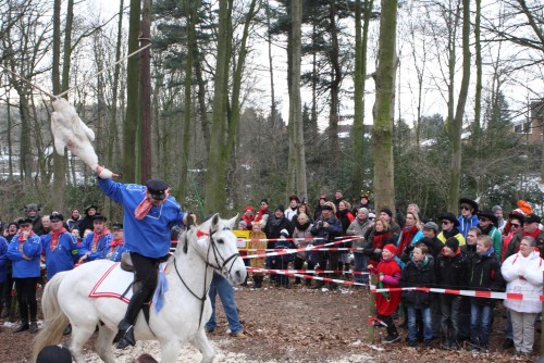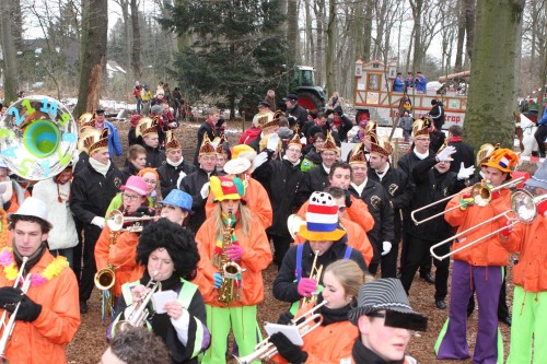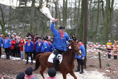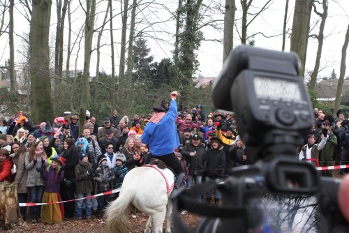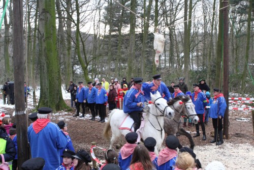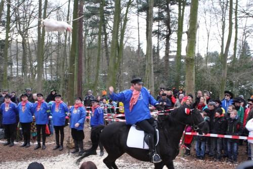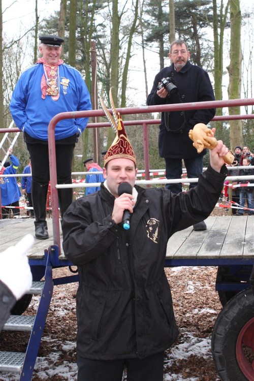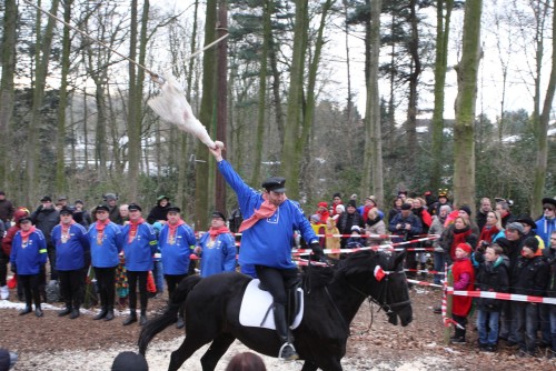 Na een sfeervol ontvangst ging het gezelschap in optocht naar het bos waar het jaarlijkse Ganzentrekken plaatsvond. (zie filmpje van vorig jaar) Toen de nieuwe koning bekend was kon het inmiddels verkleumde gezelschap de optocht vervolgen.