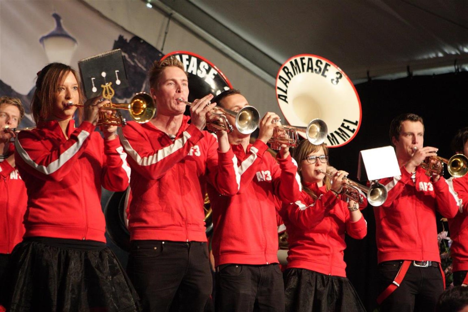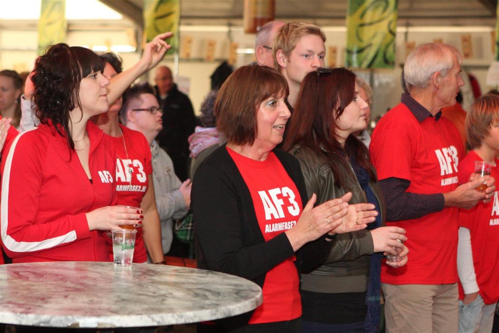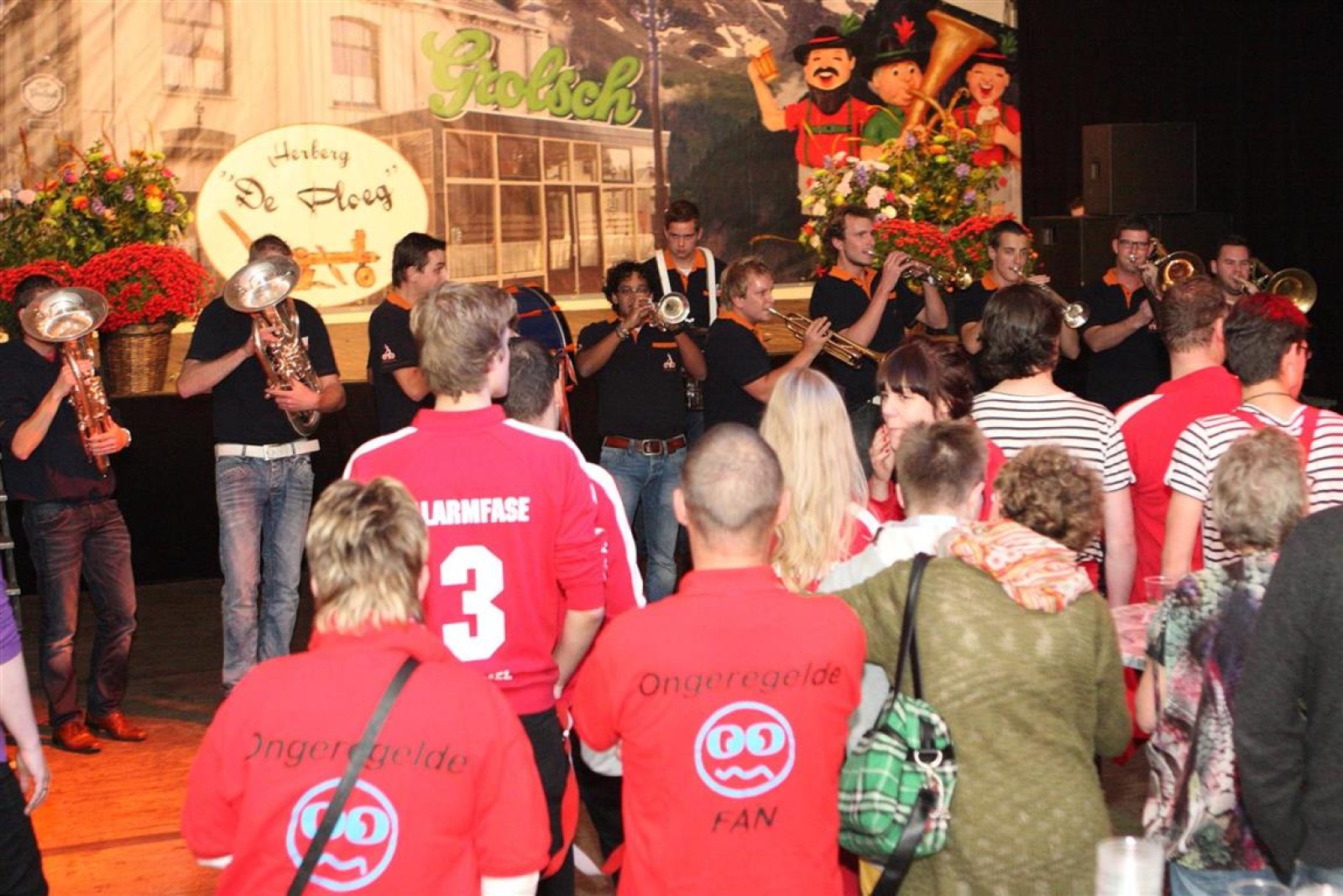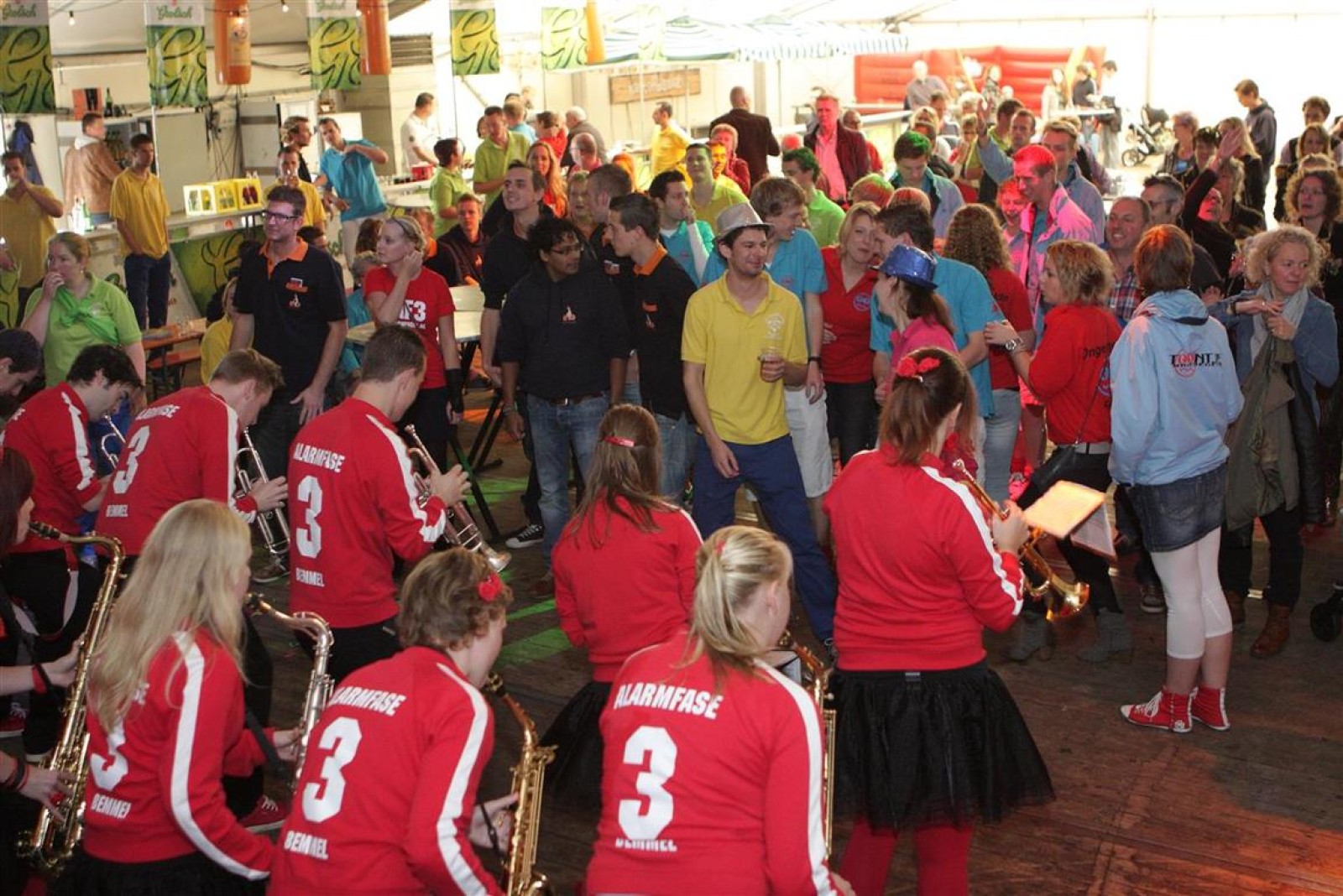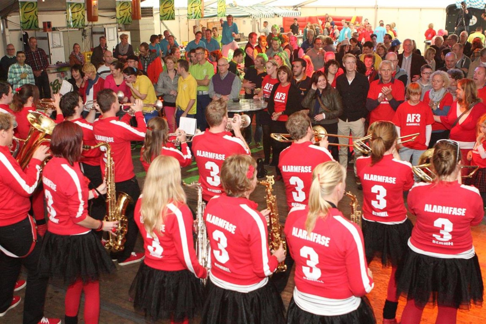 Alarmfase3 uit Bemmel had vrijwel een thuiswedstrijd, maar waren toch in hun rode uit-tenue aanwezig. En in het publiek doken steeds meer rode t-shirtjes op. De Alarmfase3 promotie draaide op volle toeren, net als de muzikanten die volle bak gingen op het podium.