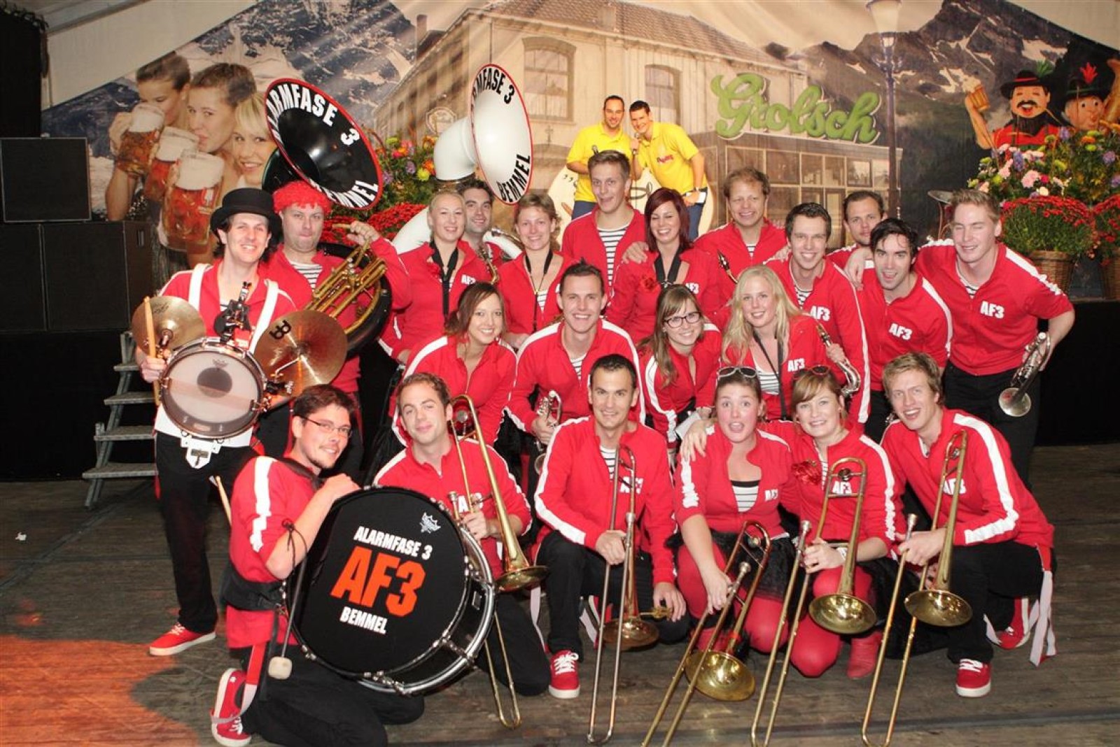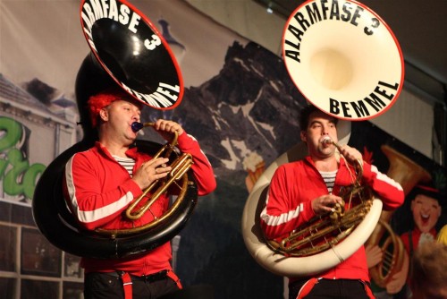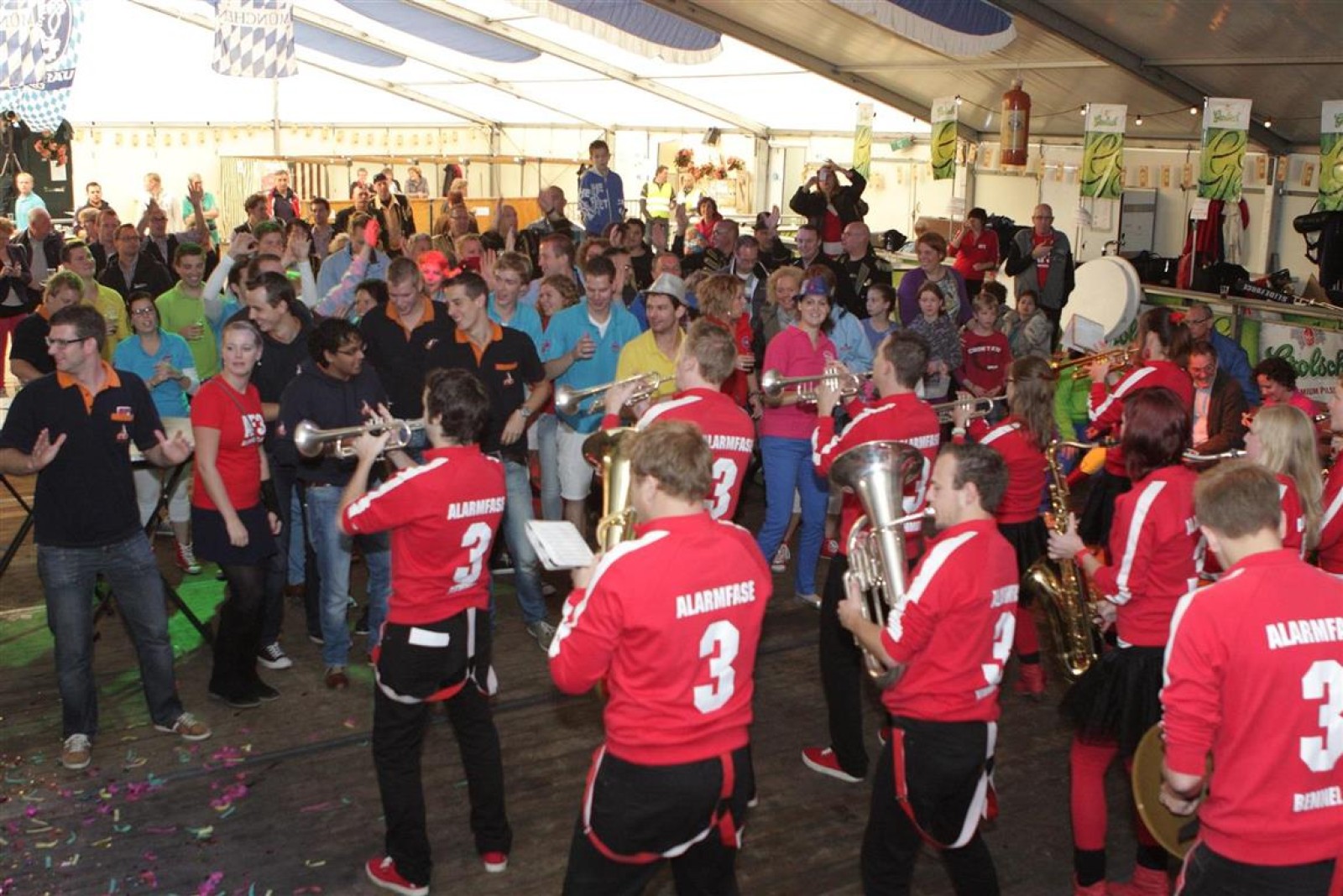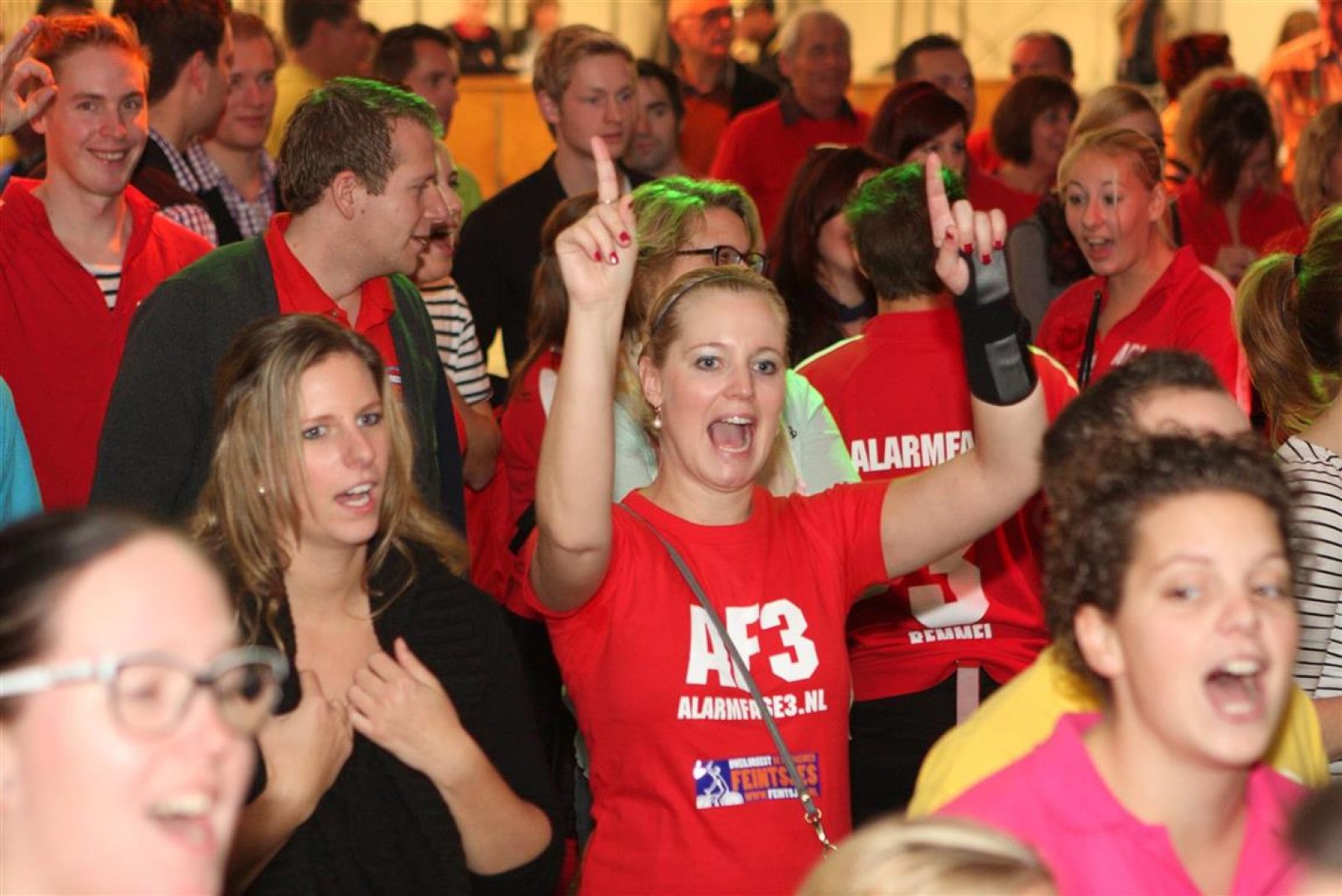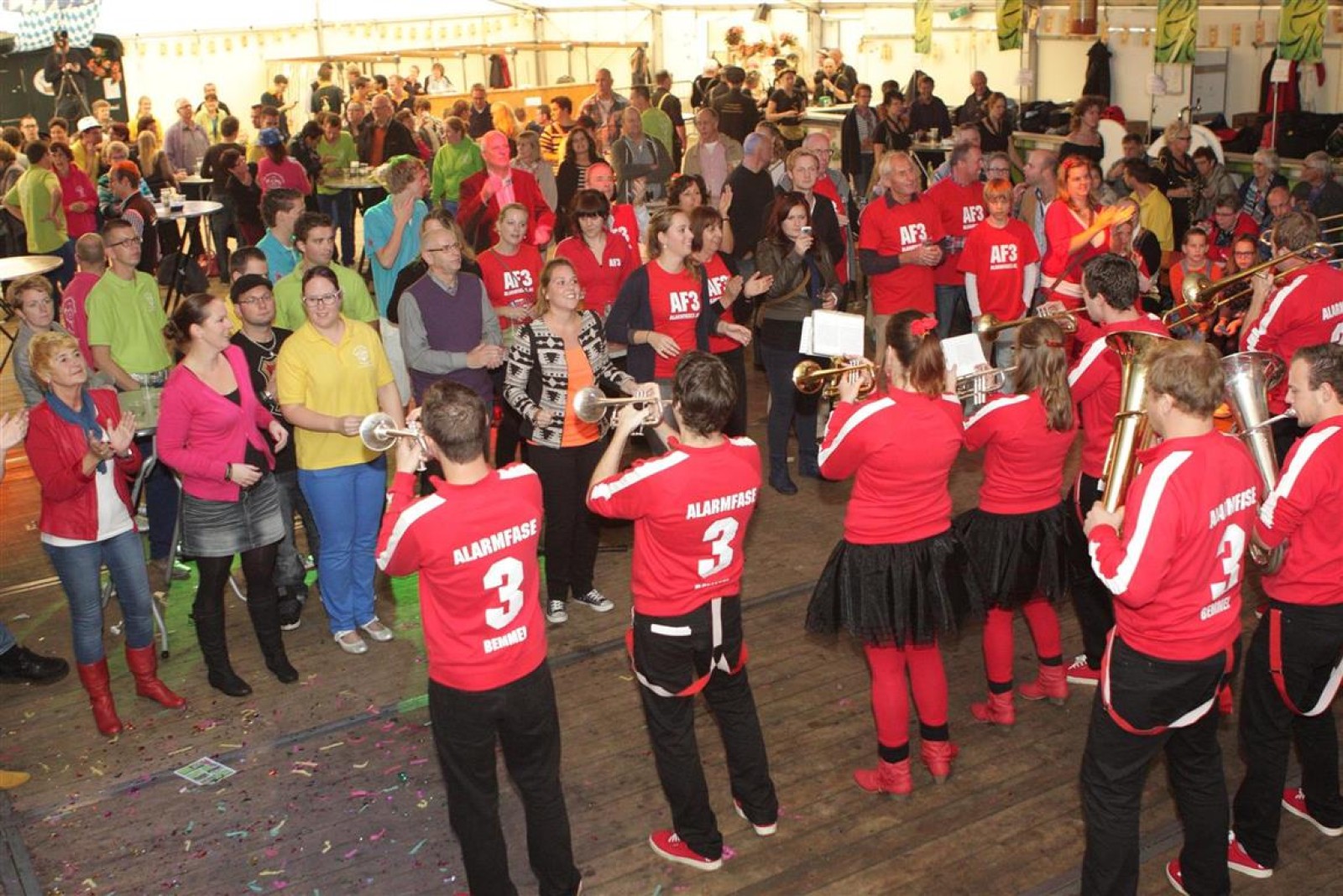 Alarmfase3 uit Bemmel had vrijwel een thuiswedstrijd, maar waren toch in hun rode uit-tenue aanwezig. En in het publiek doken steeds meer rode t-shirtjes op. De Alarmfase3 promotie draaide op volle toeren, net als de muzikanten die volle bak gingen op het podium.