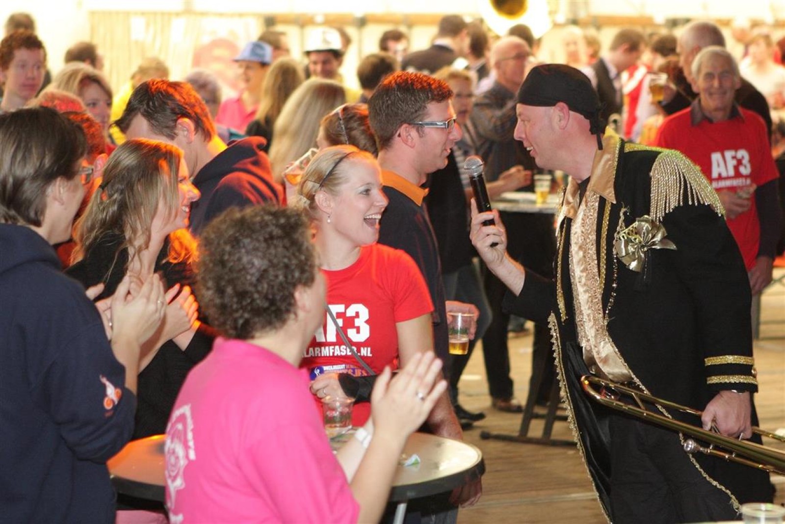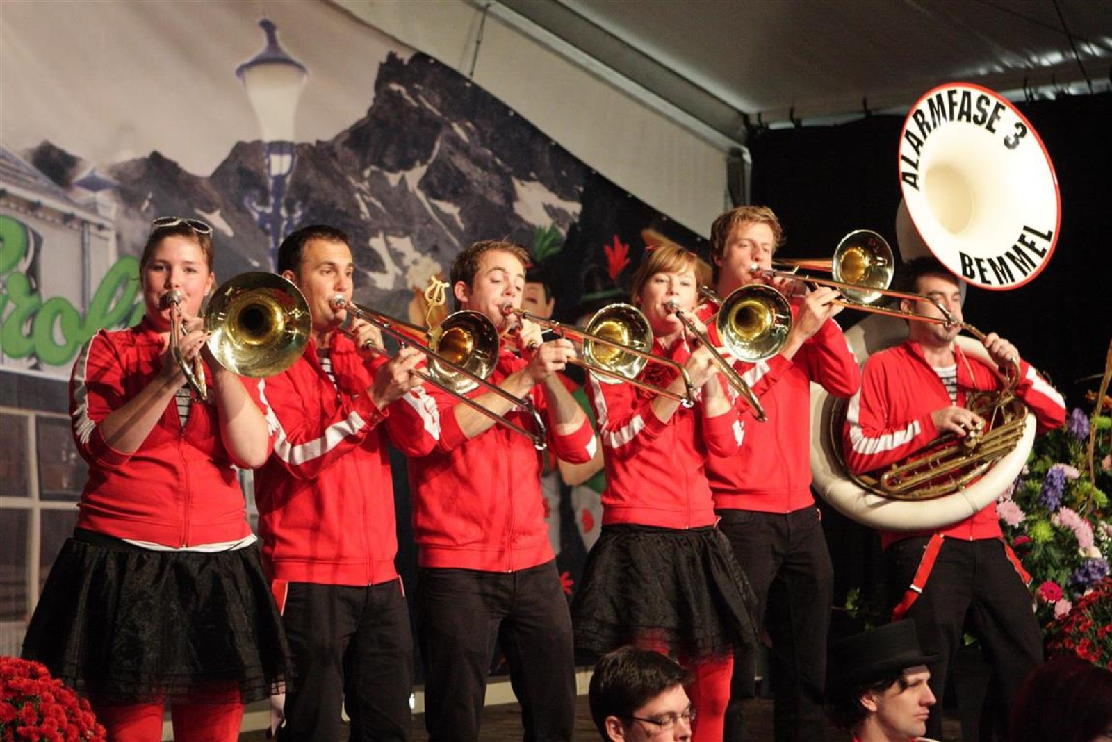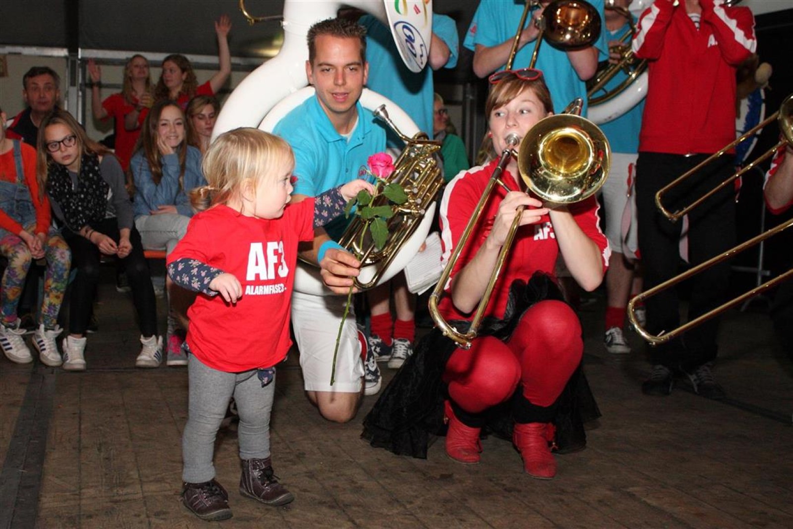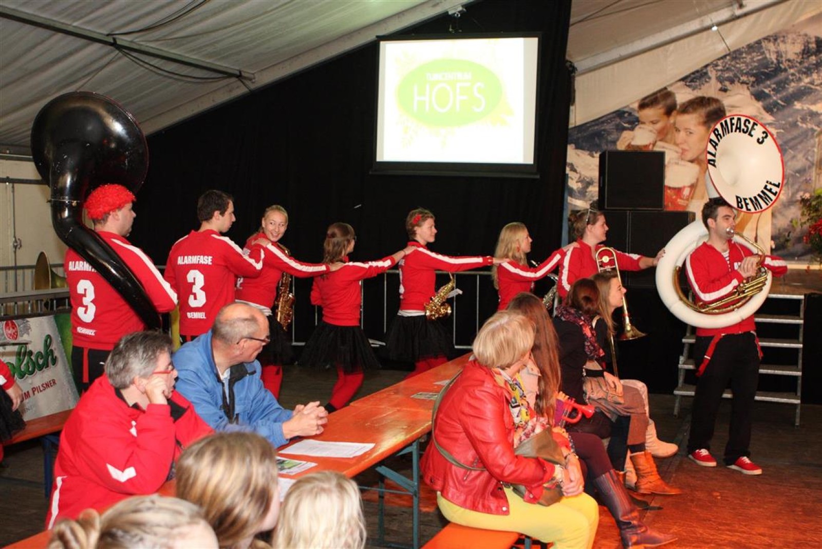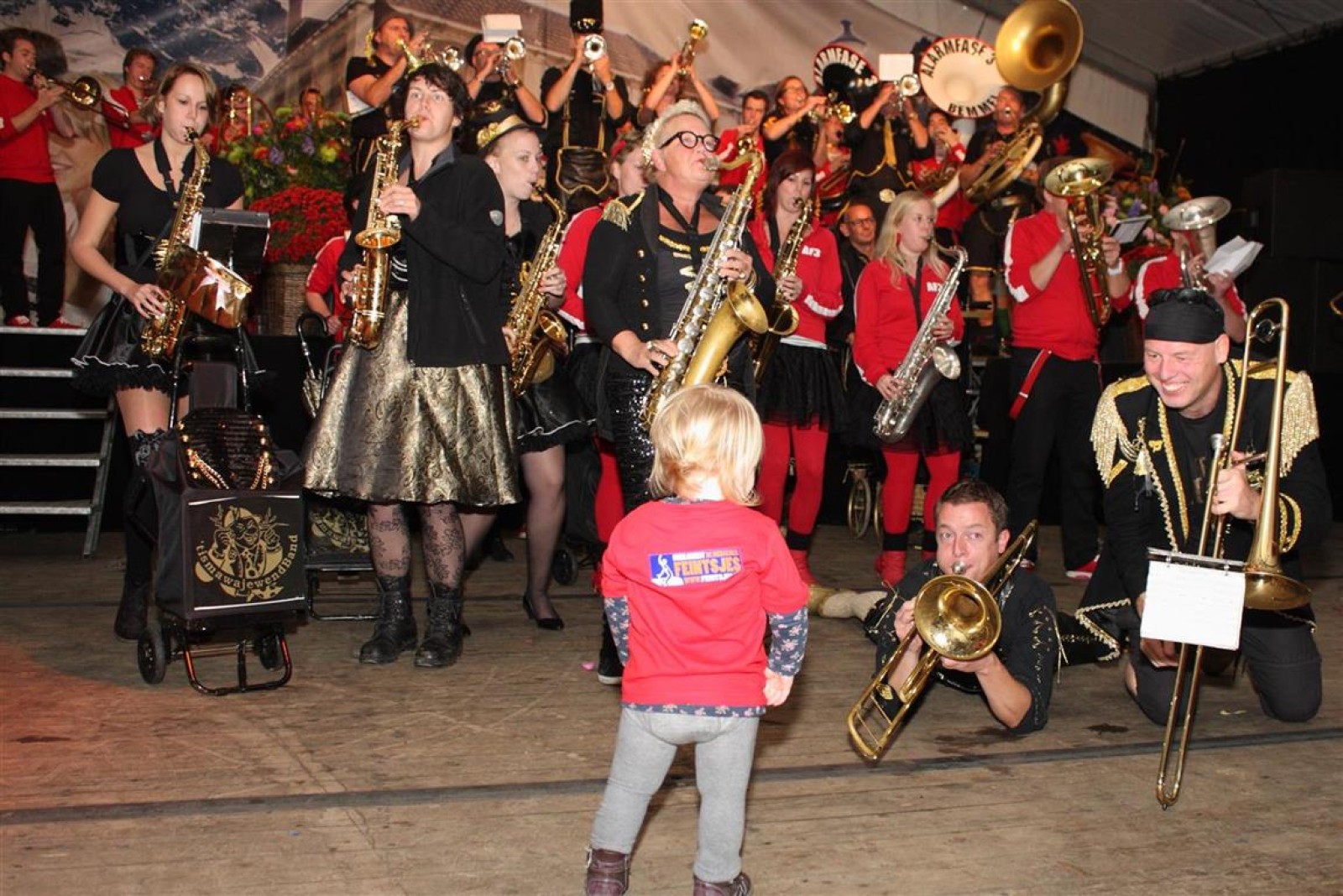 Alarmfase3 uit Bemmel had vrijwel een thuiswedstrijd, maar waren toch in hun rode uit-tenue aanwezig. En in het publiek doken steeds meer rode t-shirtjes op. De Alarmfase3 promotie draaide op volle toeren, net als de muzikanten die volle bak gingen op het podium.