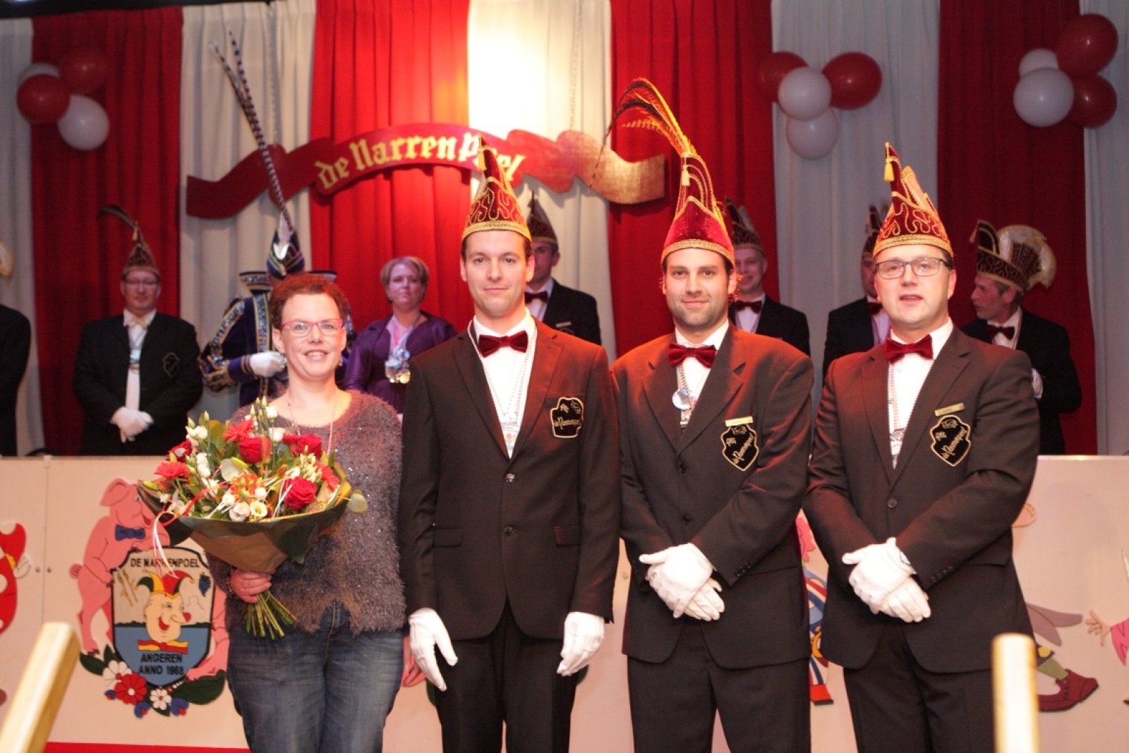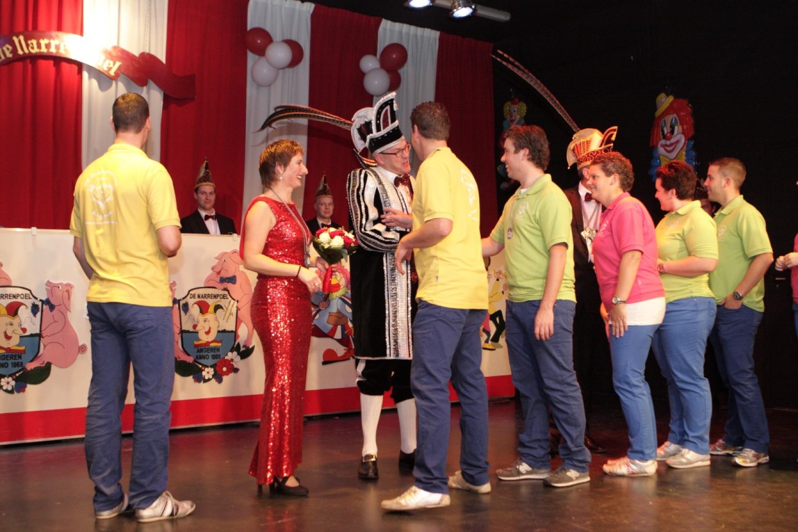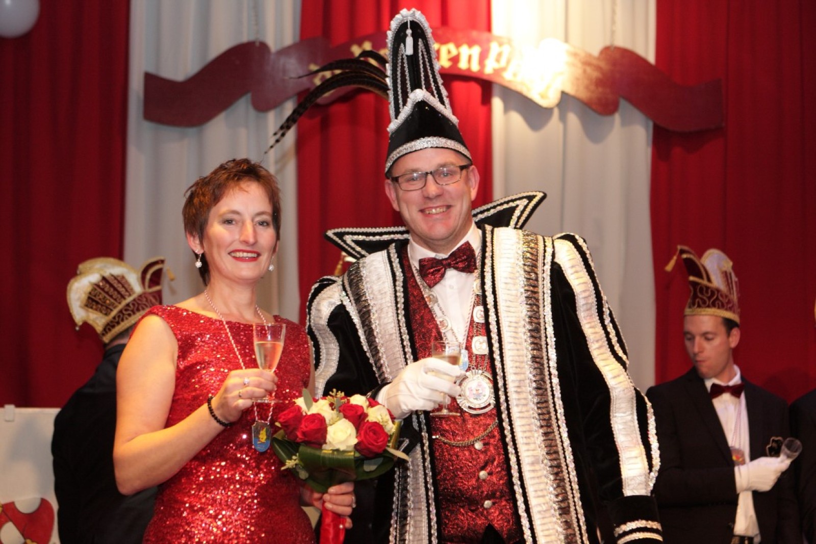 Afgelopen zaterdag werd ook in Angeren het carnavalsseizoen geopend. Prins Ronald Dikker met zijn Debbie mochten het begin van de avond nog mooi op het buhne plaatsnemen, maar niet voor lang. Na wat mooie woorden over en en weer, werden hun versierselen afgenomen en moesten Ronald en Debbie na 2 jaar over ’t Keujesgat geregeerd te hebben weer plaatsnemen tussen het gewone volk.