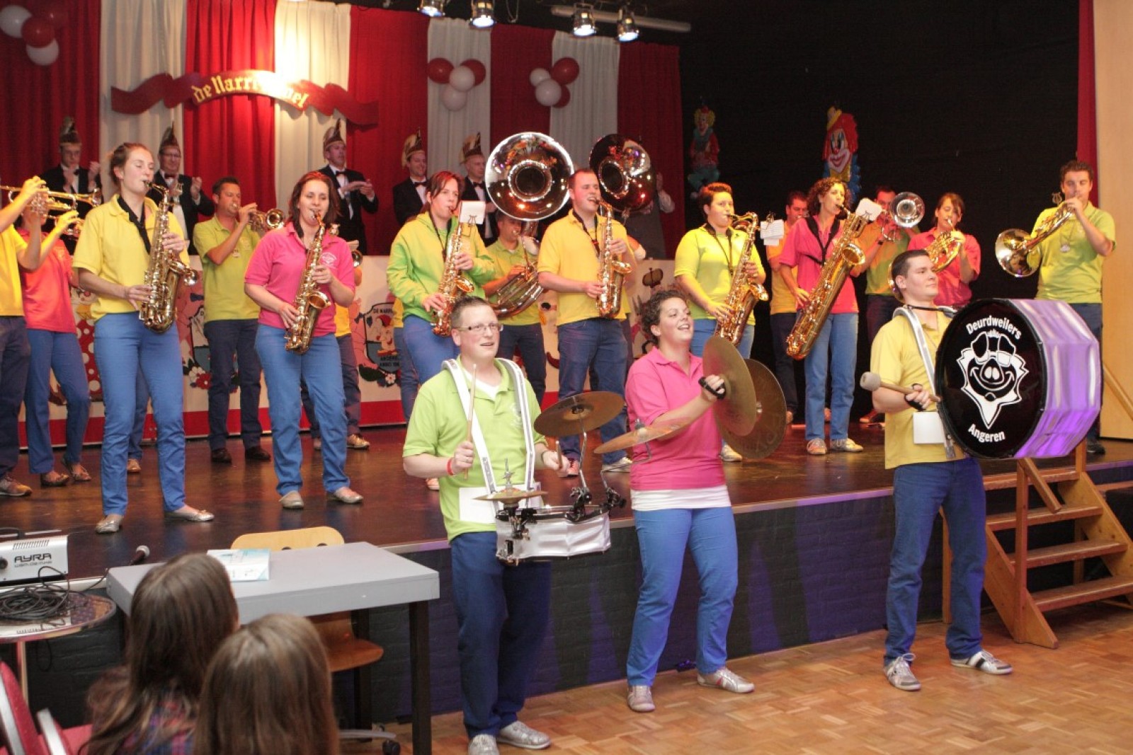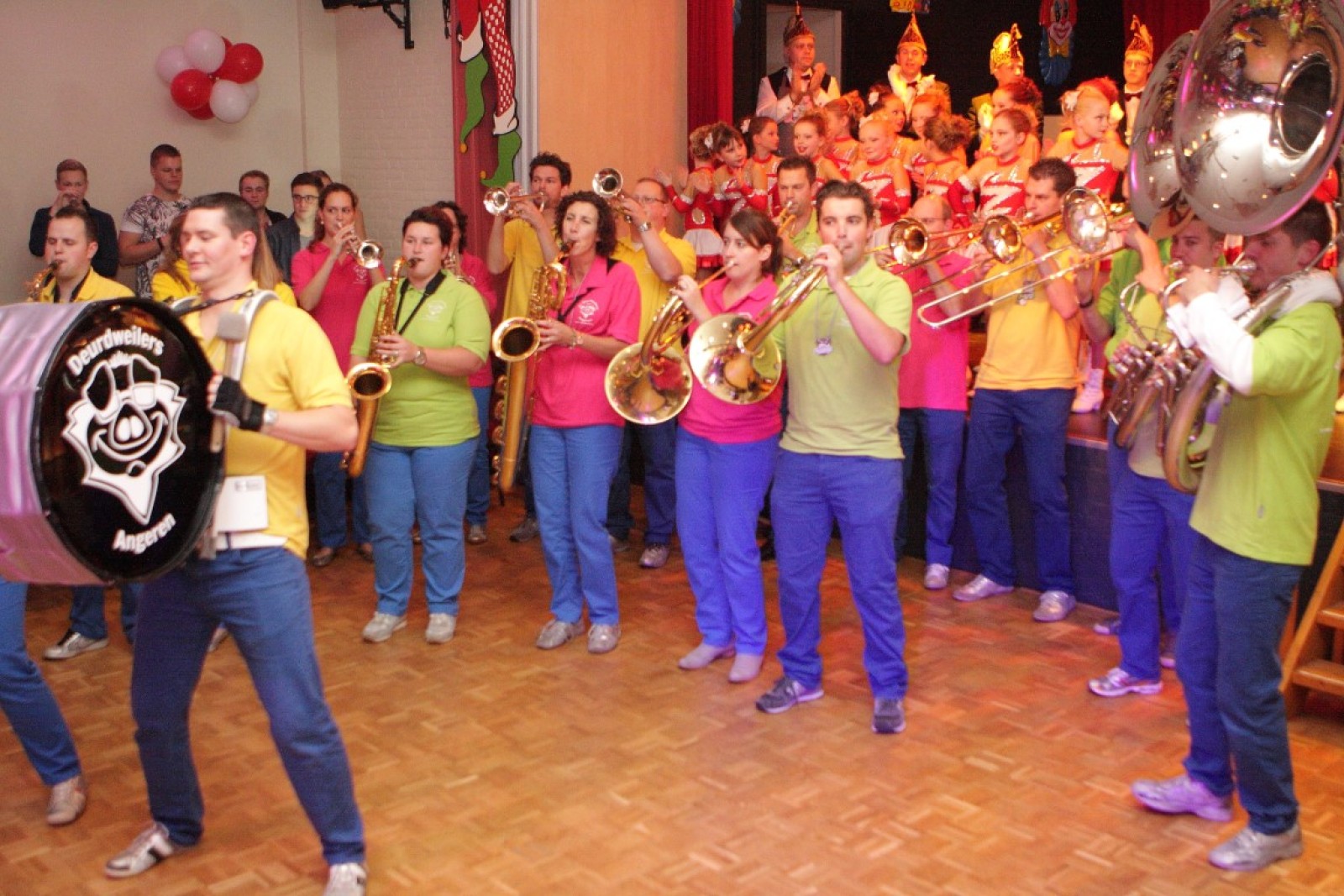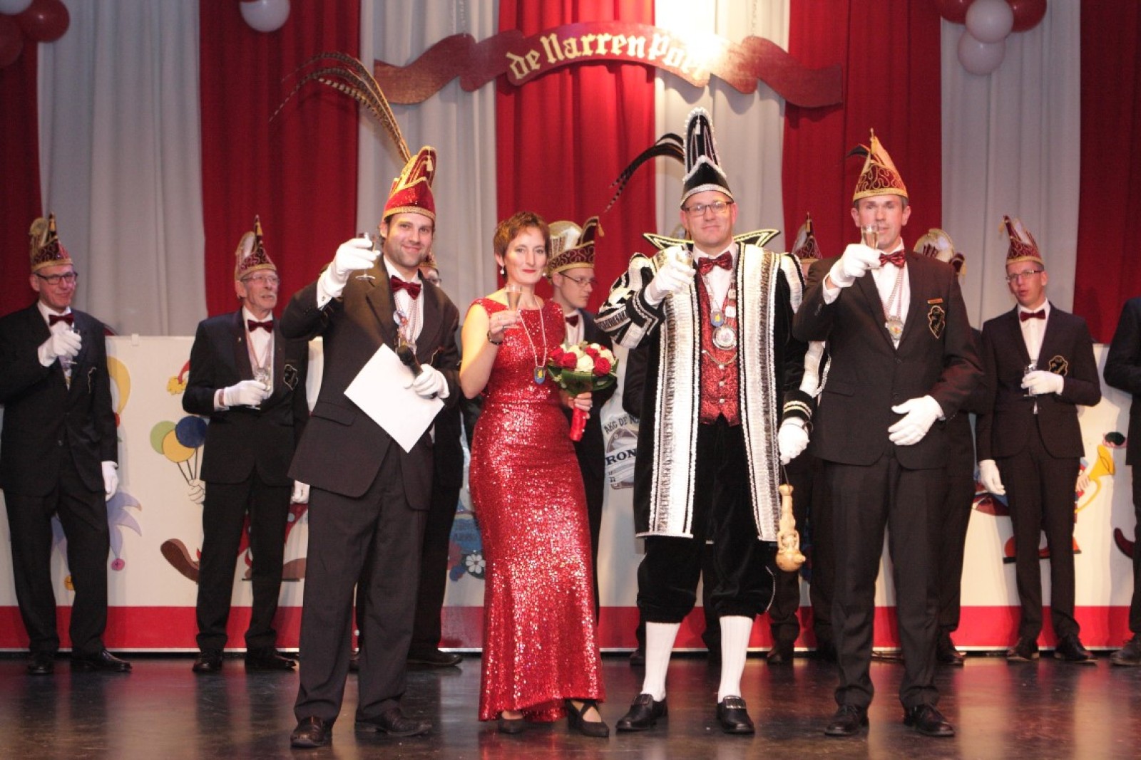 Afgelopen zaterdag werd ook in Angeren het carnavalsseizoen geopend. Prins Ronald Dikker met zijn Debbie mochten het begin van de avond nog mooi op het buhne plaatsnemen, maar niet voor lang. Na wat mooie woorden over en en weer, werden hun versierselen afgenomen en moesten Ronald en Debbie na 2 jaar over ’t Keujesgat geregeerd te hebben weer plaatsnemen tussen het gewone volk.