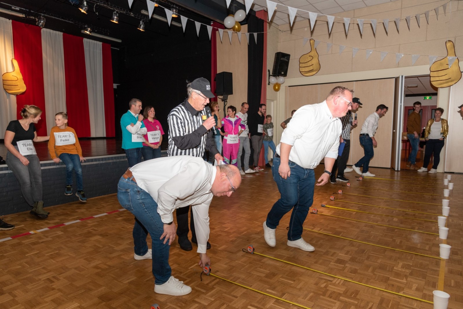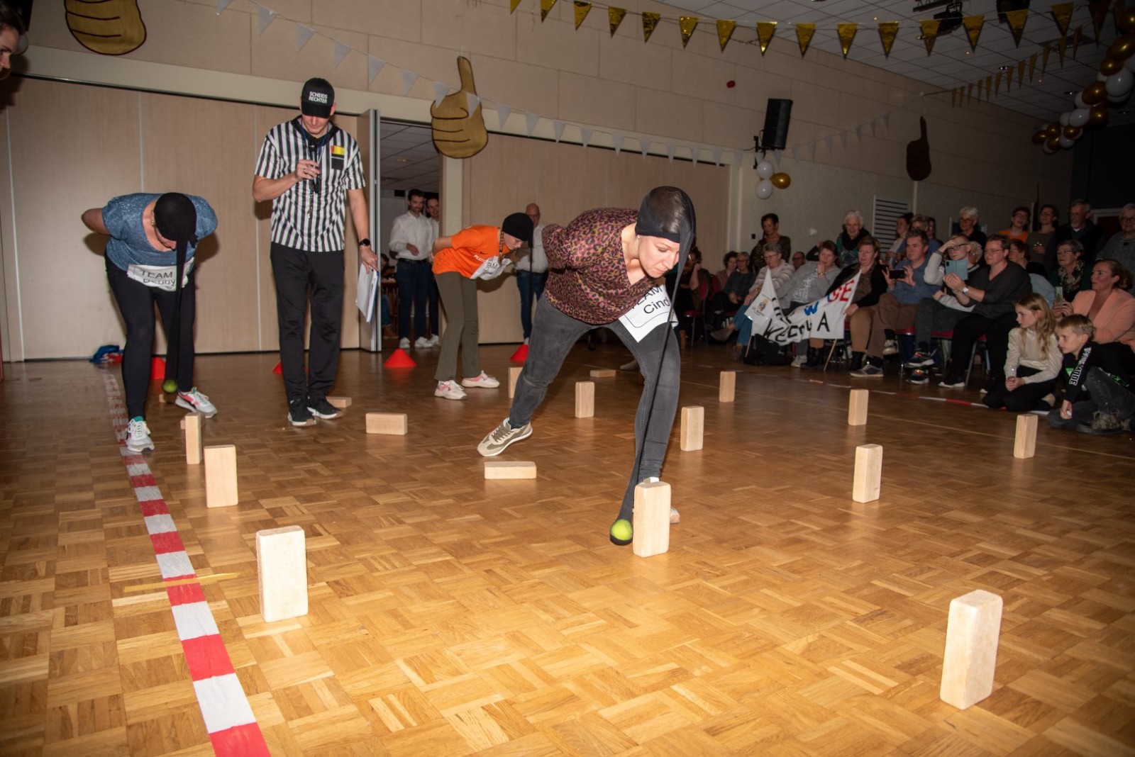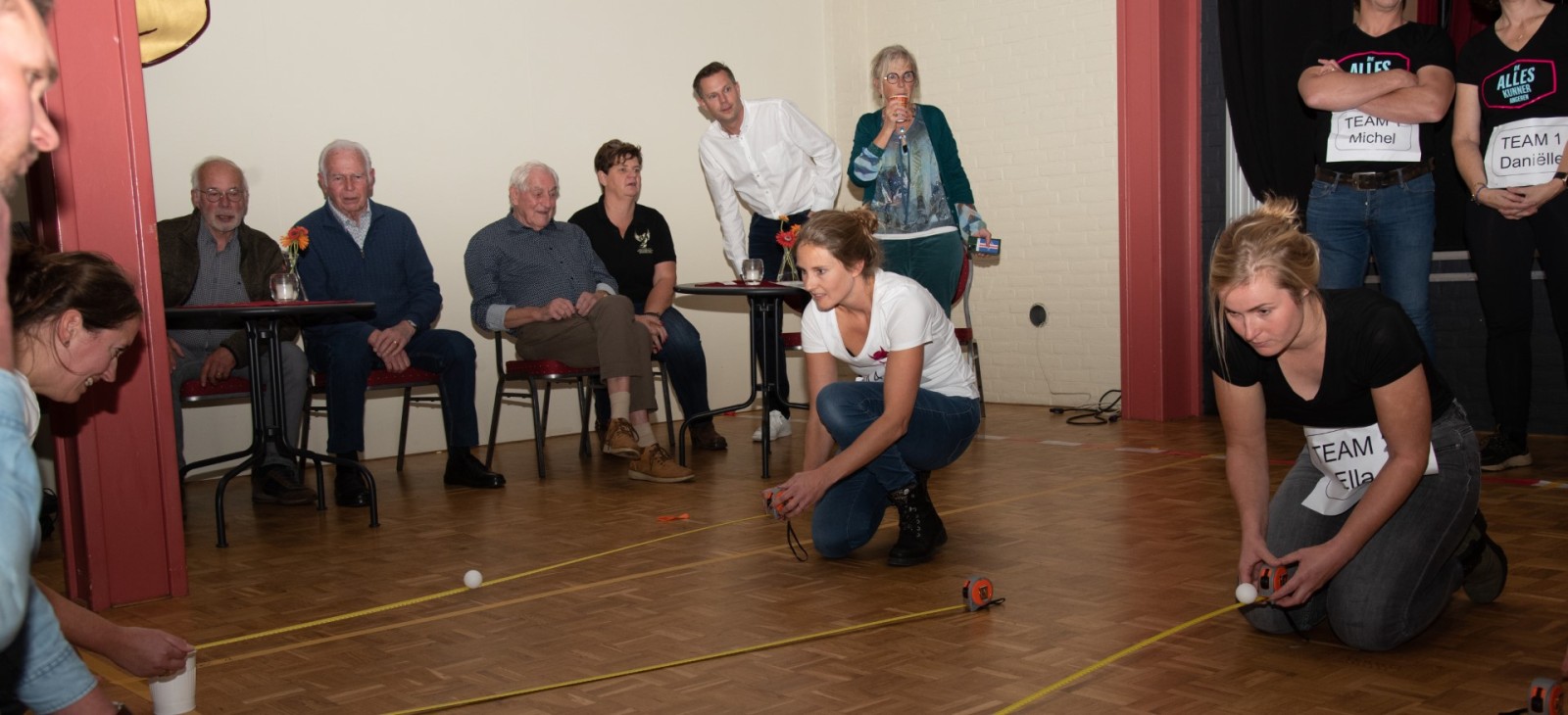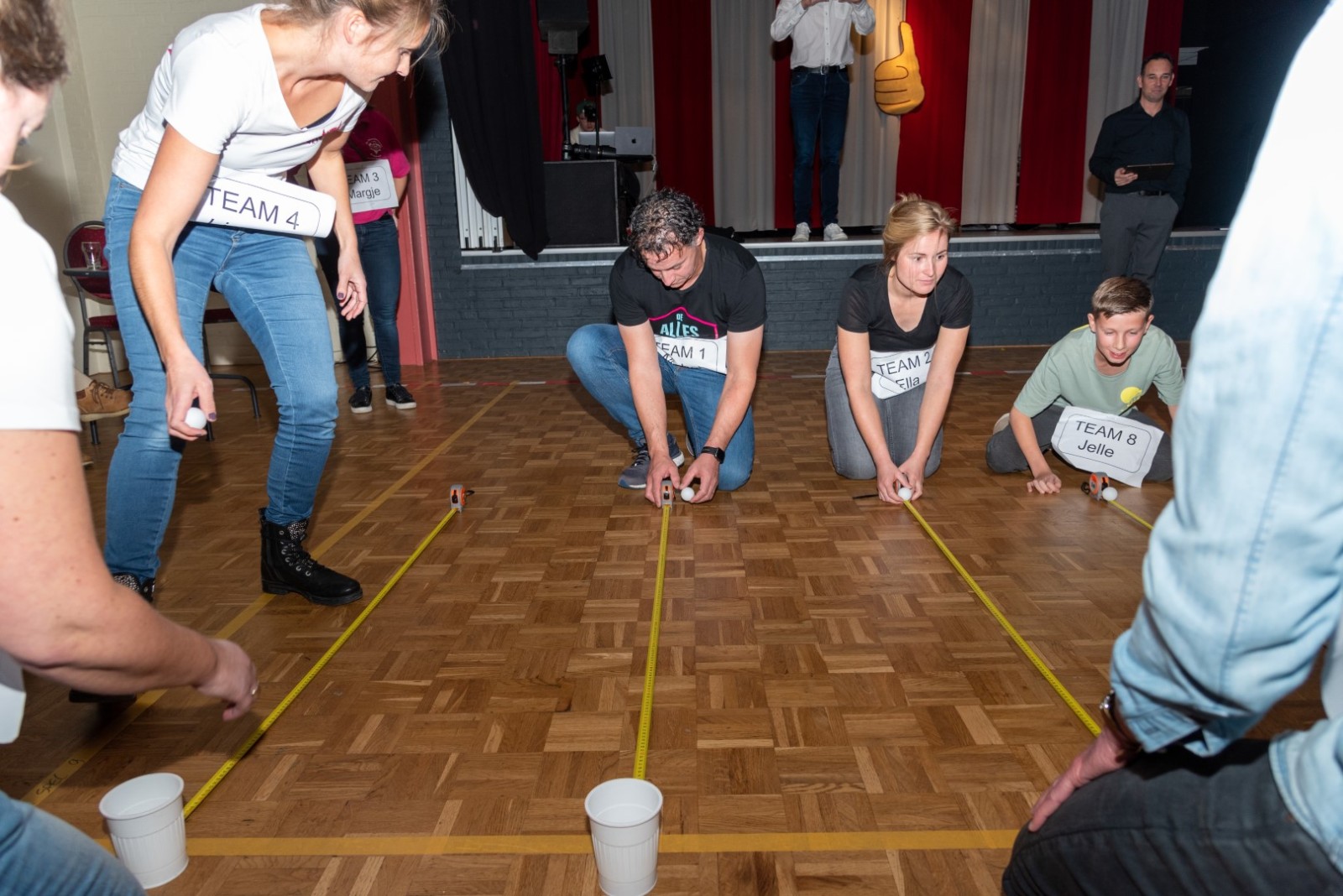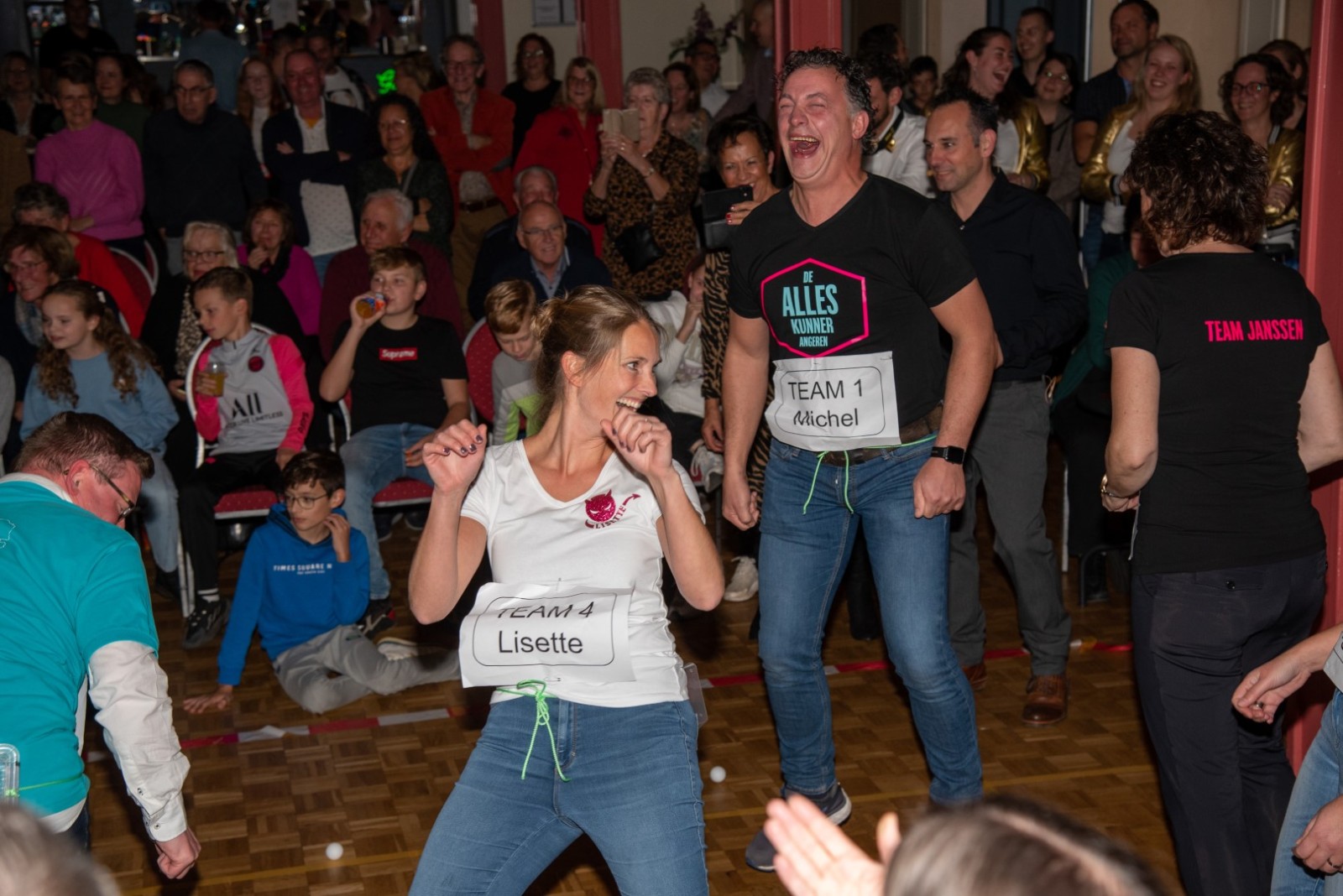 Deze keer stond de avond in het teken van “de Alleskunner” van het gelijknamige TV programma. 30 deelnemers speelde in duo’s korte grappige uiteenlopende spelletjes tegen elkaar. Waaronder papieren vliegtuigjes in een emmer gooien, zoveel mogelijk post-its op je gezicht plekken, een opgeblazen luchtbed leeg laten lopen en opvouwen zodat hij in een klein doosje past en nog veel meer gekke hilarische spellen. Na ieder spel vielen een paar teams af. Het overgebleven team van de avond mocht in een zinderende finale tegen elkaar strijden om de titel “Alleskunner van Angeren”. Ze moesten van de ene kant naar de andere kant van de zaal zien te komen geheel liggend in een slaapzak. Cindy van team “Dianne en Cindy” kwam als eerste over de streep en ging er vandoor met de prachtige “Alleskunner-bokaal”.