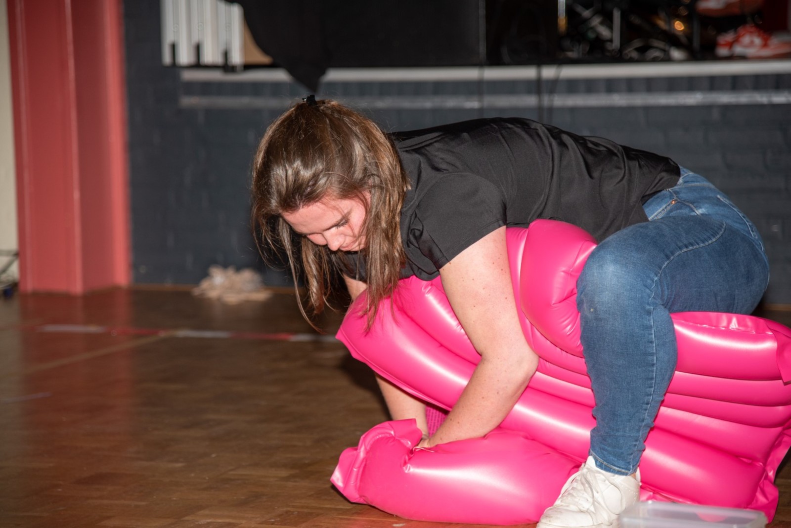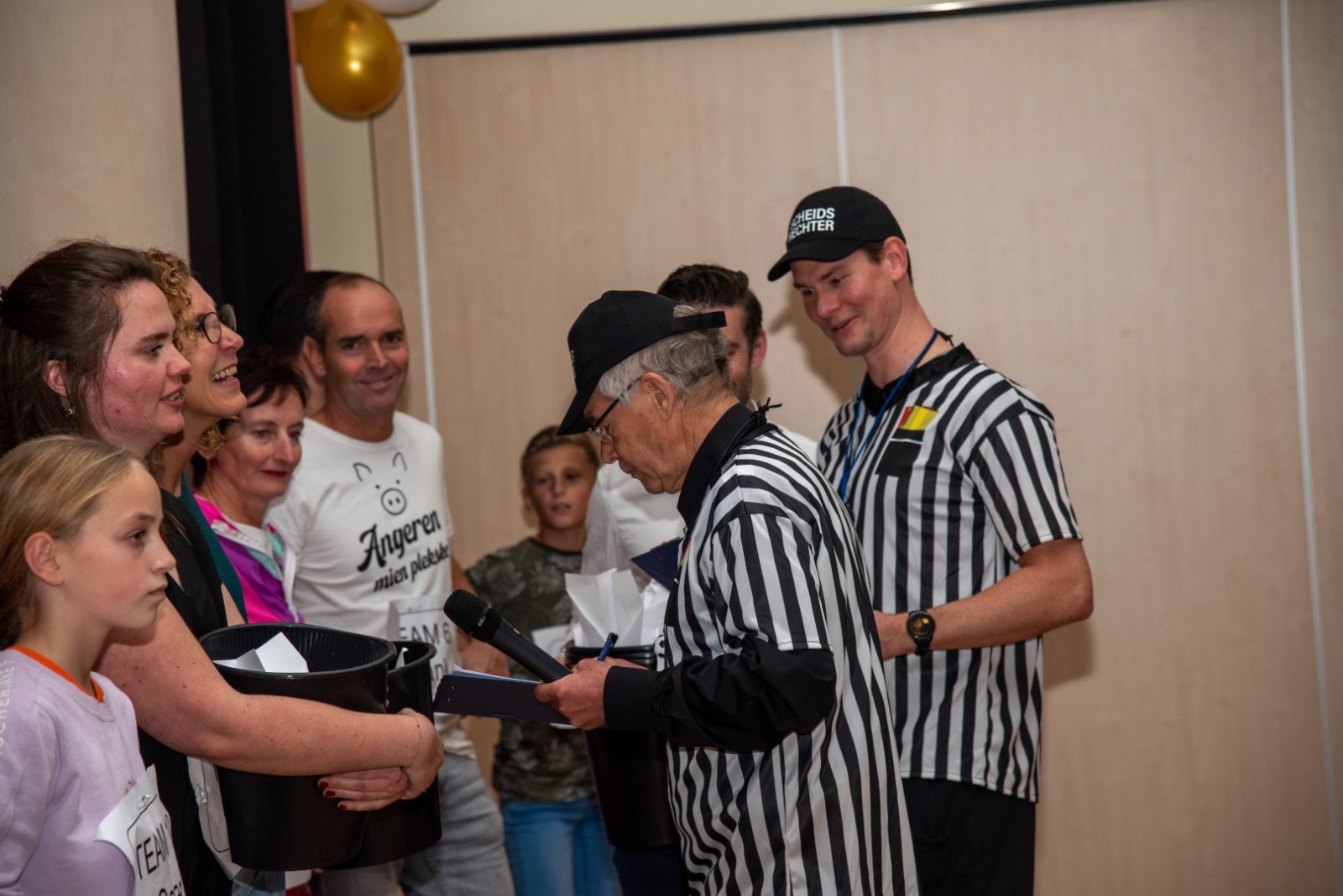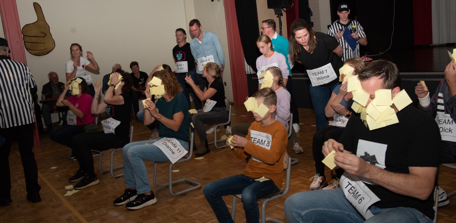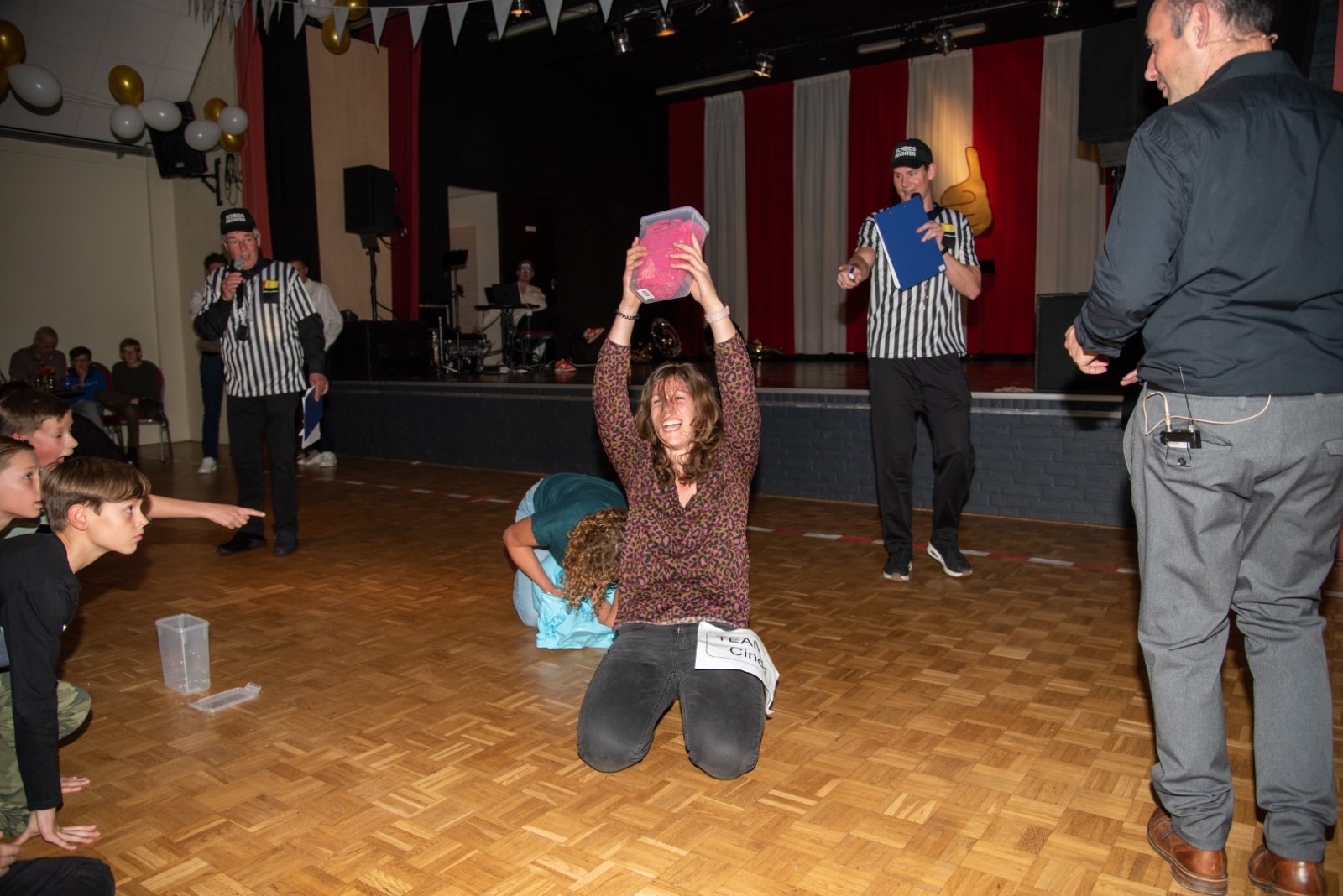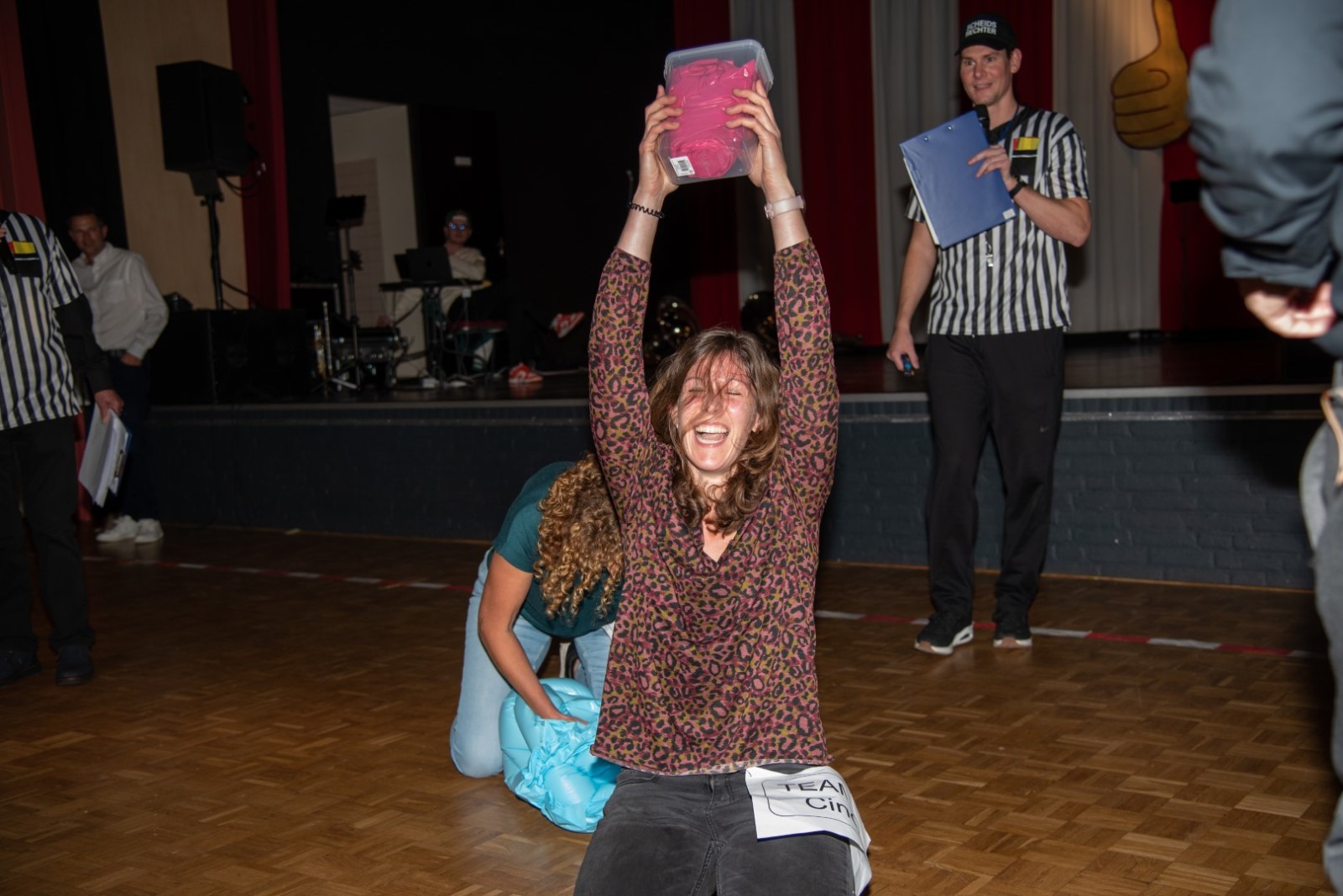 Deze keer stond de avond in het teken van “de Alleskunner” van het gelijknamige TV programma. 30 deelnemers speelde in duo’s korte grappige uiteenlopende spelletjes tegen elkaar. Waaronder papieren vliegtuigjes in een emmer gooien, zoveel mogelijk post-its op je gezicht plekken, een opgeblazen luchtbed leeg laten lopen en opvouwen zodat hij in een klein doosje past en nog veel meer gekke hilarische spellen. Na ieder spel vielen een paar teams af. Het overgebleven team van de avond mocht in een zinderende finale tegen elkaar strijden om de titel “Alleskunner van Angeren”. Ze moesten van de ene kant naar de andere kant van de zaal zien te komen geheel liggend in een slaapzak. Cindy van team “Dianne en Cindy” kwam als eerste over de streep en ging er vandoor met de prachtige “Alleskunner-bokaal”.