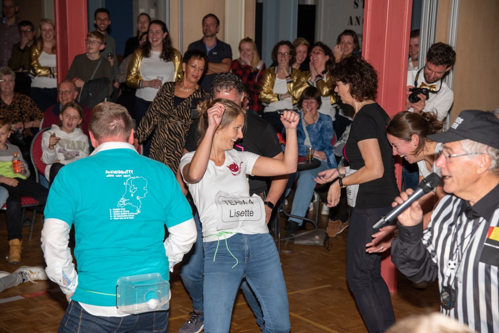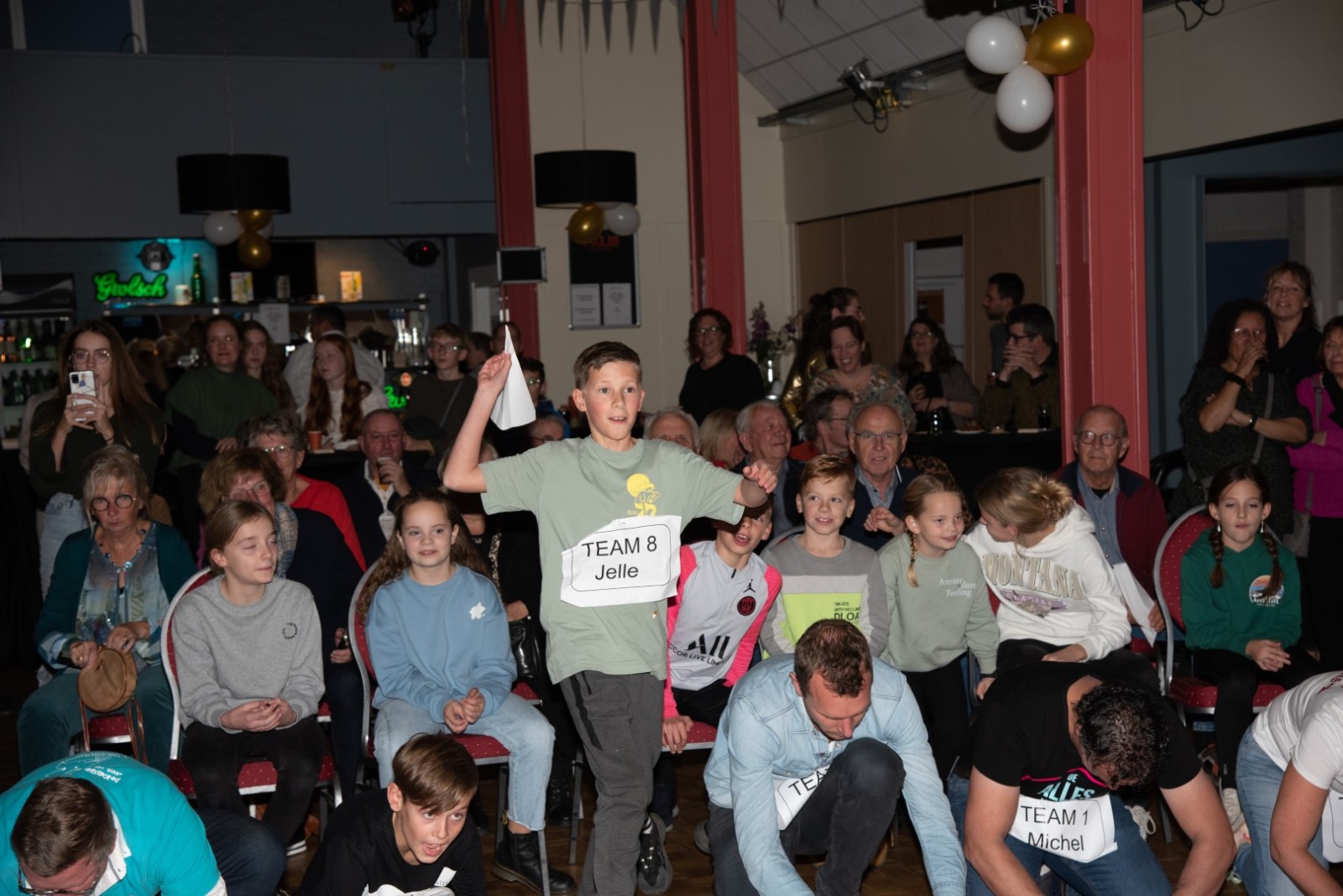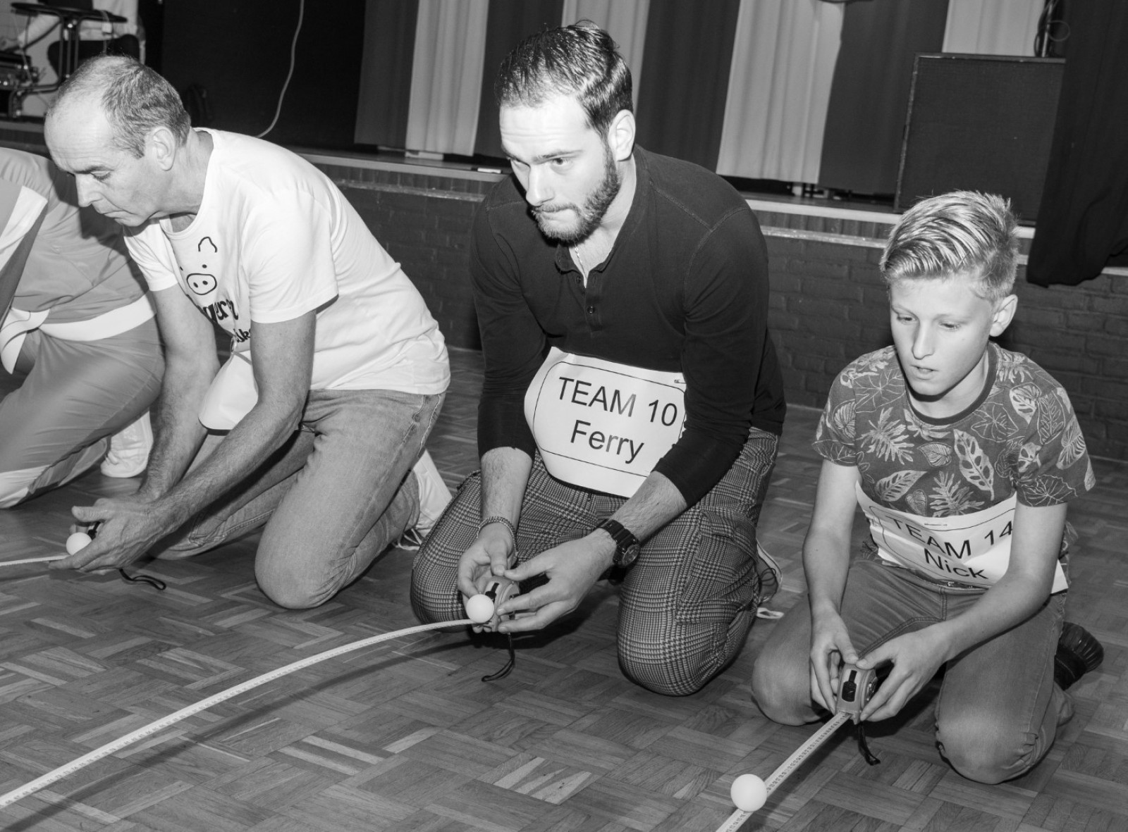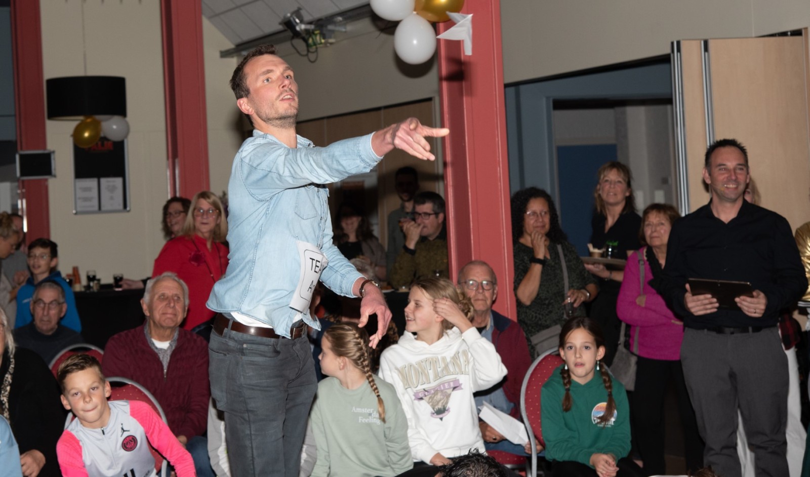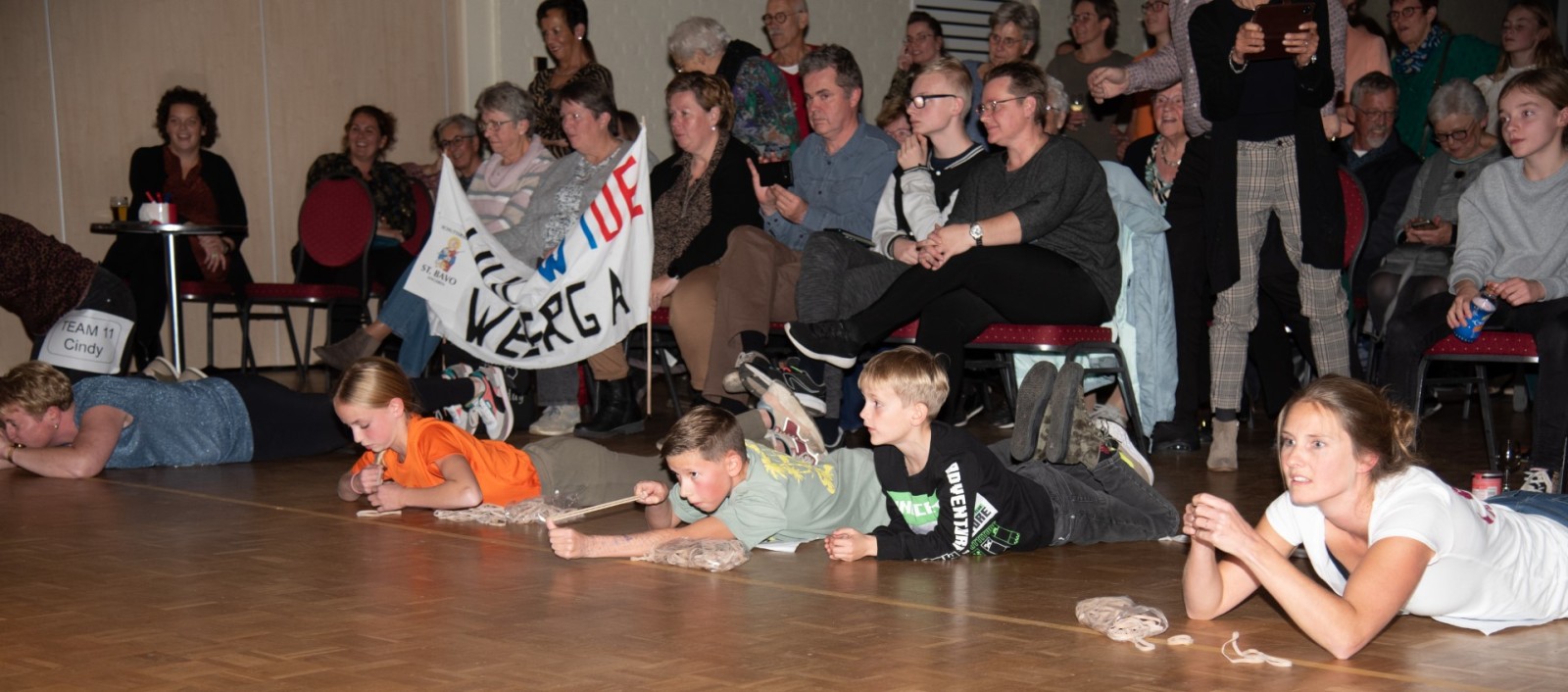 Deze keer stond de avond in het teken van “de Alleskunner” van het gelijknamige TV programma. 30 deelnemers speelde in duo’s korte grappige uiteenlopende spelletjes tegen elkaar. Waaronder papieren vliegtuigjes in een emmer gooien, zoveel mogelijk post-its op je gezicht plekken, een opgeblazen luchtbed leeg laten lopen en opvouwen zodat hij in een klein doosje past en nog veel meer gekke hilarische spellen. Na ieder spel vielen een paar teams af. Het overgebleven team van de avond mocht in een zinderende finale tegen elkaar strijden om de titel “Alleskunner van Angeren”. Ze moesten van de ene kant naar de andere kant van de zaal zien te komen geheel liggend in een slaapzak. Cindy van team “Dianne en Cindy” kwam als eerste over de streep en ging er vandoor met de prachtige “Alleskunner-bokaal”.