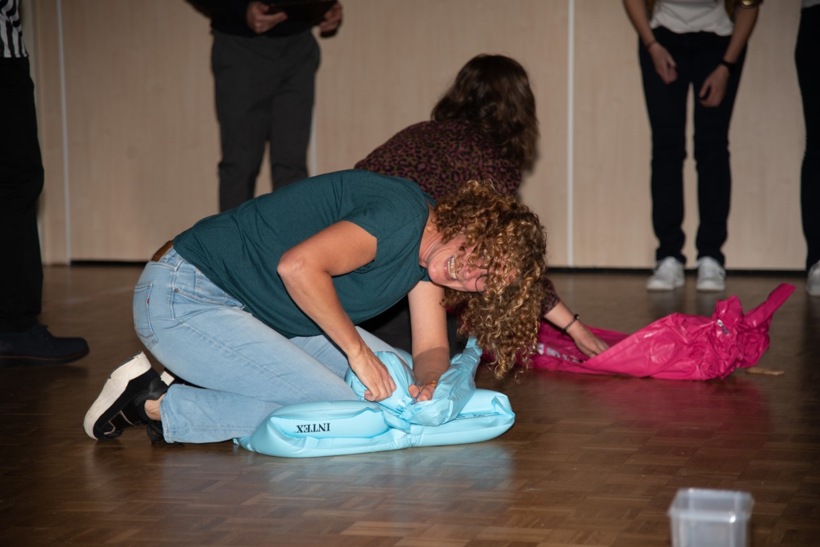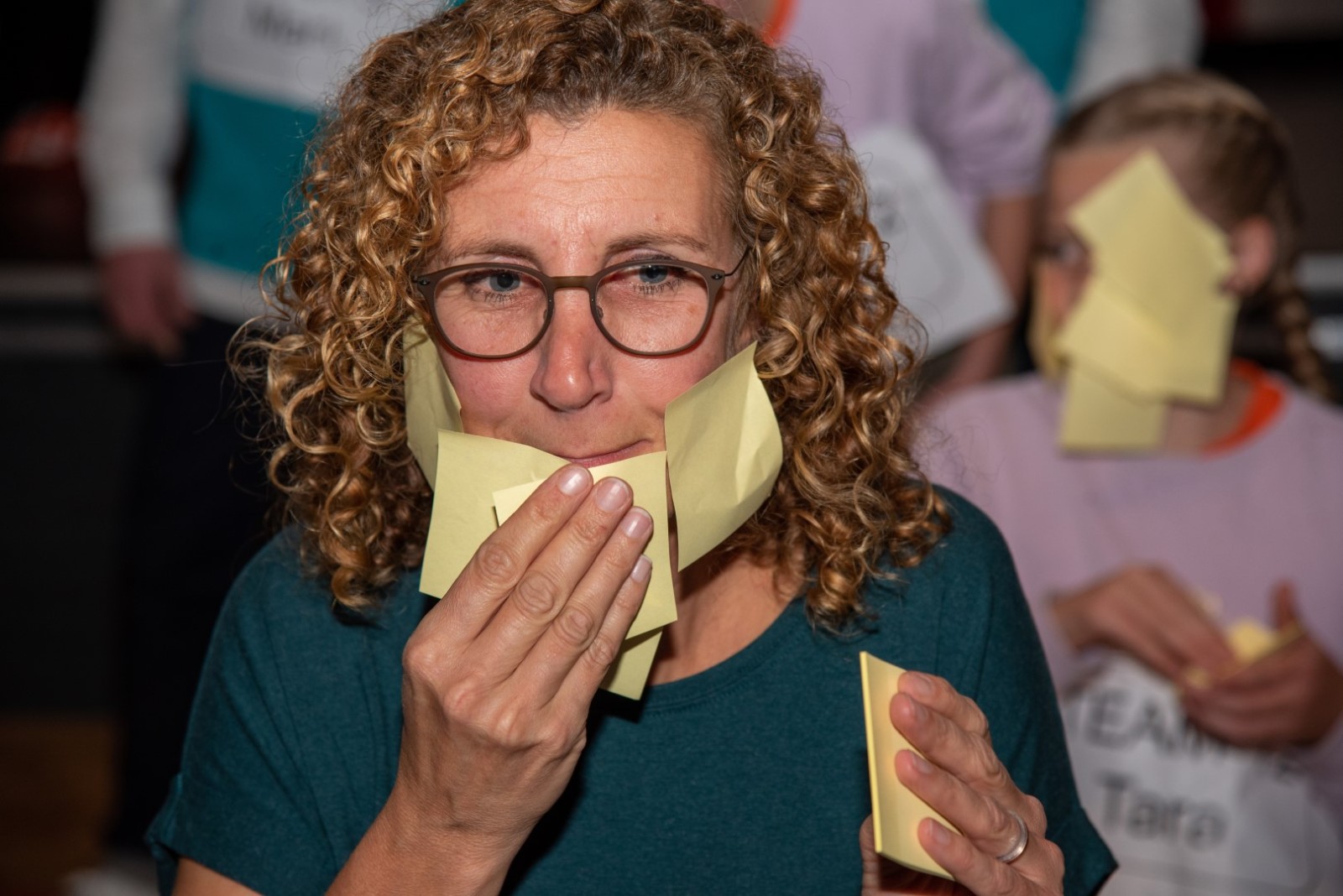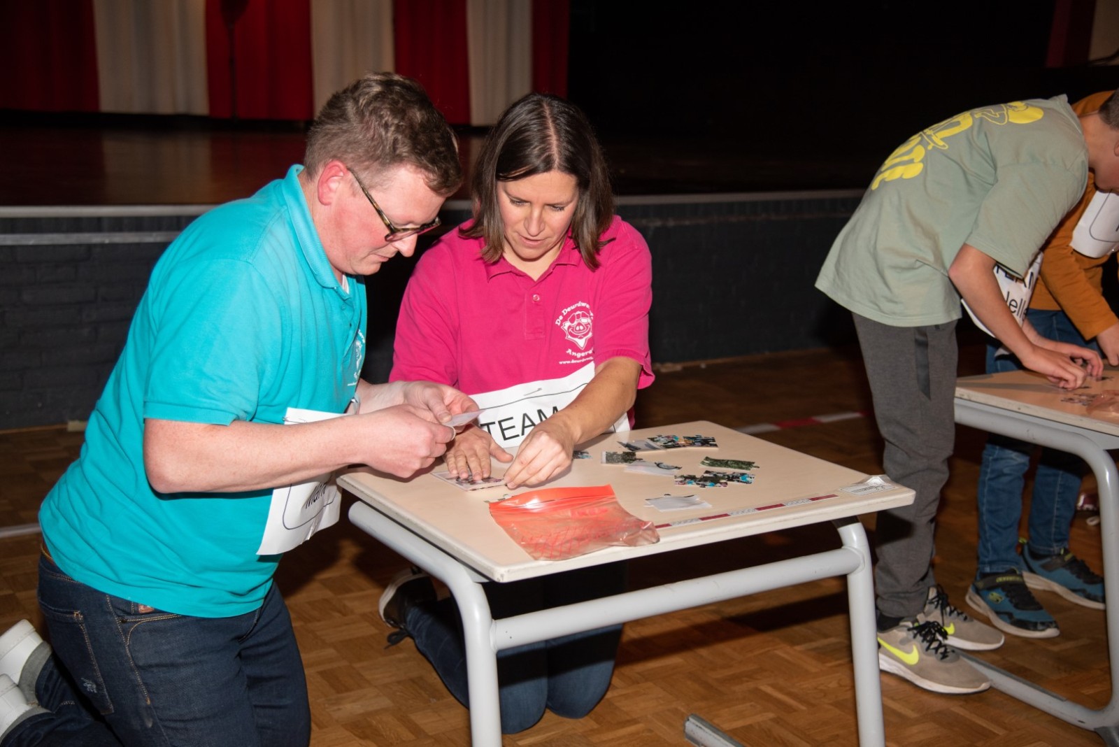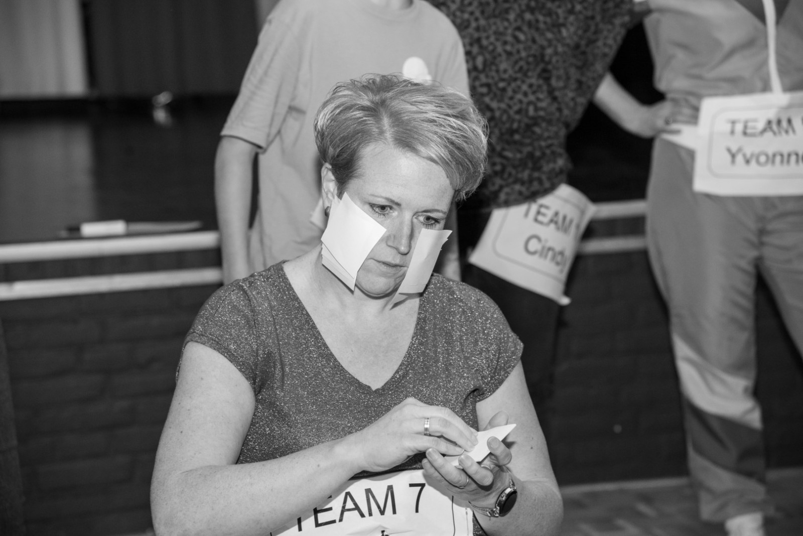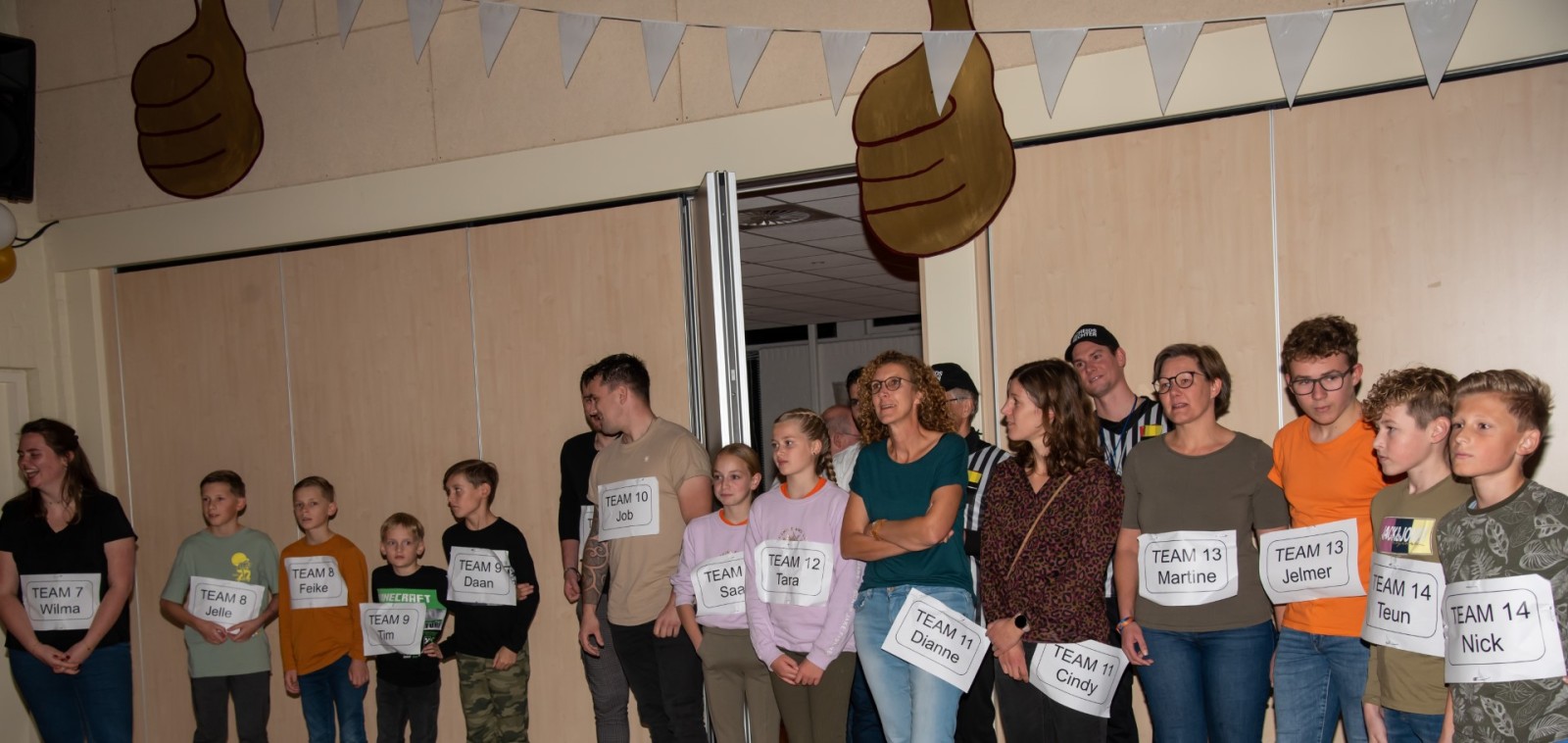Deze keer stond de avond in het teken van “de Alleskunner” van het gelijknamige TV programma. 30 deelnemers speelde in duo’s korte grappige uiteenlopende spelletjes tegen elkaar. Waaronder papieren vliegtuigjes in een emmer gooien, zoveel mogelijk post-its op je gezicht plekken, een opgeblazen luchtbed leeg laten lopen en opvouwen zodat hij in een klein doosje past en nog veel meer gekke hilarische spellen. Na ieder spel vielen een paar teams af. Het overgebleven team van de avond mocht in een zinderende finale tegen elkaar strijden om de titel “Alleskunner van Angeren”. Ze moesten van de ene kant naar de andere kant van de zaal zien te komen geheel liggend in een slaapzak. Cindy van team “Dianne en Cindy” kwam als eerste over de streep en ging er vandoor met de prachtige “Alleskunner-bokaal”.