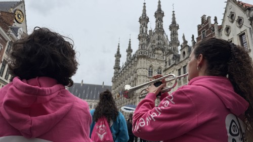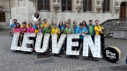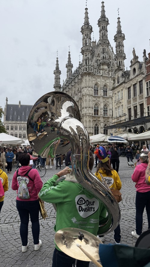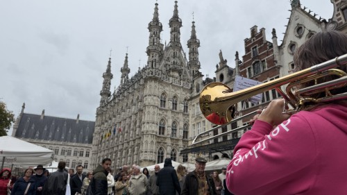 Voor het middagprogramma hadden we onze instrumenten nodig. We wilden namelijk ook wel even muziek maken in het Leuvense centrum. Ook de nieuwe nummers werden niet geschuwd en hier en daar nog enigszins onwennig gespeeld. Het publiek was er echter niet minder enthousiast door. Wat een leuke reacties hebben we gekregen.