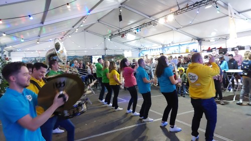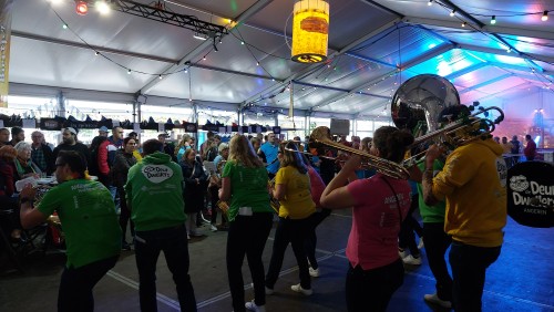 Zaterdagmiddag stapten we in de auto’s richting Woerden. In de grote feesttent aldaar ontmoetten we 3 andere dweilorkesten om sfeer te maken alvorens het grote oktoberfeest daar zou plaatsvinden.