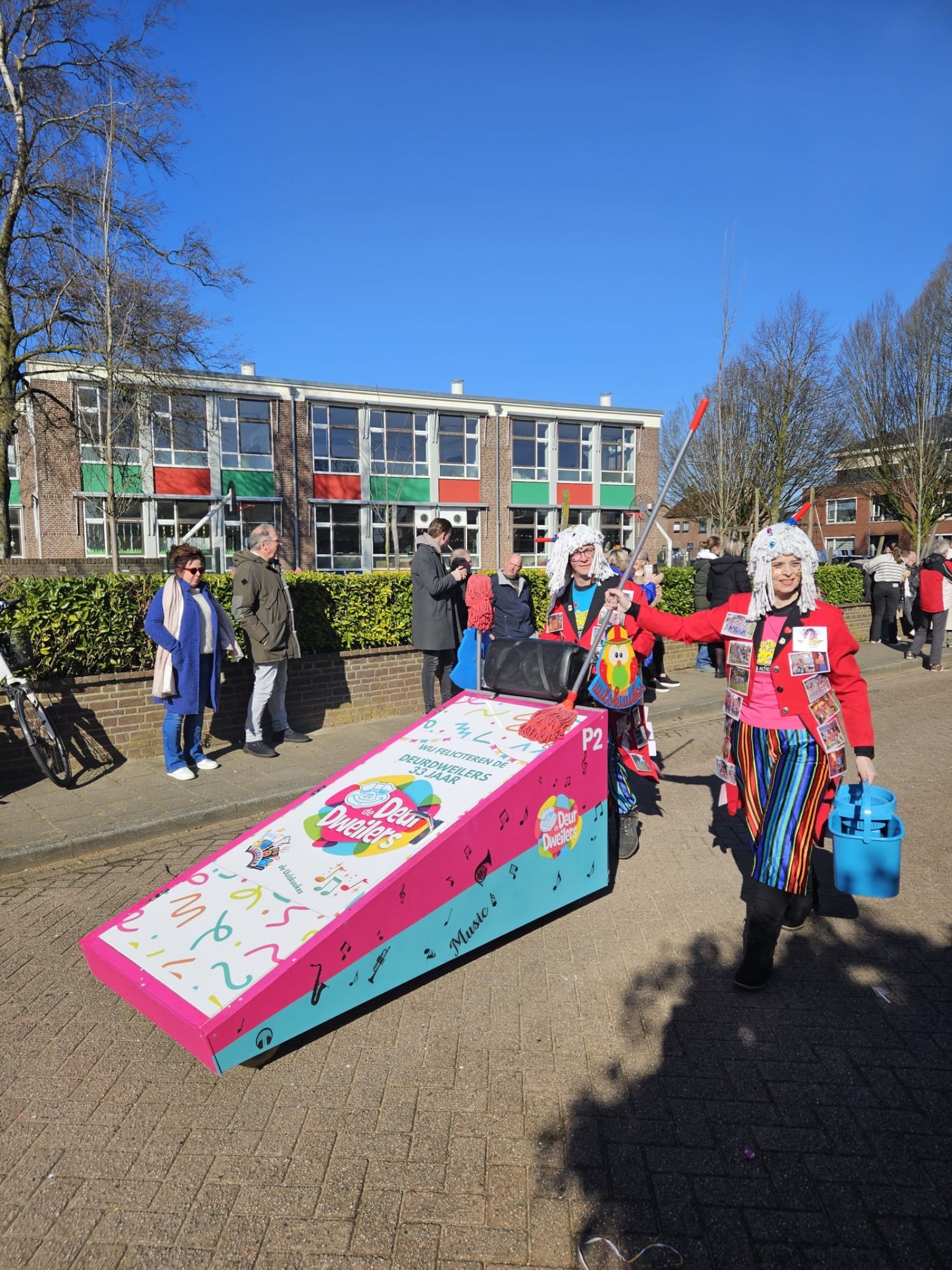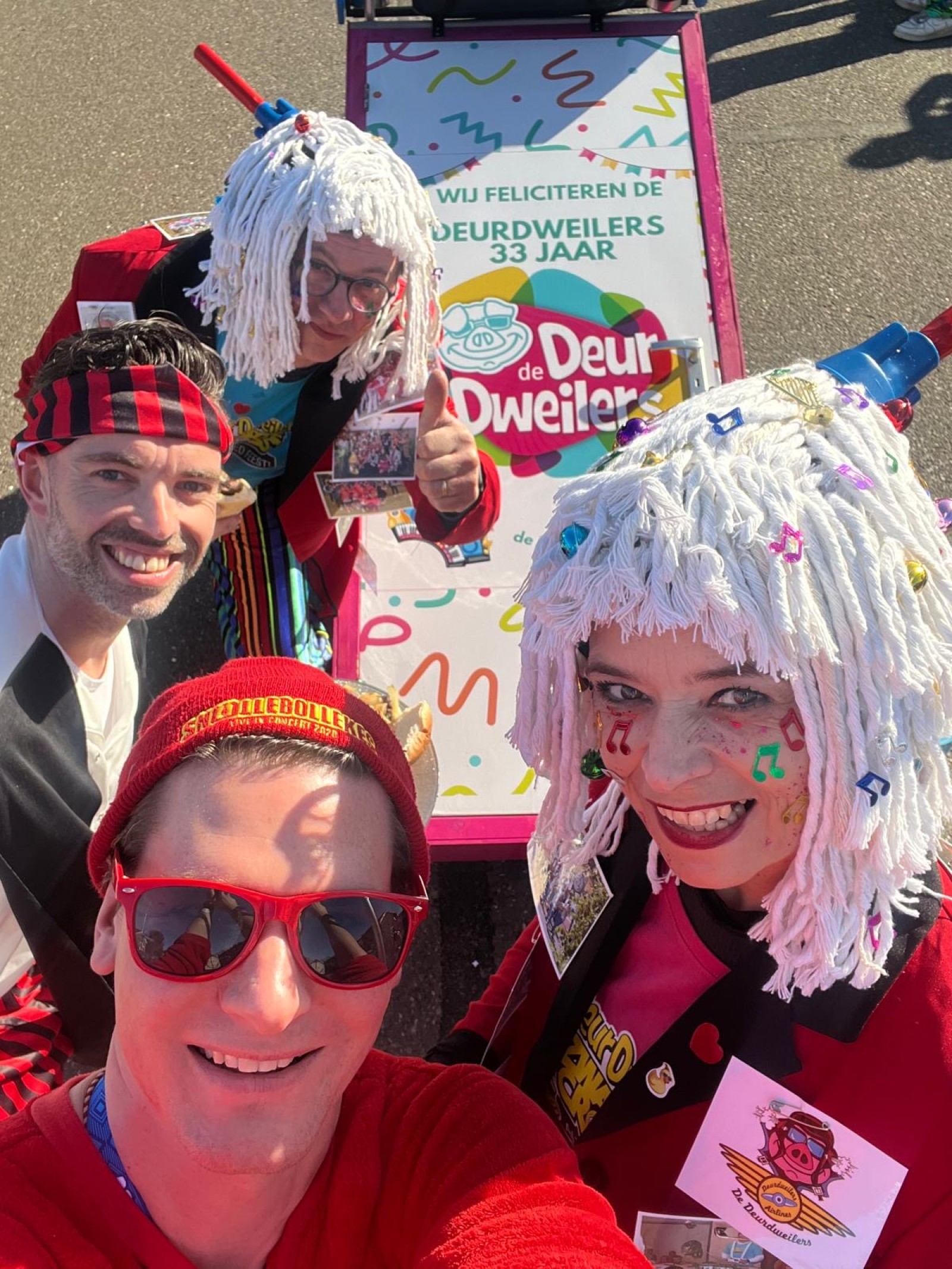 De jaarlijkse optocht door t Keujesgat. Zonder De Deurdweilers, maar toch ook weer een beetje met De Deurdweilers. Het leukste paar van Angeren had namelijk 33 jaar Deurdweilers uitgekozen als onderwerp voor hun optochtcreatie. Op hun jassen prijkten vele leuke foto’s uit de afgelopen 33 jaar. Superleuk! Menig Deurdweiler langs de kant of vanuit de optocht ging met dit stel op de foto!