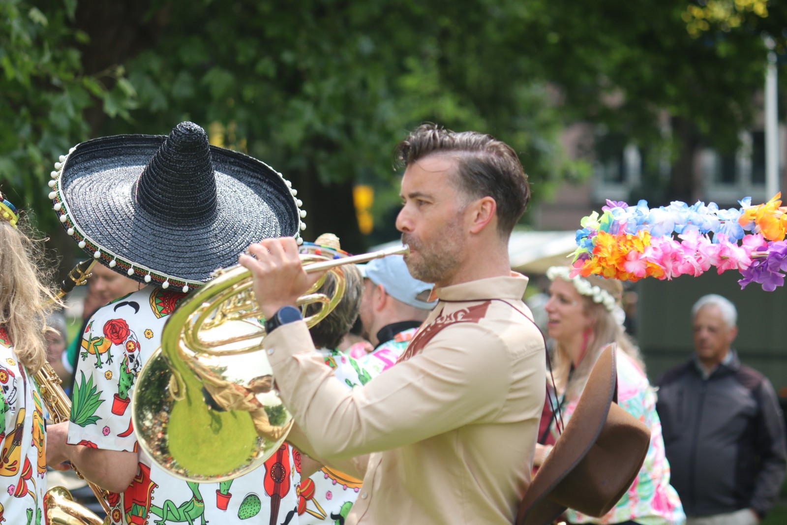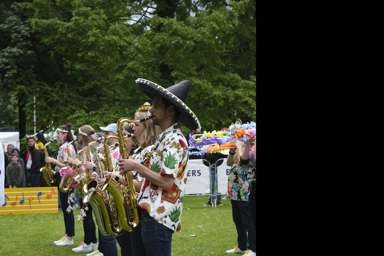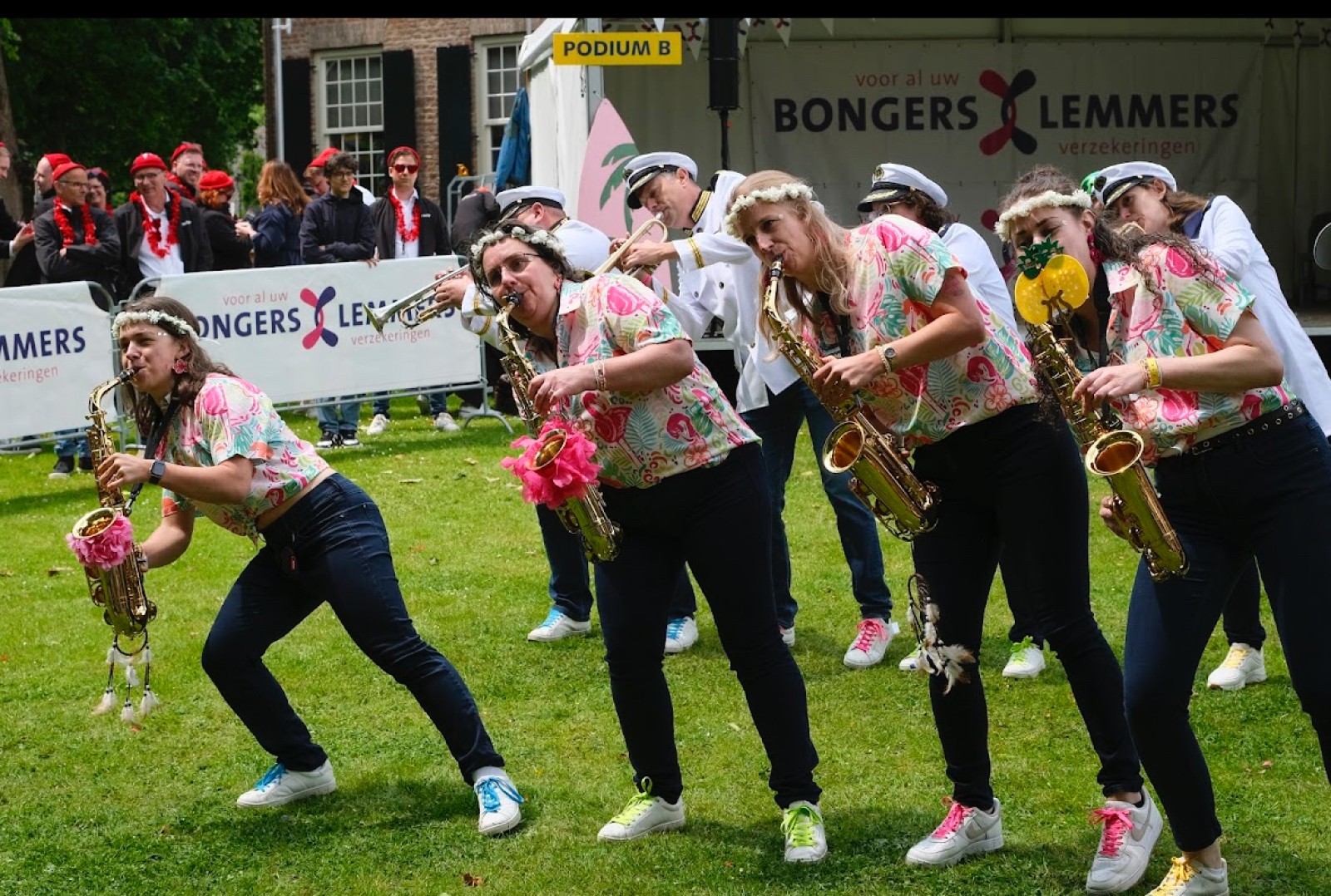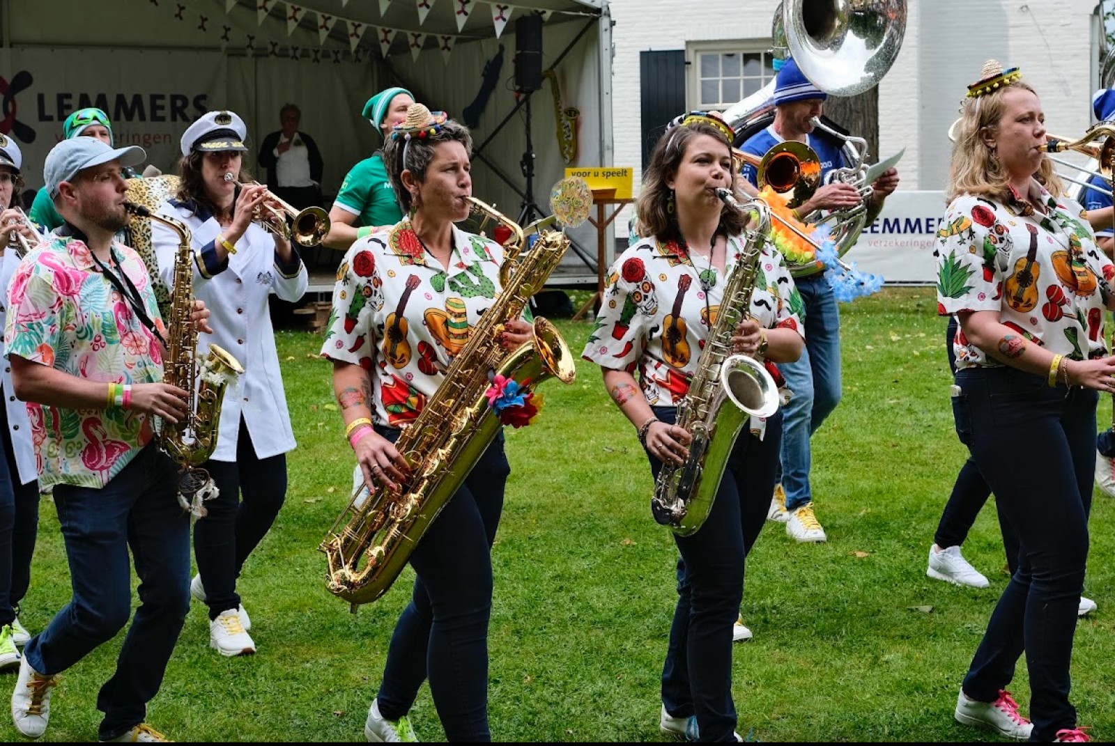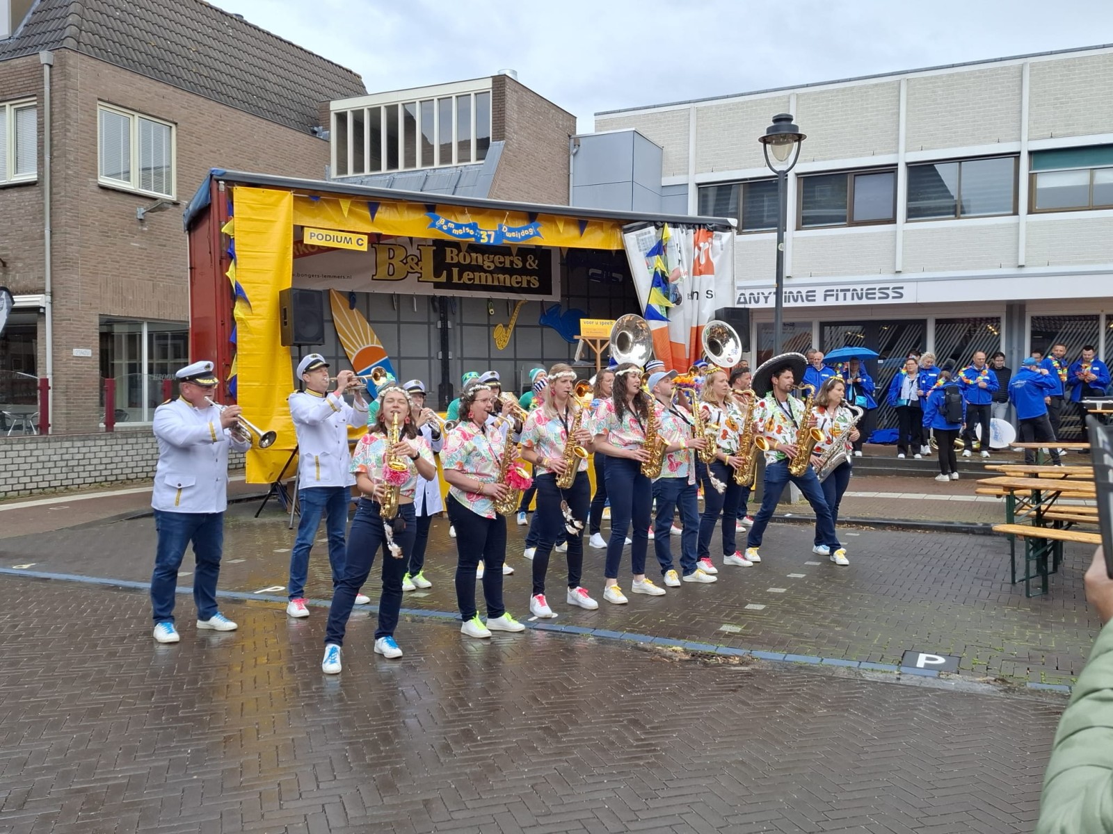 Het leek wel of de organisatie met dit “tropische dweilfiesta” thema de weergoden gejinxt had, want het hele weekend viel er aardig wat regen. Wat hadden wij geluk dat we 4x droog konden spelen. Dan zag je dat de Bemmelse straten direct weer vol liepen en we toch weer voor veel publiek konden spelen. Heerlijk!