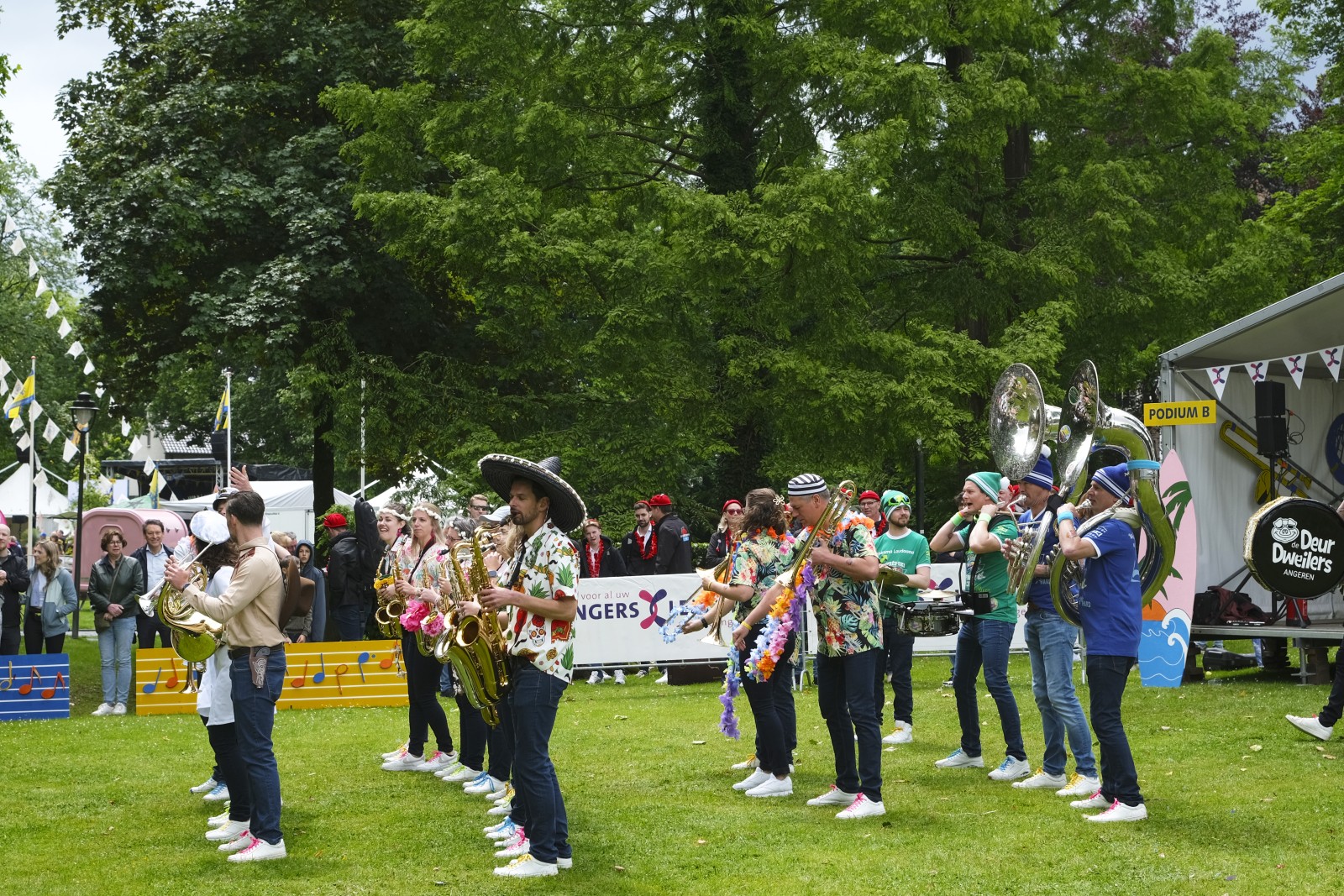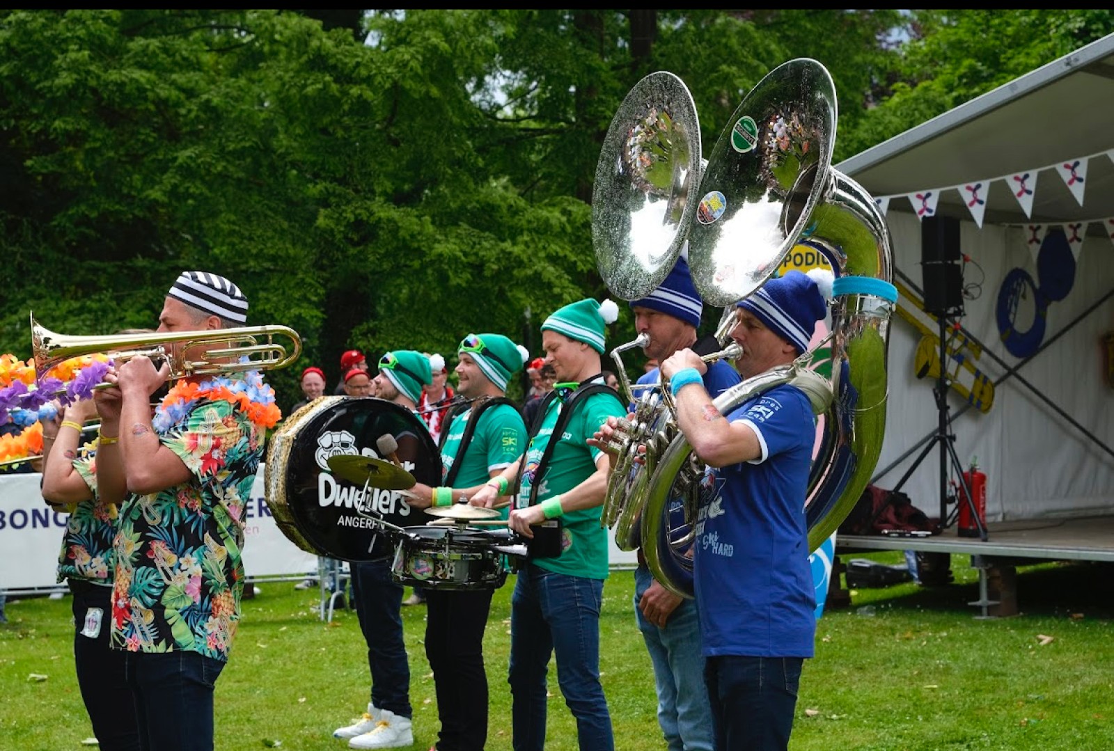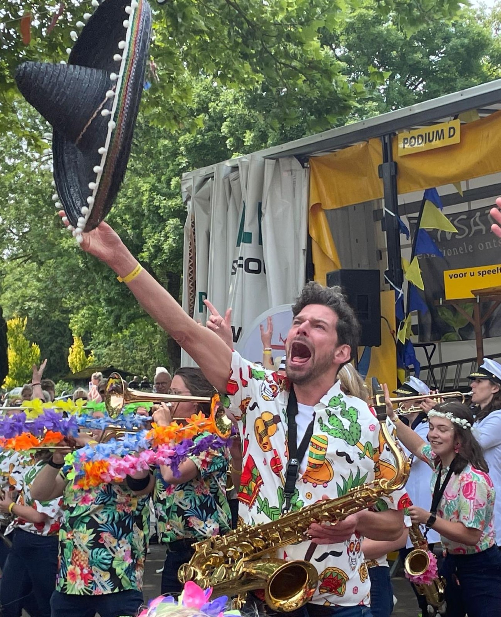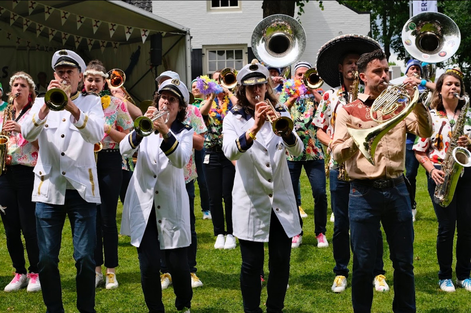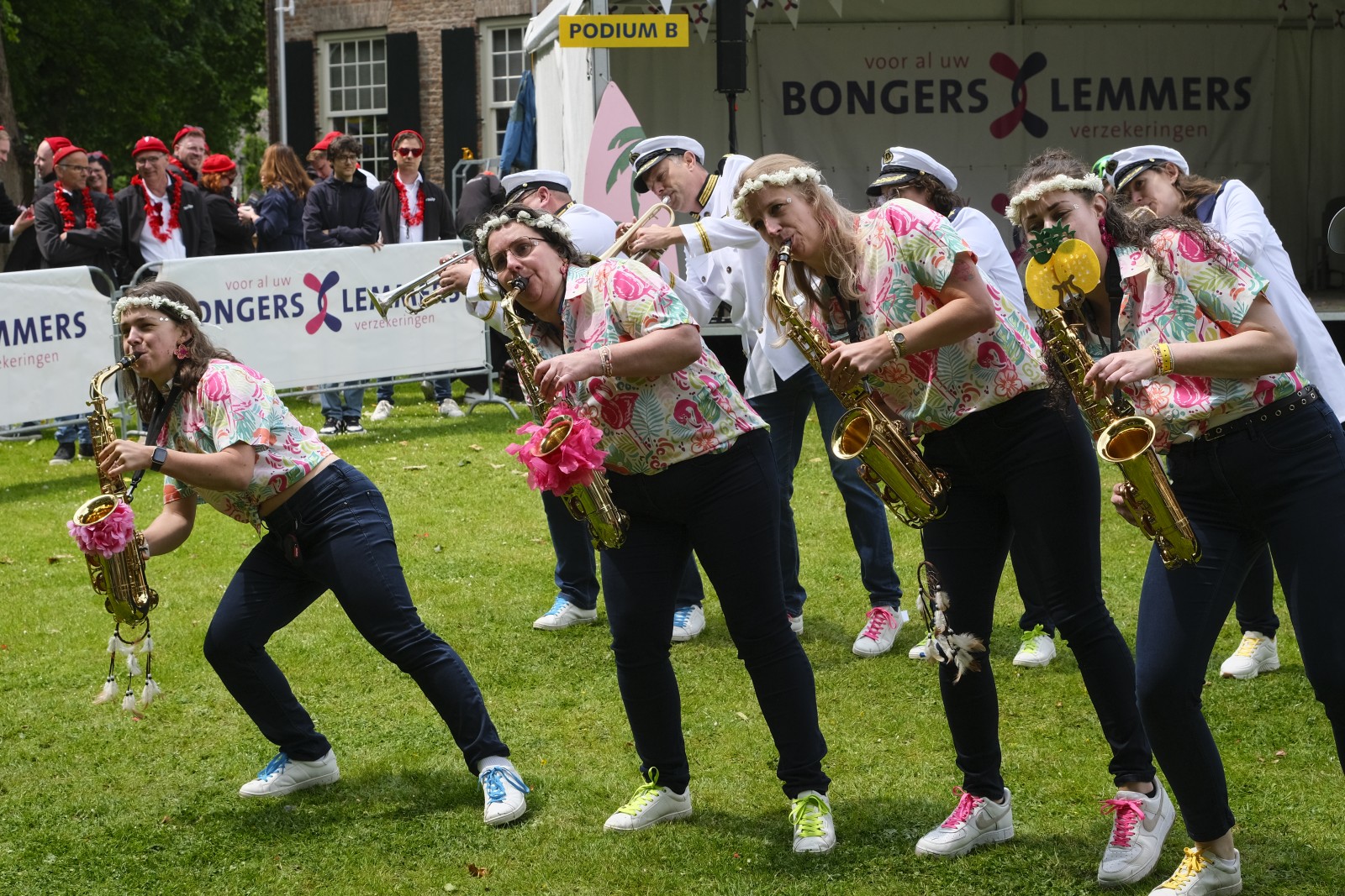 Het leek wel of de organisatie met dit “tropische dweilfiesta” thema de weergoden gejinxt had, want het hele weekend viel er aardig wat regen. Wat hadden wij geluk dat we 4x droog konden spelen. Dan zag je dat de Bemmelse straten direct weer vol liepen en we toch weer voor veel publiek konden spelen. Heerlijk!