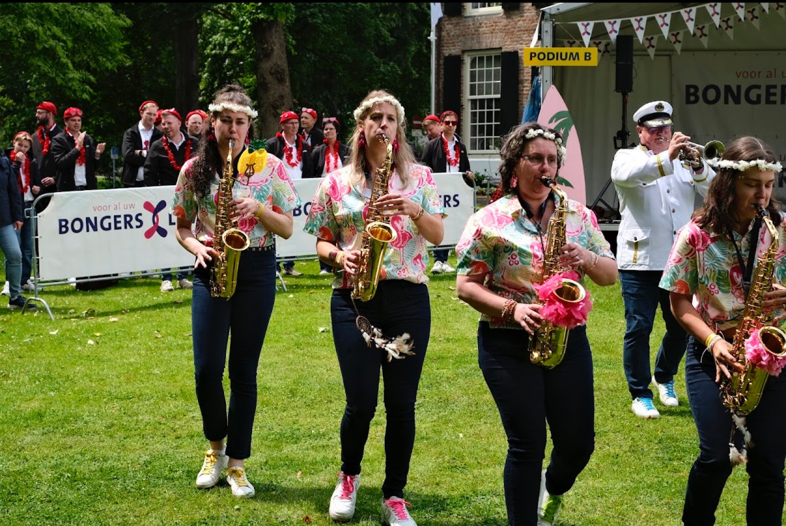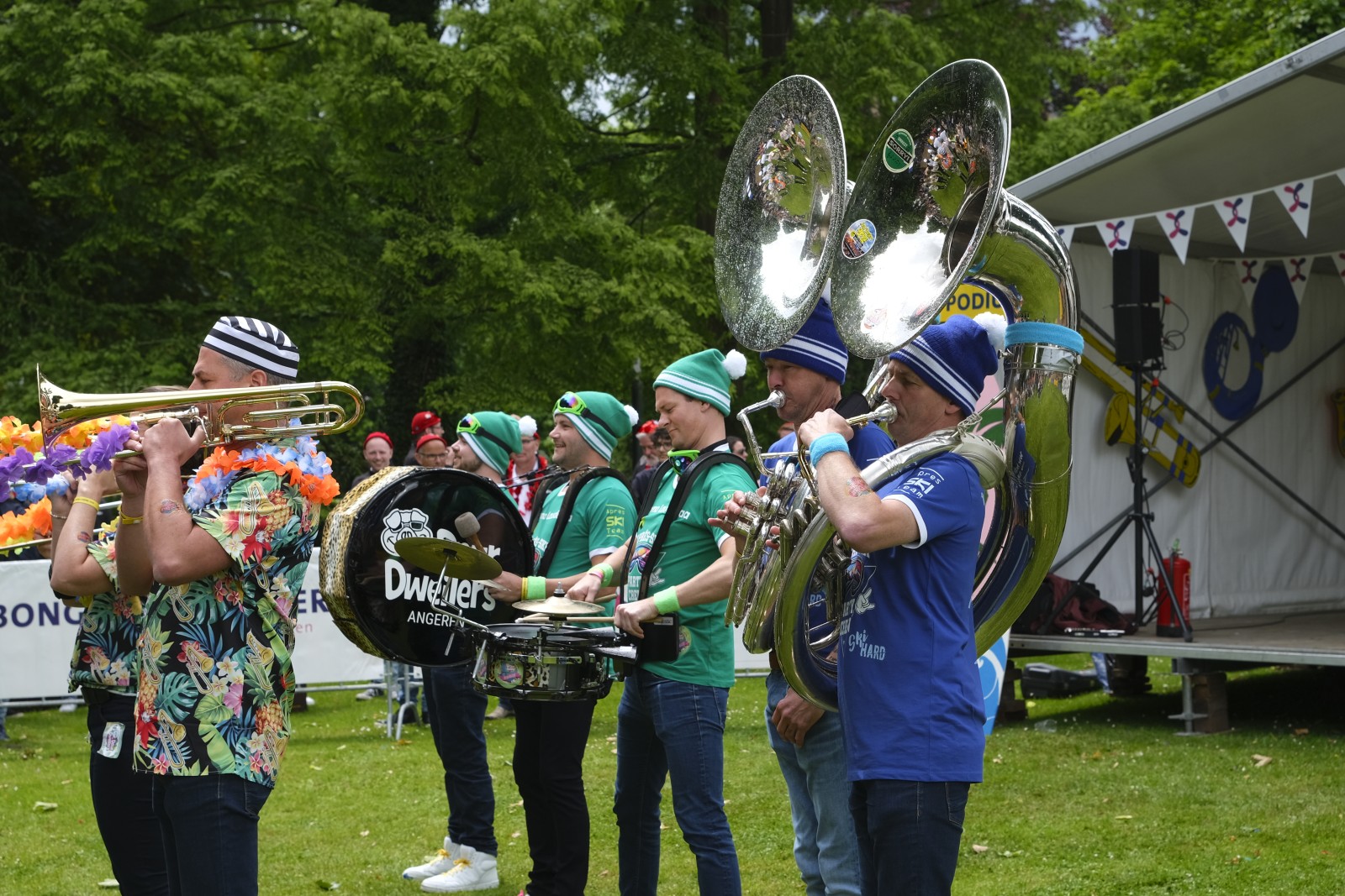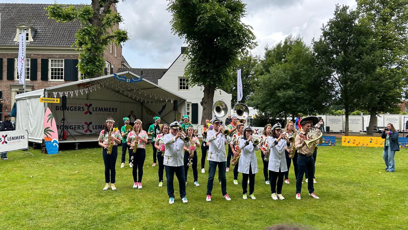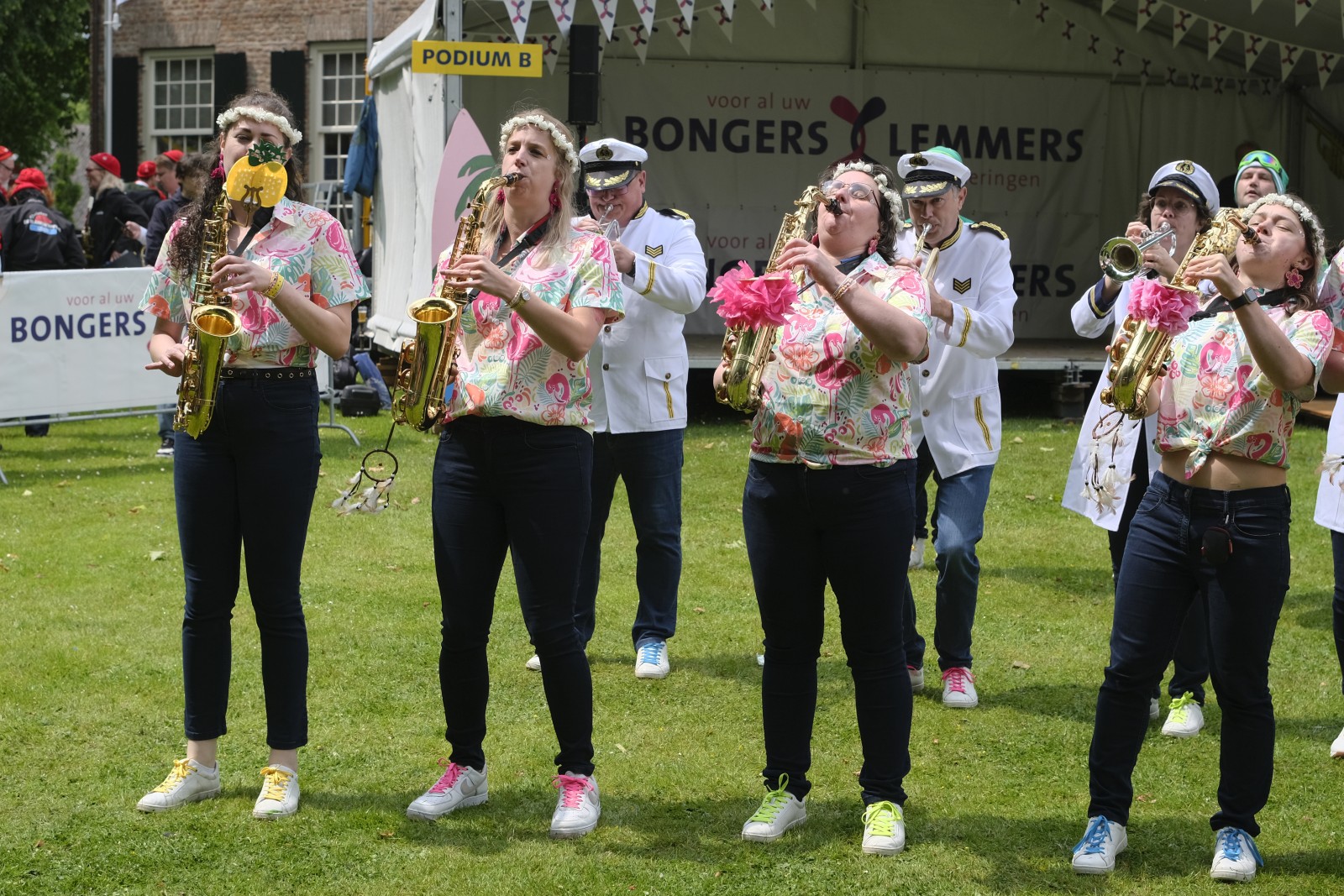 Het leek wel of de organisatie met dit “tropische dweilfiesta” thema de weergoden gejinxt had, want het hele weekend viel er aardig wat regen. Wat hadden wij geluk dat we 4x droog konden spelen. Dan zag je dat de Bemmelse straten direct weer vol liepen en we toch weer voor veel publiek konden spelen. Heerlijk!