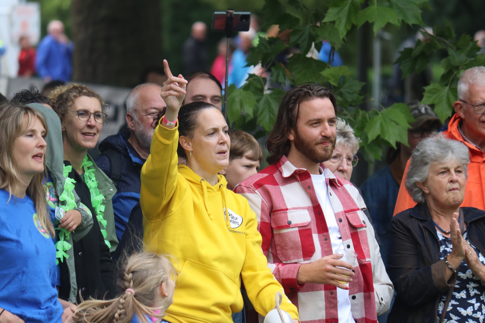 Nadat we even de Feintsjes gingen kijken ging het regenen bij het hoofdpodium net toen Ut Word Wa uit Cuijk ging spelen. Dit was een orkest uit de leutklasse dus mochten we het jurypodium gebruiken om te schuilen en toch mee te kunnen zingen. Hopelijk de laatste bui van de dag!