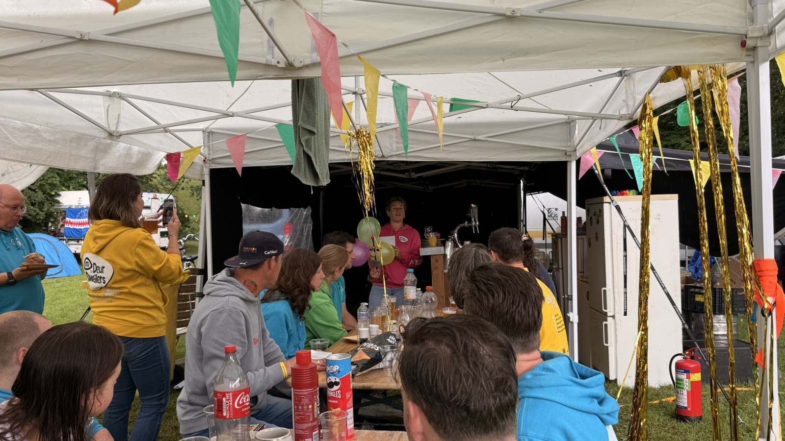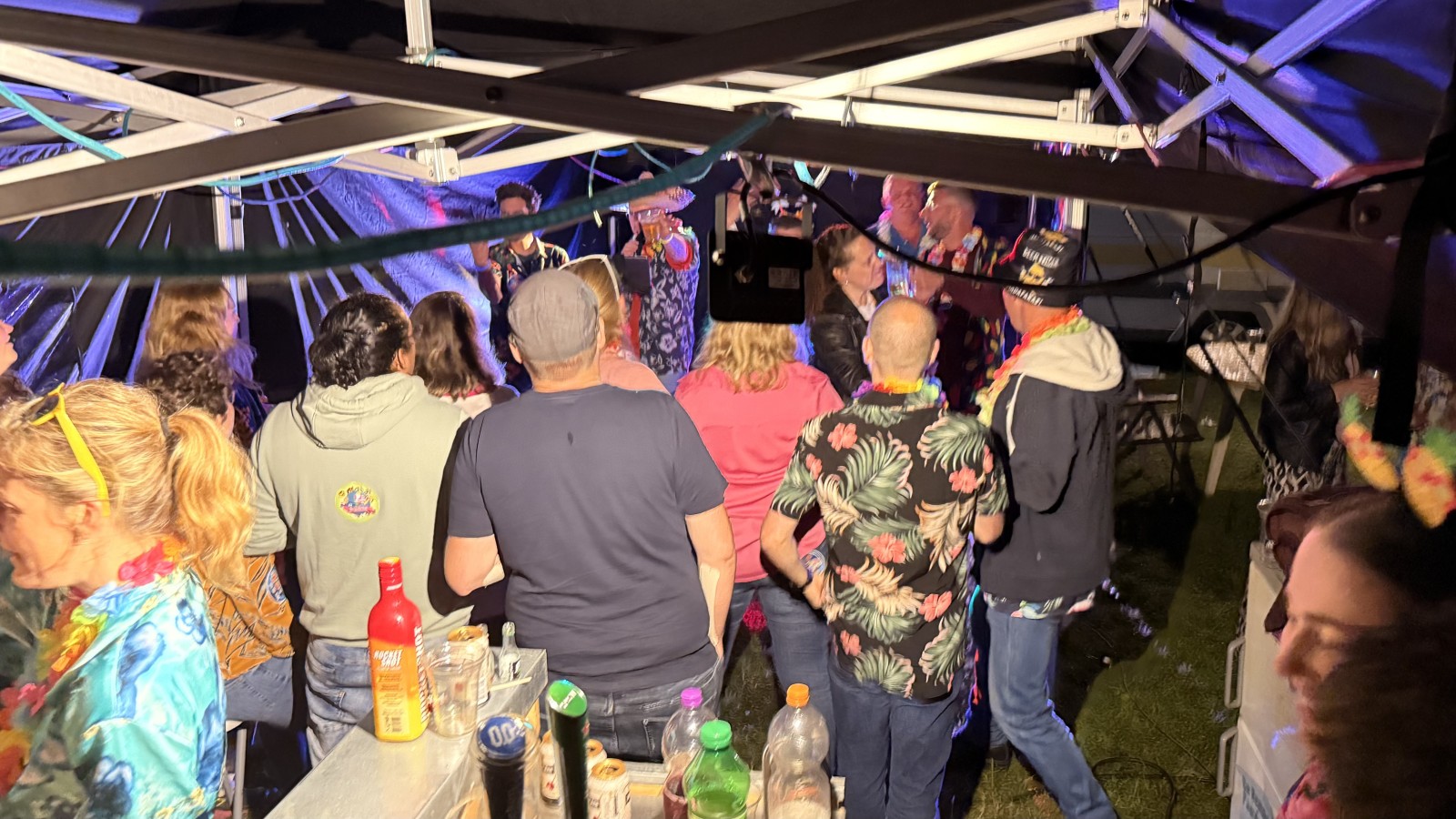 Omdat ook glaswerk niet meer mocht volgens de vergunning hadden we samen met Alarmfase3 en De Feintsjes een tapinstallatie gehuurd en alle partytenten bij elkaar gezet om zo droog buiten te kunnen zitten. Er was immers wel wat regen voorspeld. En zo werd het een gezellige vrijdagavond waar ook nog ruimte was voor Karaoke en een heuse ‘voorwerpen bingo’.