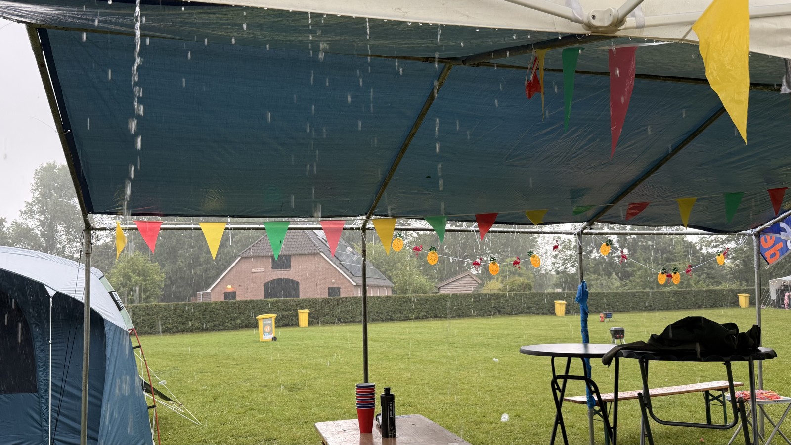 Zondagochtend zag het weer er ook prima uit! Wat nou regenachtige dag? We staan lekker in de zon een beetje in te spelen op de camping in onze nieuwe outfits. Maar achter de sporthal verscheen ineens een donkere lucht wat ons besloot om nog even op de camping te wachten. En dat was maar goed ook, want daar was de eerste fikse bui van de dag. Maar na 10 minuten waren we good to go. Bemmel here we come!
