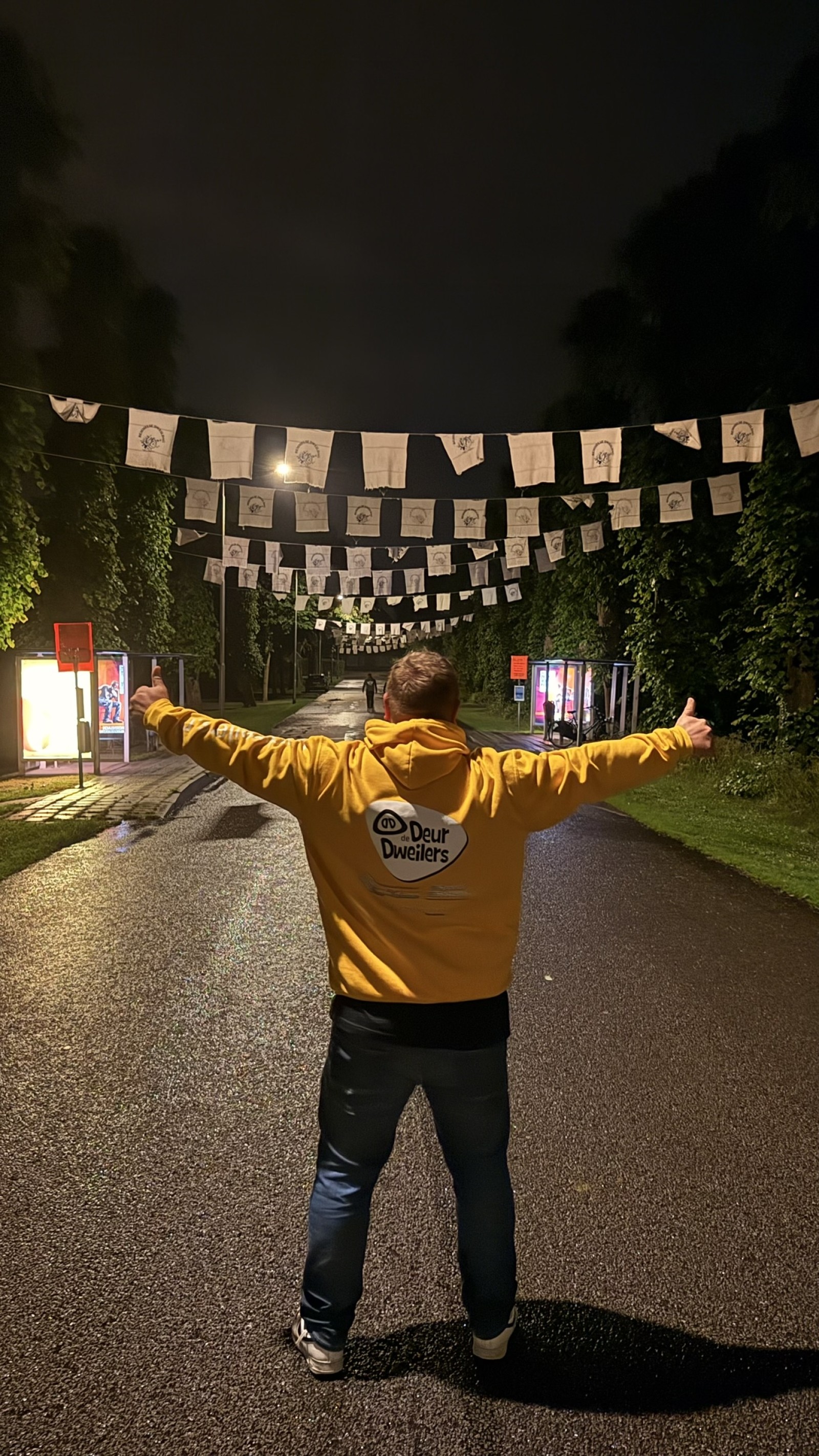 Na deze vrije tijd werd het gelukkig weer droog en trokken we het centrum in. Daar waren de meeste vrijwilligers bijna klaar met het opbouwen dus konden we ze daar nog even voorzien van een lekker setje muziek. Voor ons ook een soort van ‘generale repetitie’ bij een echt podium. Even alvast de setting van de zondag uitproberen. Het gevoel over ons setje wordt steeds beter!