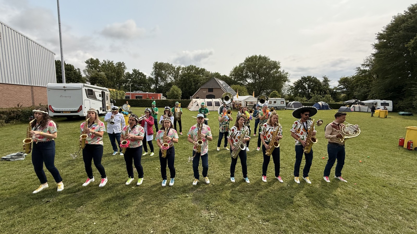 The day after. De zaterdag werd iedereen langzaam wakker onder het genot van een heerlijk gebakken eitje van onze eigen chef-kok Andre. Terwijl Alarmfase3 in het centrum ging opbouwen en de Feintsjes gingen bowlen, stond er bij ons een repetitie op de planning om nog wat puntjes op de i te zetten. Het was nog steeds droog, dus de hele show kon buiten op de camping gerepeteerd worden. Lenny moest nog snel naar Brugman Muziek in Gaanderen om de sax te repareren. Gelukkig kon dit direct verholpen worden en ze kwam zowaar terug zonder nieuw instrument. Goed dat Youri niet mee was.