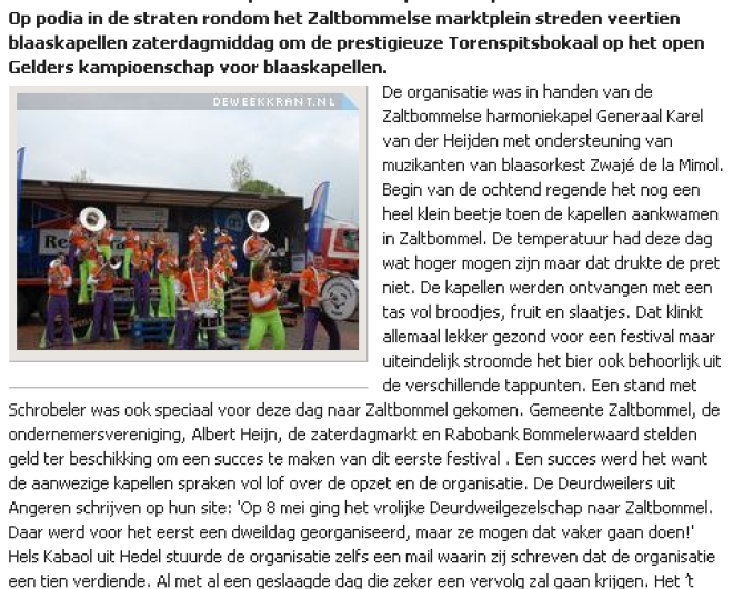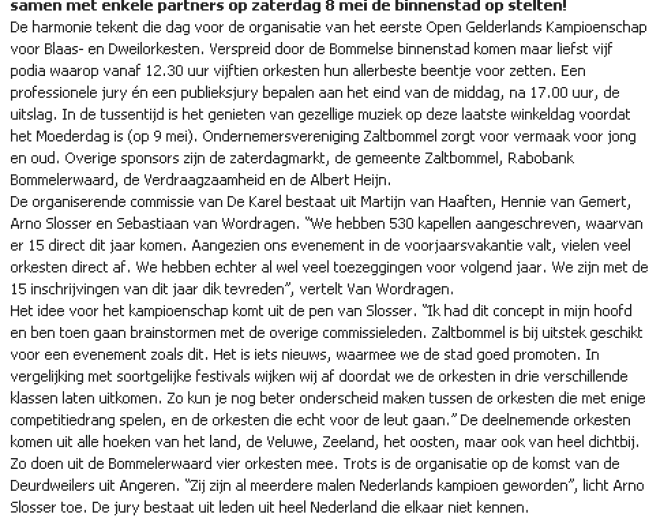 Ondanks de frisse temperatuur deden we toch de jassen uit en in een poging om de instrumenten warm te krijgen nog snel even een nummertje gespeeld. Toen was het aftellen tot we mochten beginnen. Het Zaltbommelse publiek was waarschijnlijk op de markt, dus slechts een klein handje vol toeschouwers stond naar ons optreden te kijken. Ai, één nummer ging wel errug fout, althans, je hoorde gewoon 8 maten geen melodie 🙂