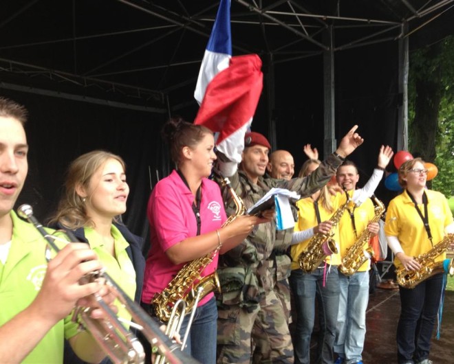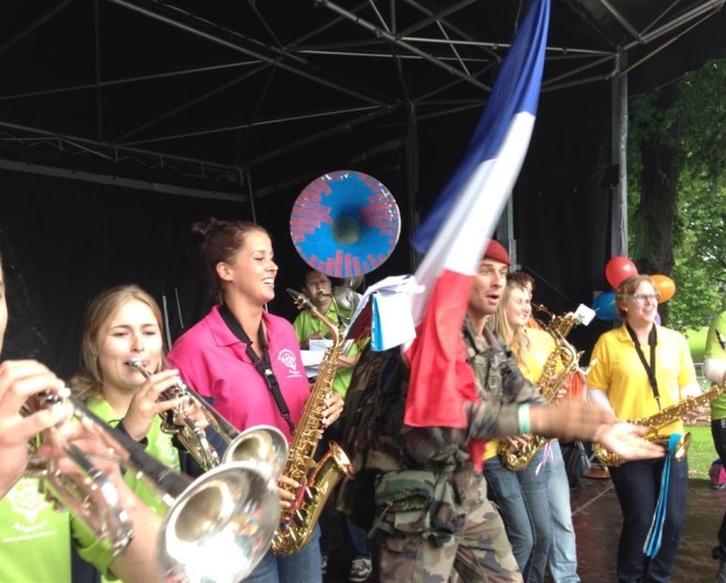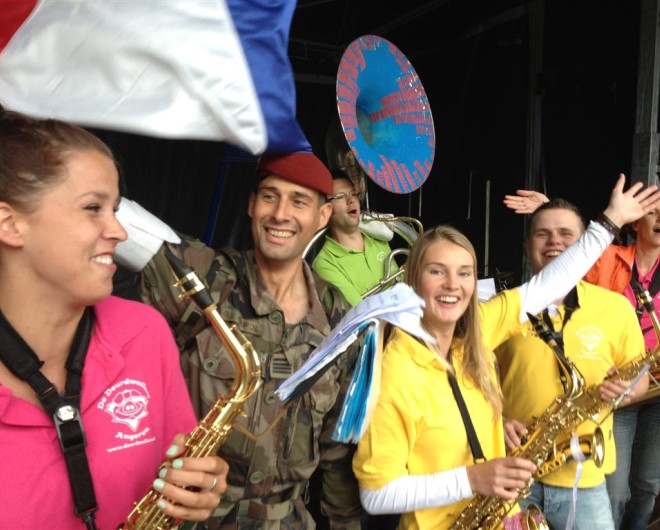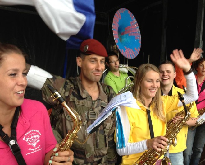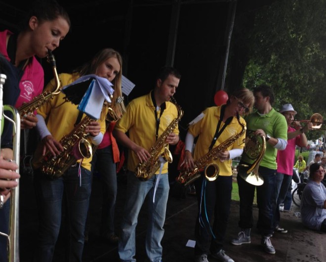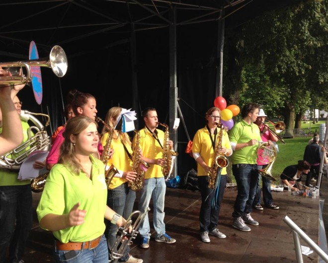 Terwijl de burgemeester en ander gemeentepersoneel flesjes water uitdeelden aan de wandelaars speelden wij afwisselend met de Zwabberbent op het podium.